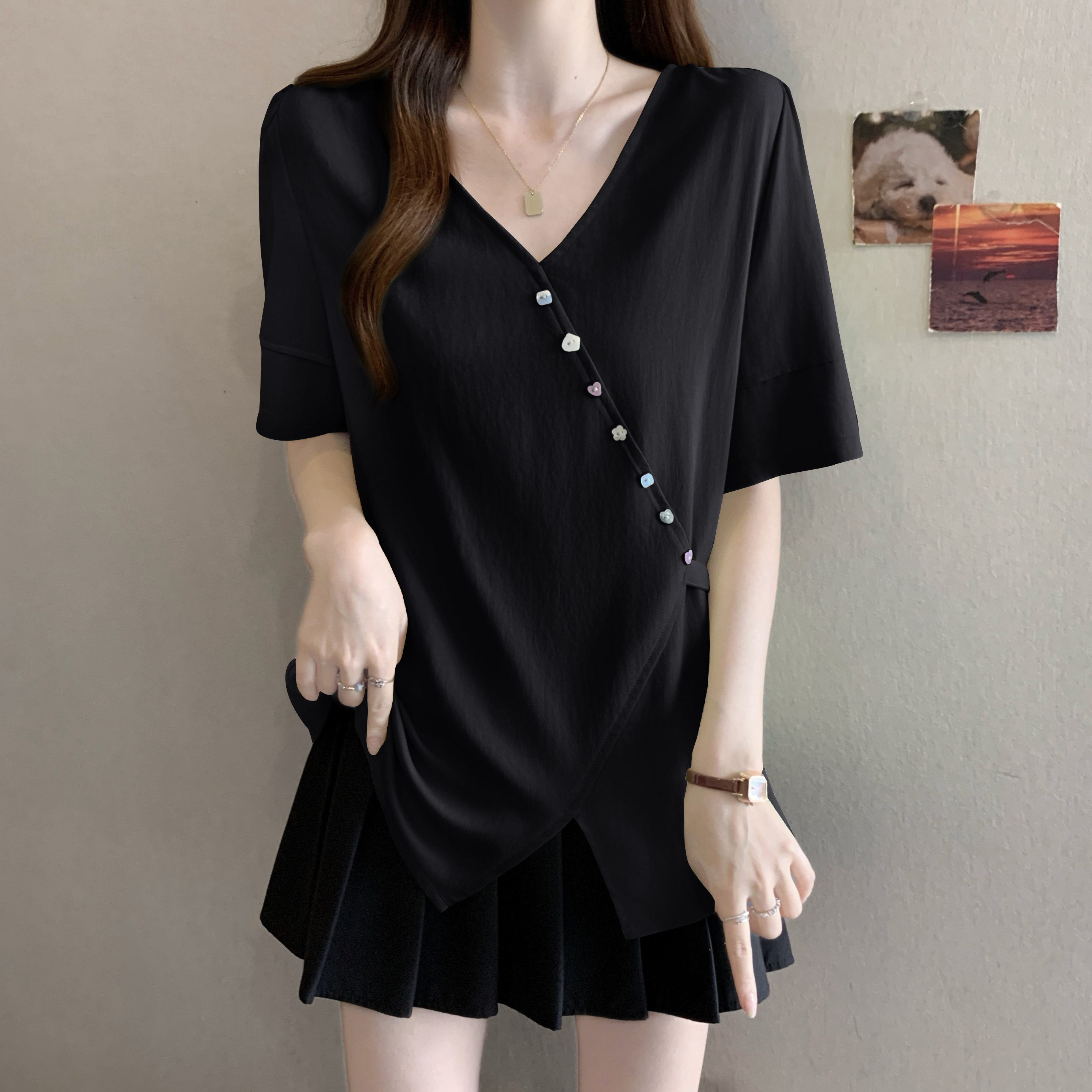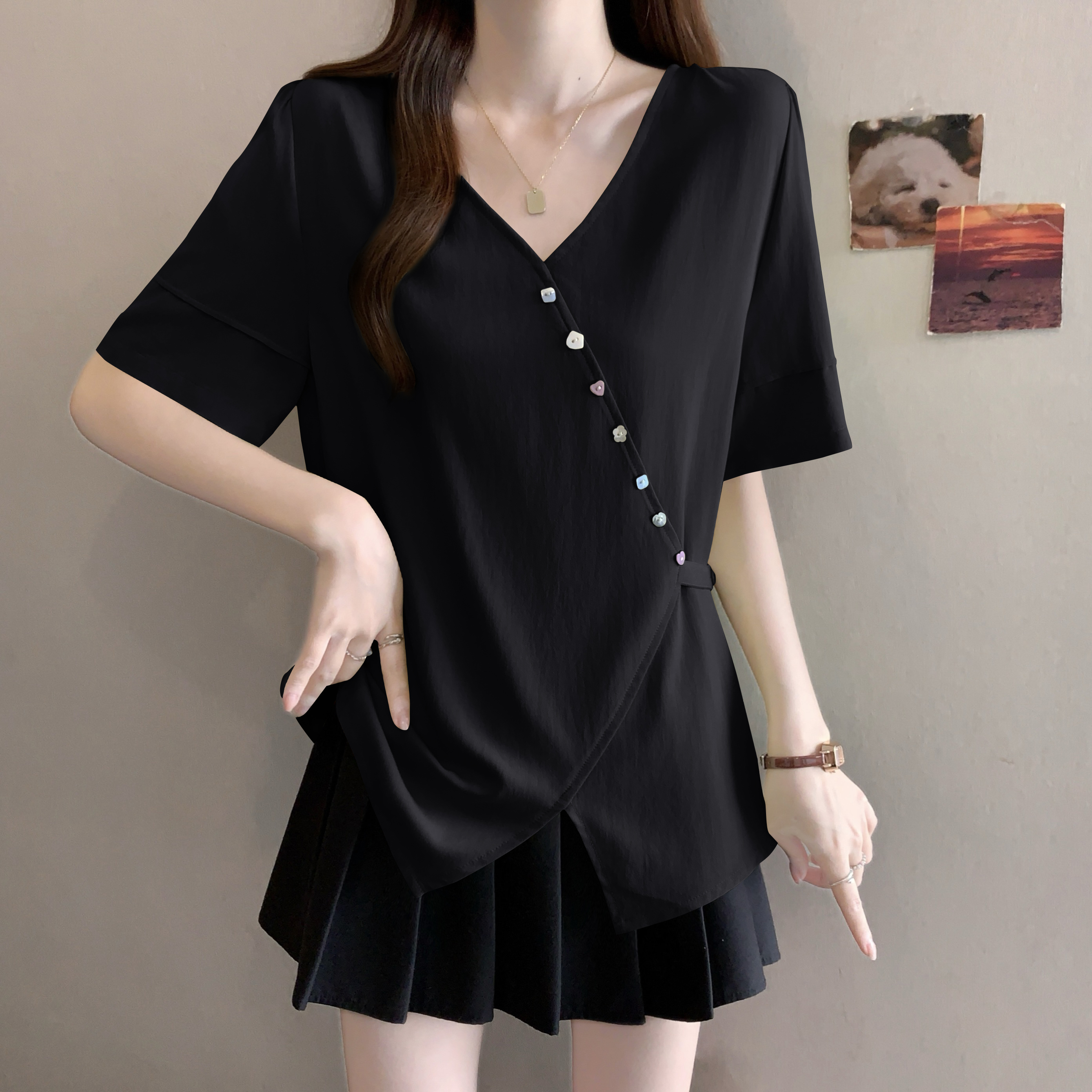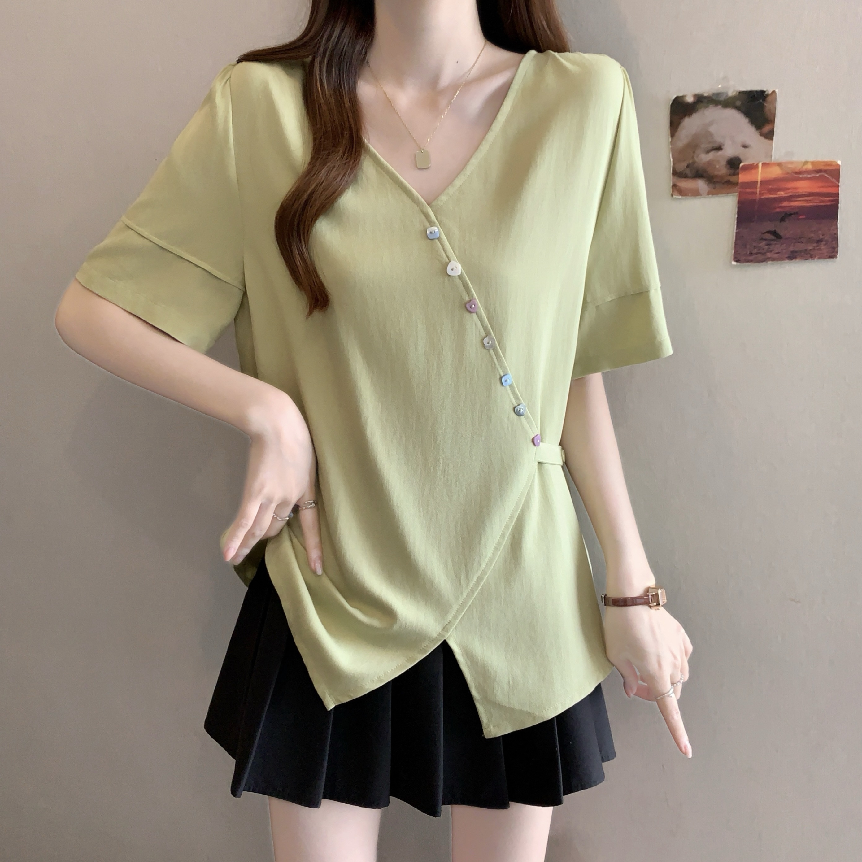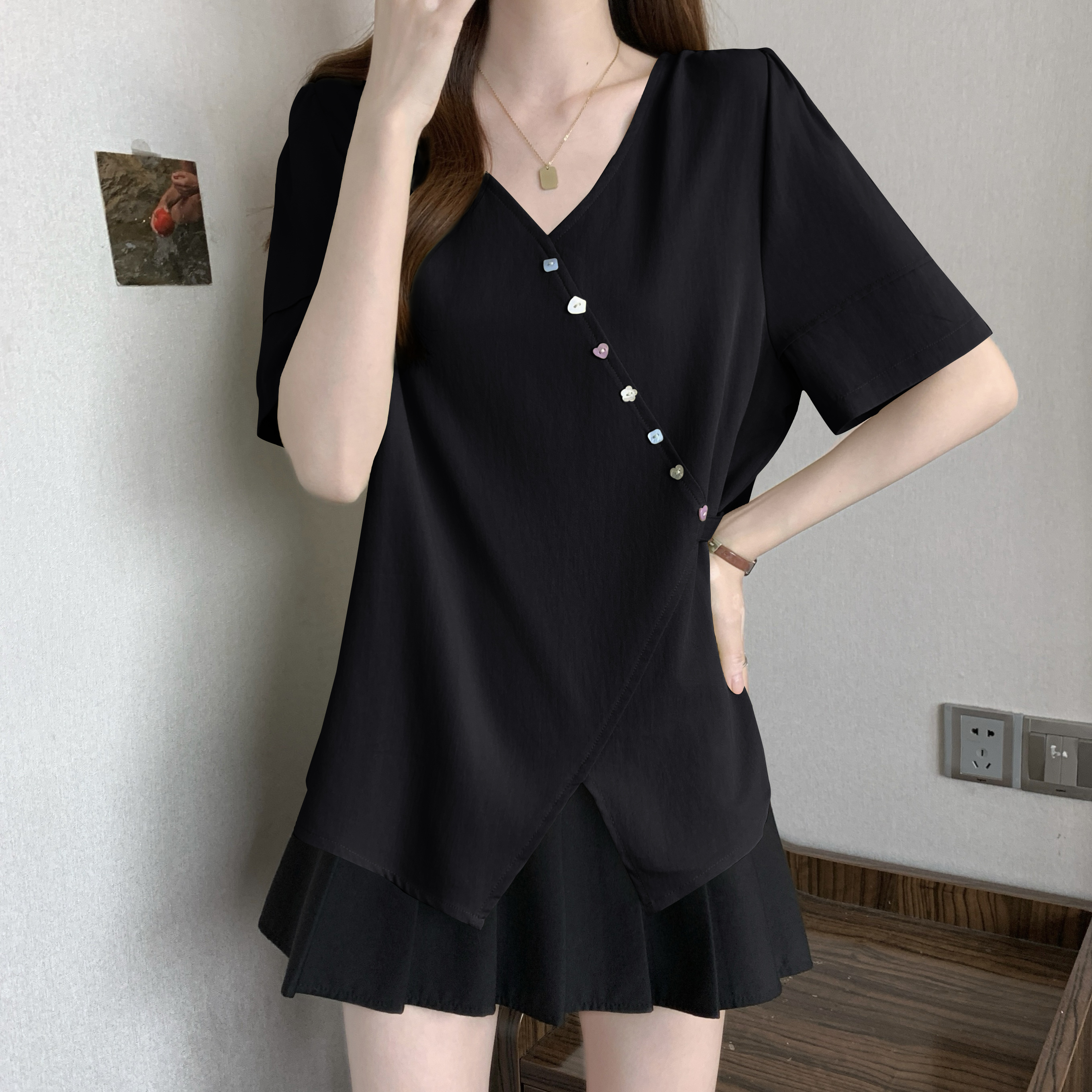실사 빅 사이즈 새로운 디자인 센스 불규칙 긍정적 인 어깨 지방 mm 표지 고기 슬림해 보이는 패션 반팔 티셔츠 여성