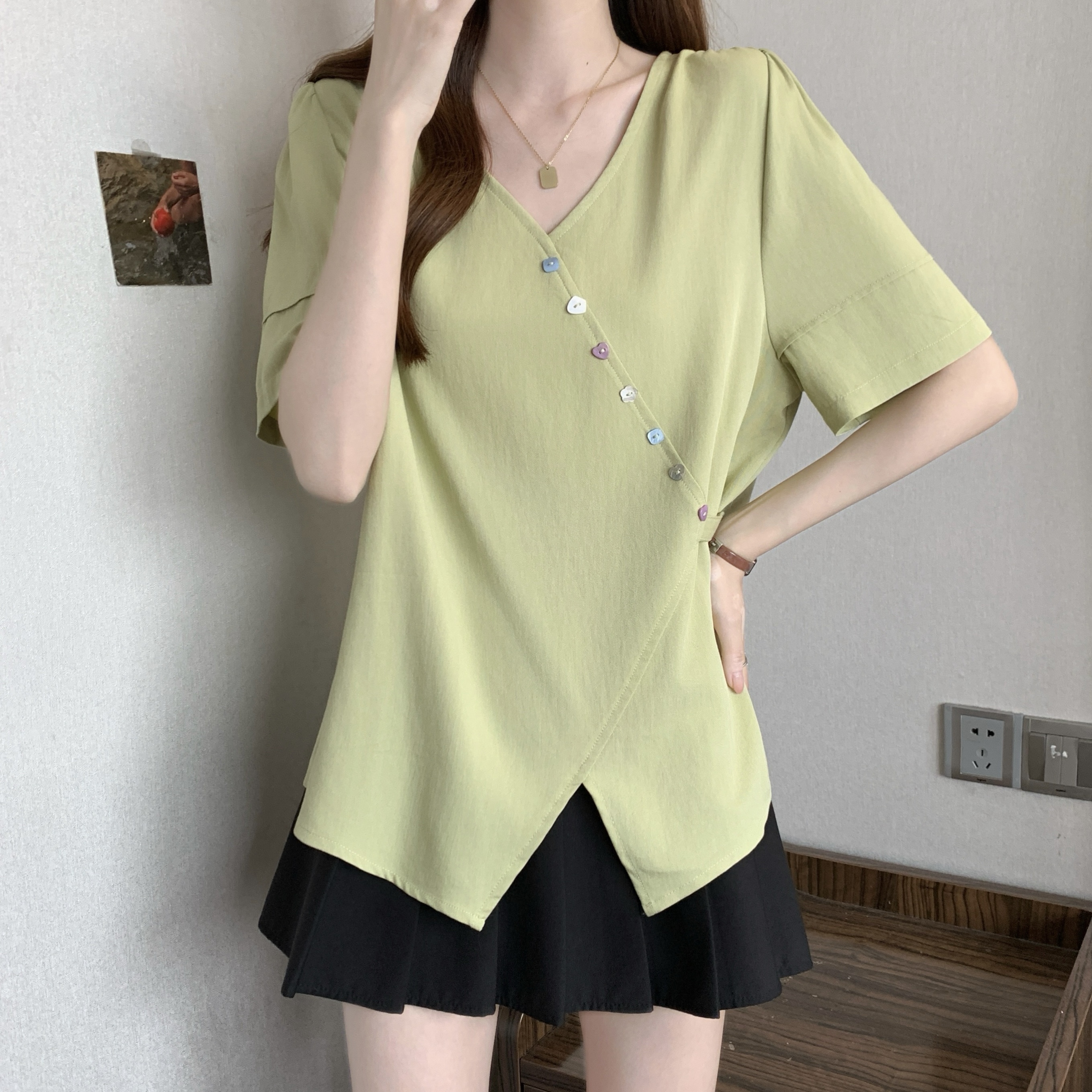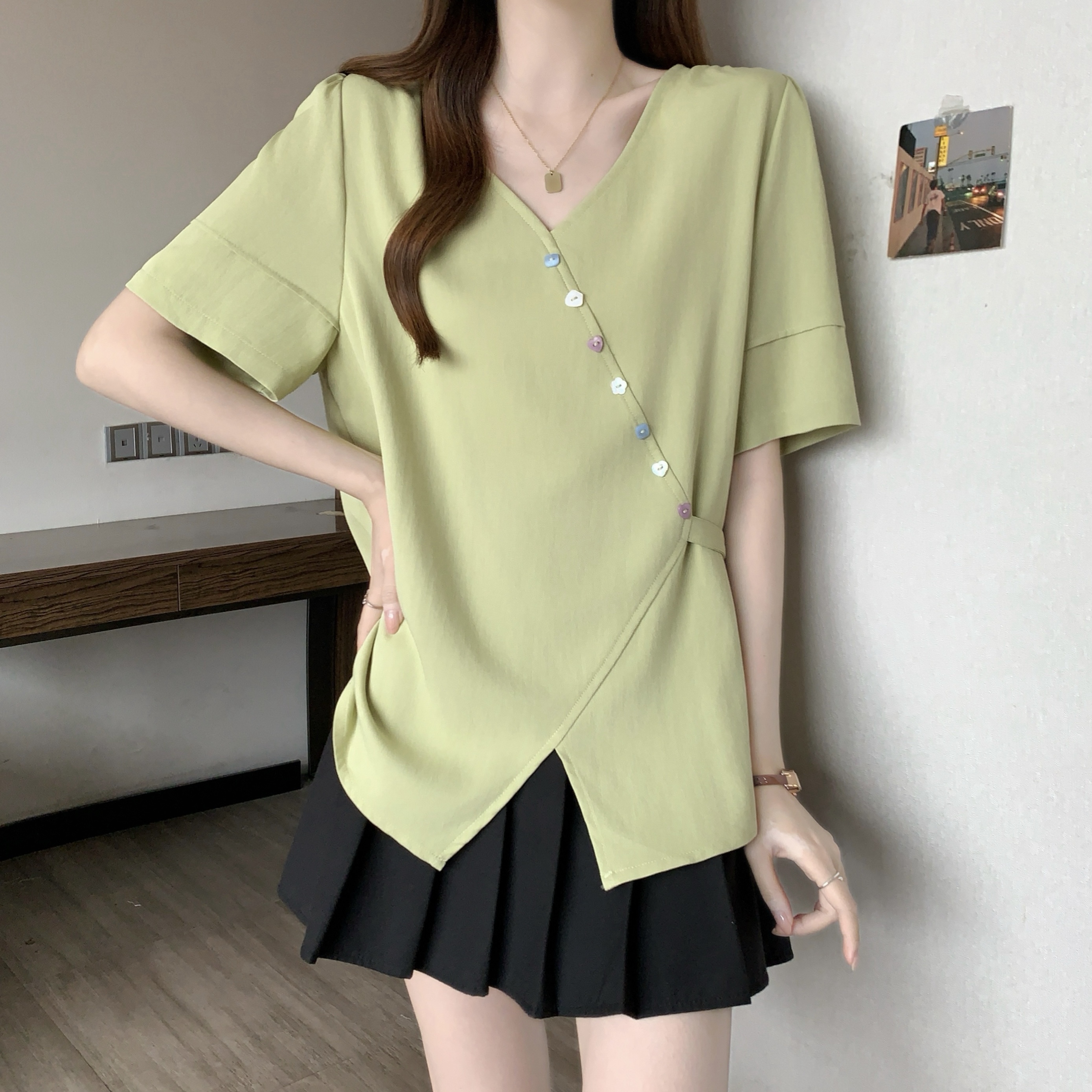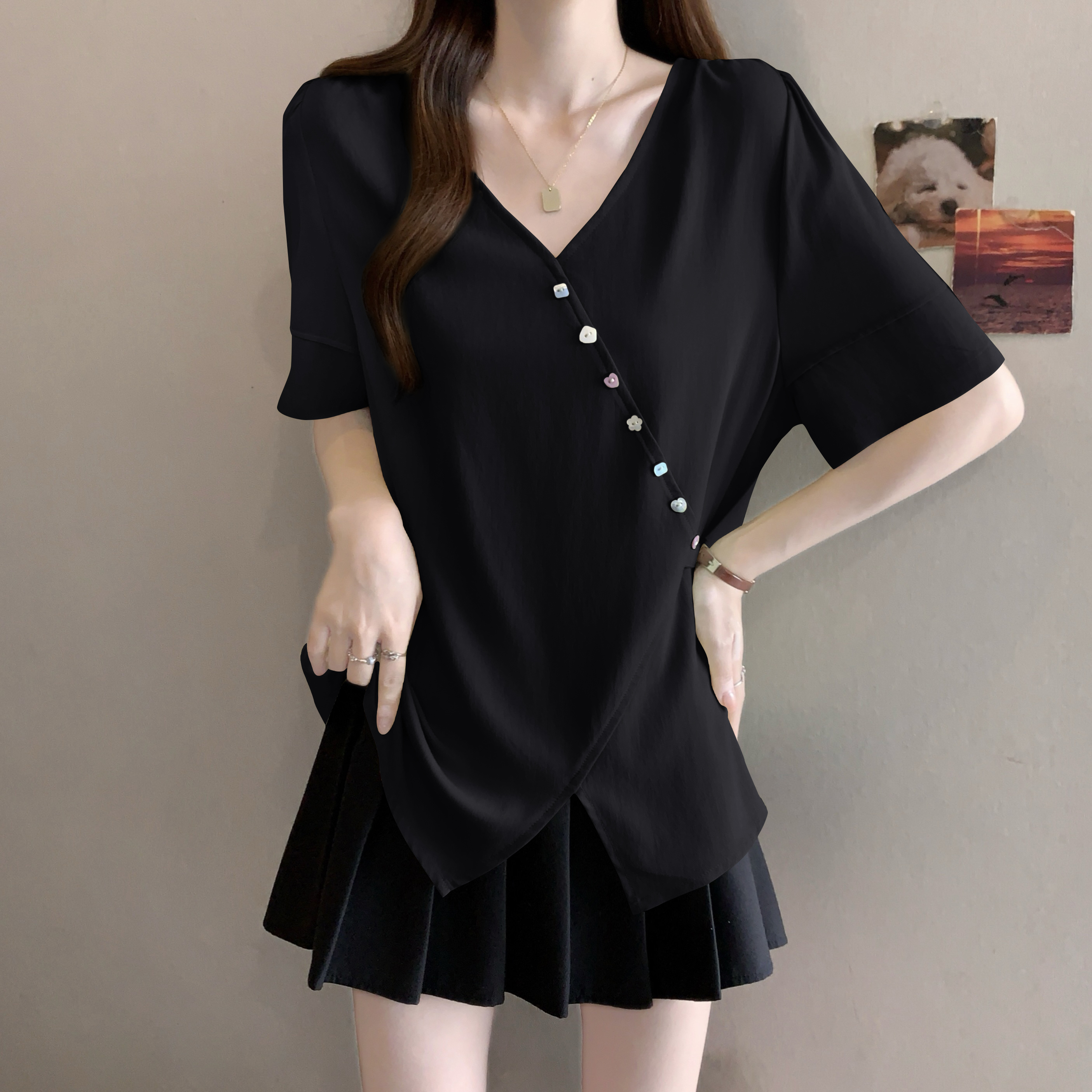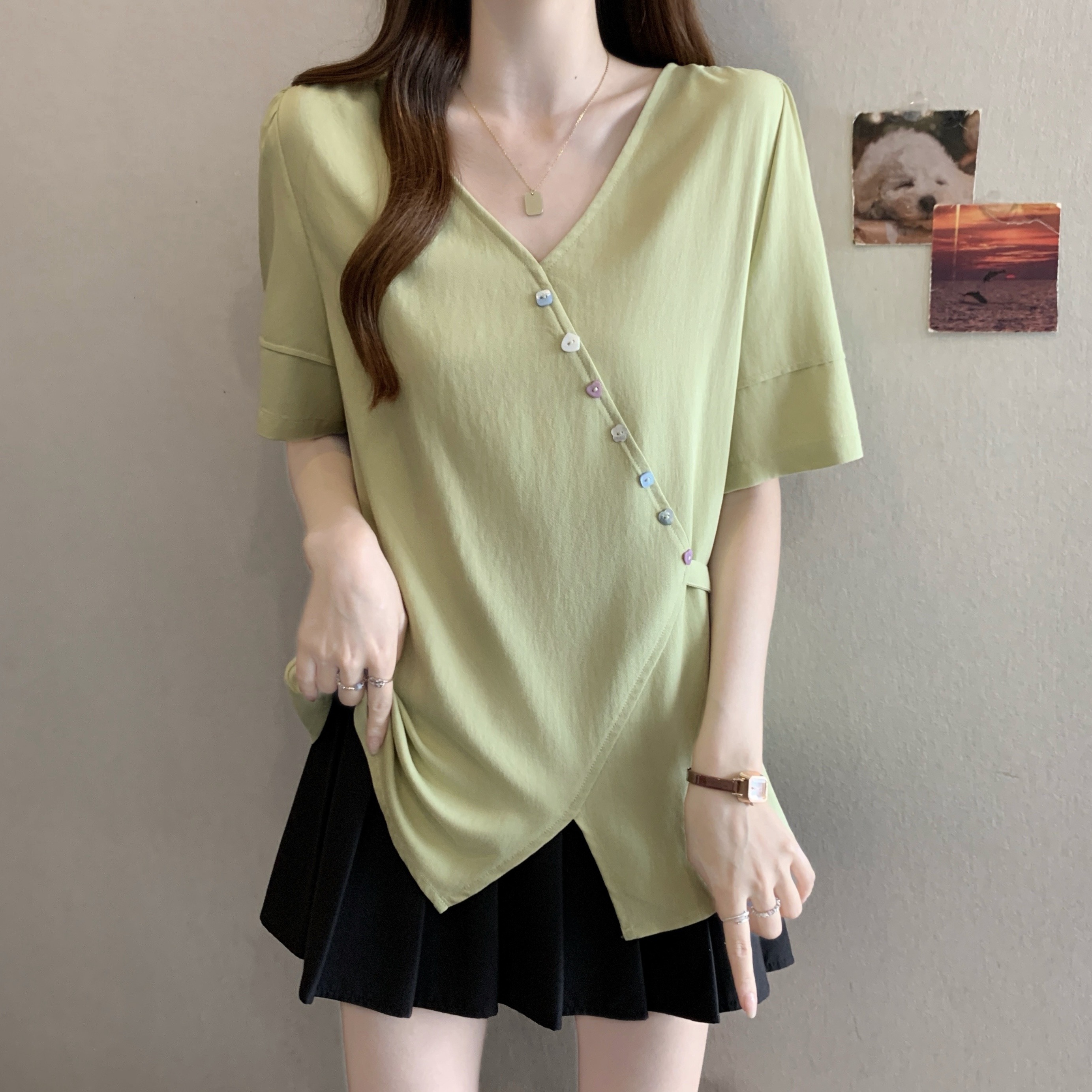 실사 빅 사이즈 새로운 디자인 센스 불규칙 긍정적 인 어깨 지방 mm 표지 고기 슬림해 보이는 패션 반팔 티셔츠 여성