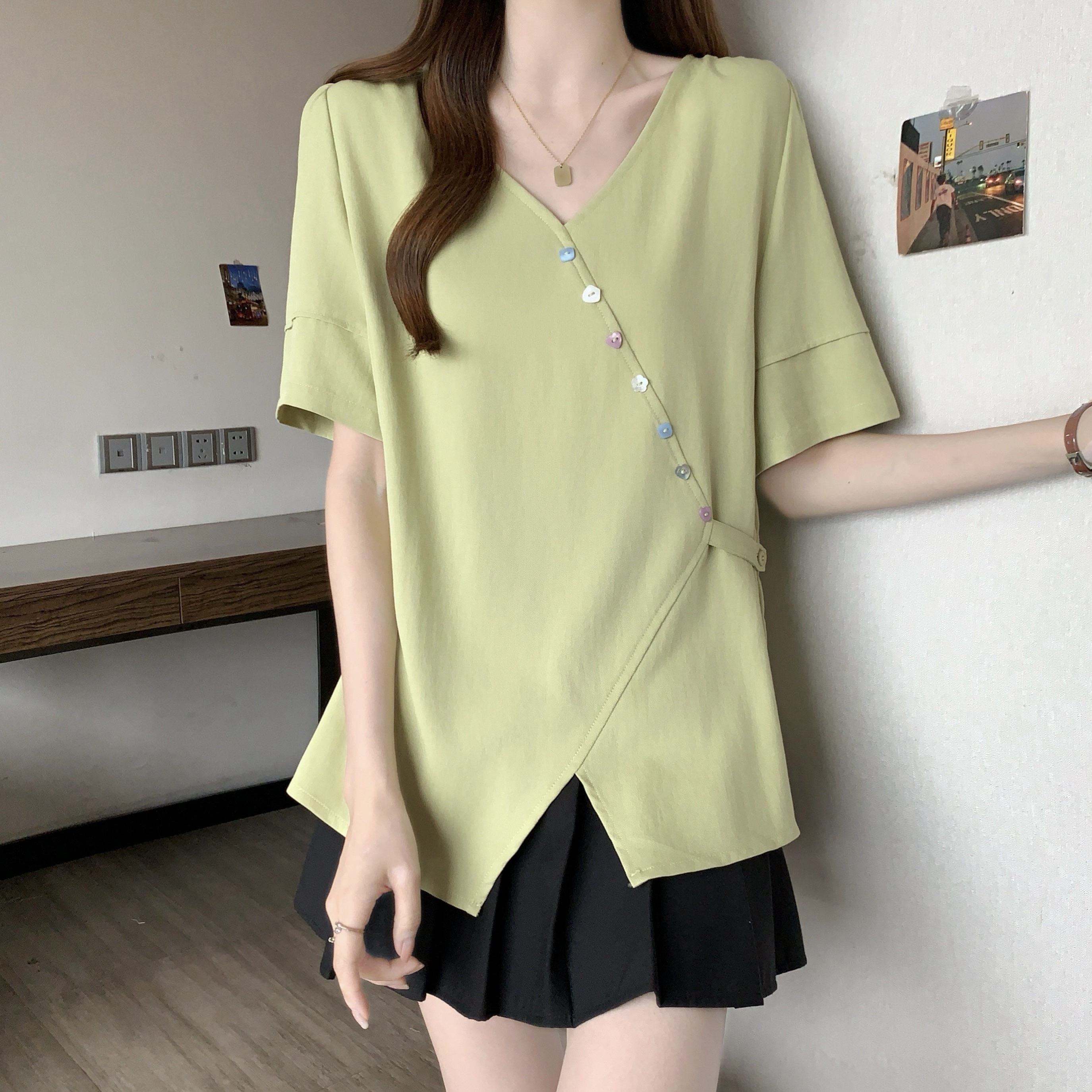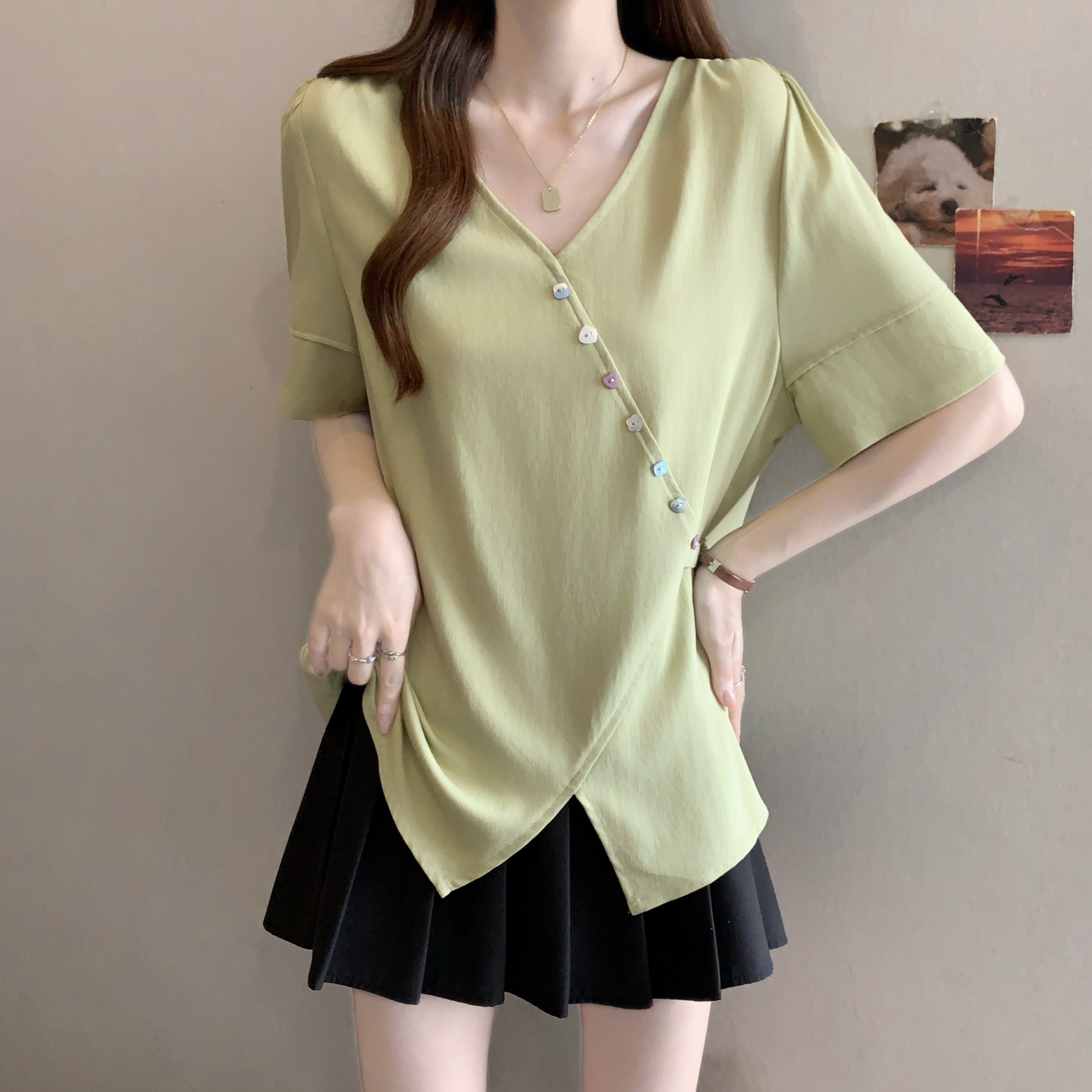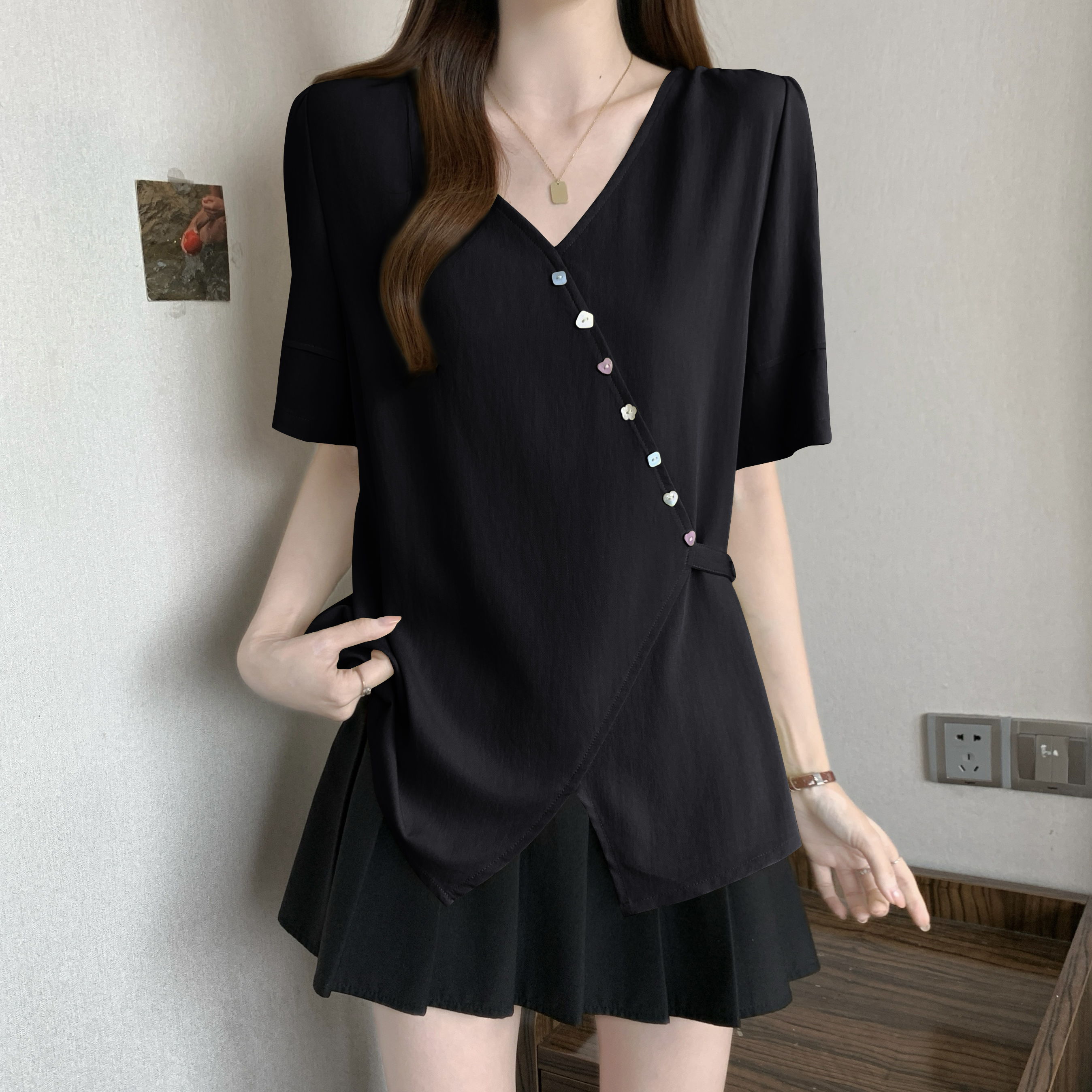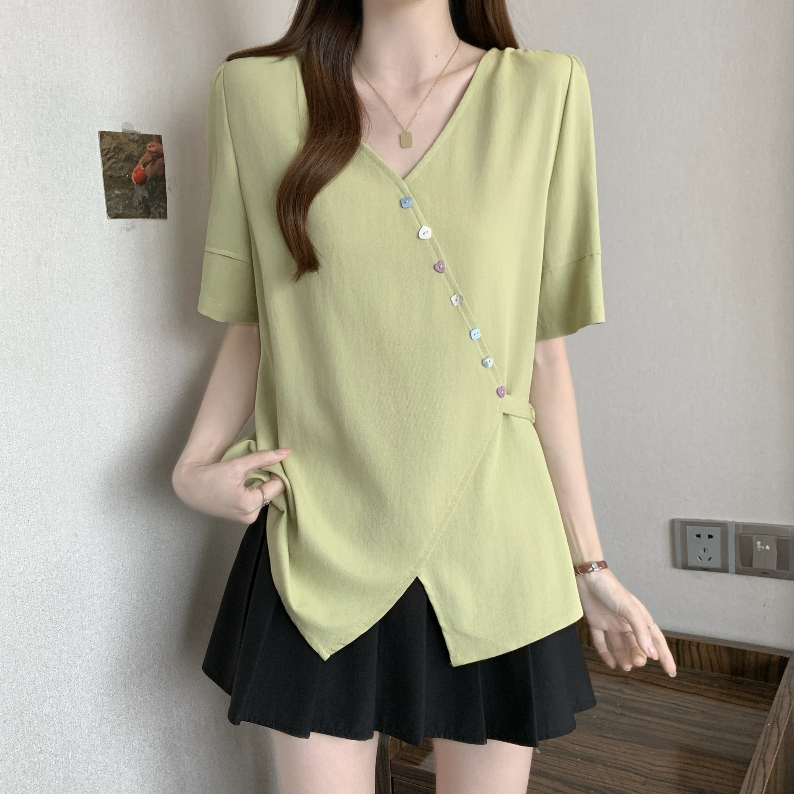 실사 빅 사이즈 새로운 디자인 센스 불규칙 긍정적 인 어깨 지방 mm 표지 고기 슬림해 보이는 패션 반팔 티셔츠 여성