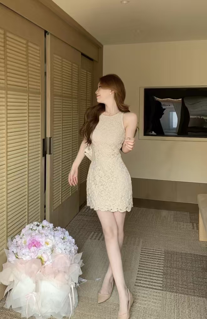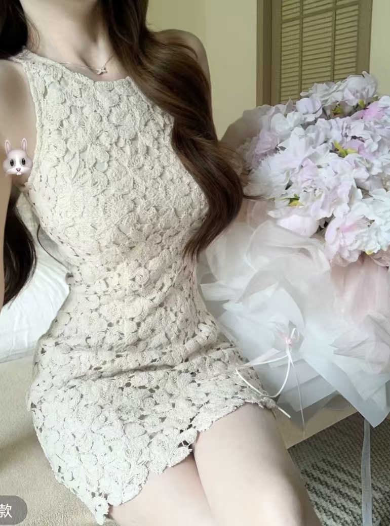 꽃 객실 주리예 줄려엽 여름 새로운 부드러운 품격 홀로우 아웃 레이스 민소매 쇼트 스타일 드레스