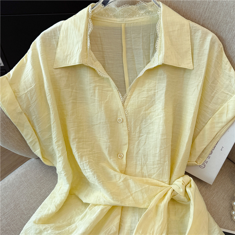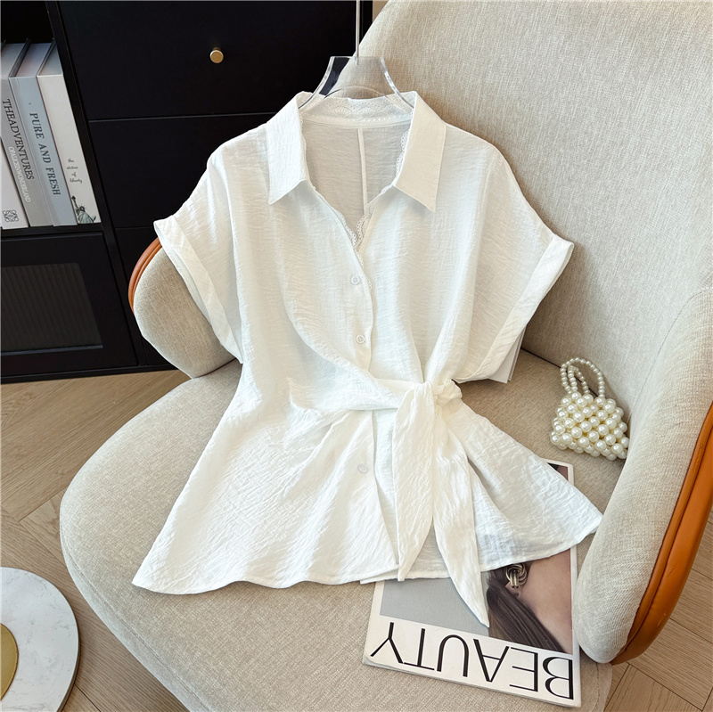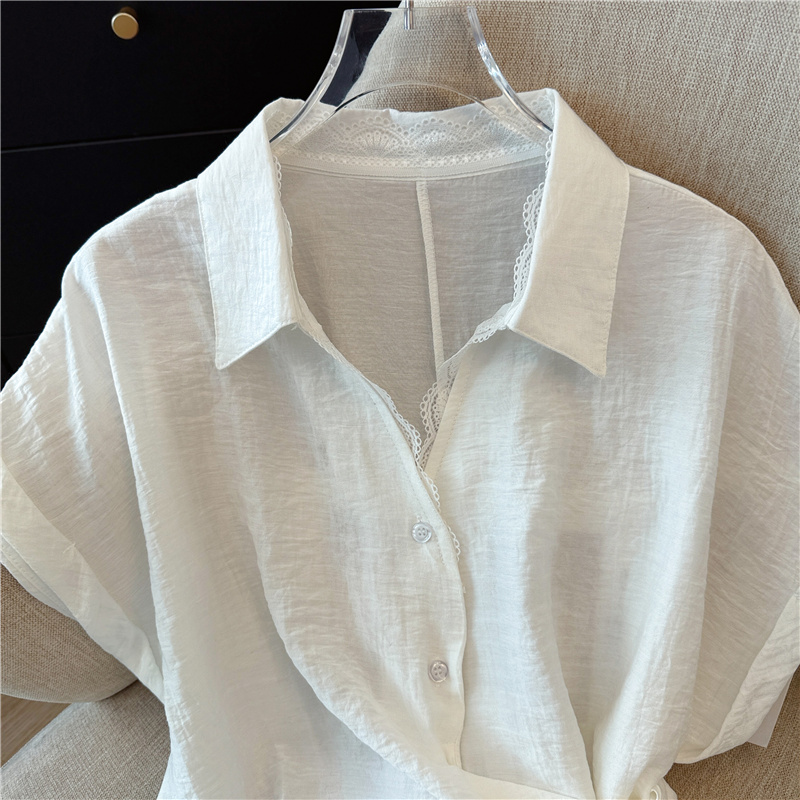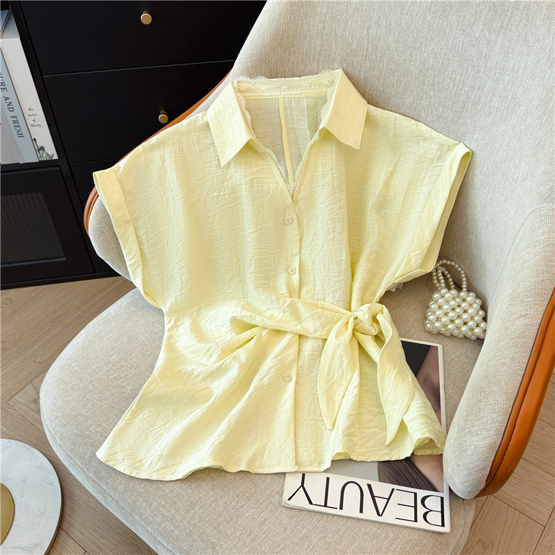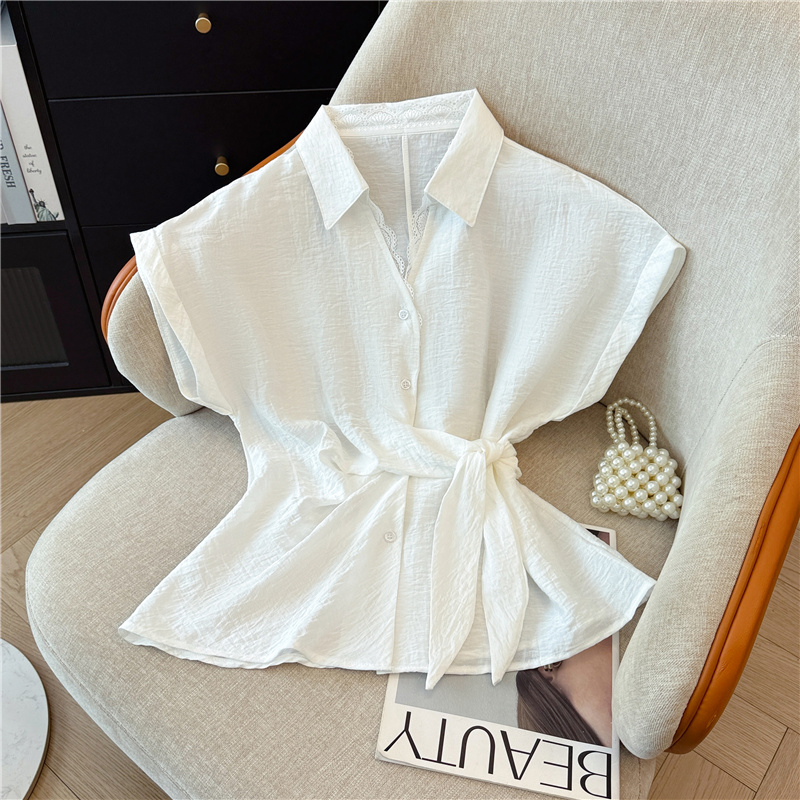 레이스 조각 V넥 반팔 만나는 여성 셔츠 2026 여름 고급 센스 레이스업 허리 수축 슬림해 보이는 맨위