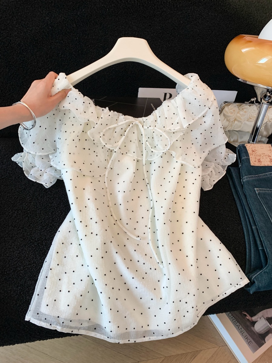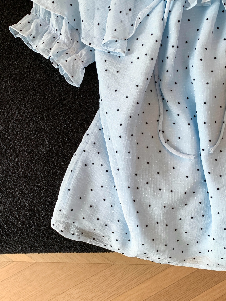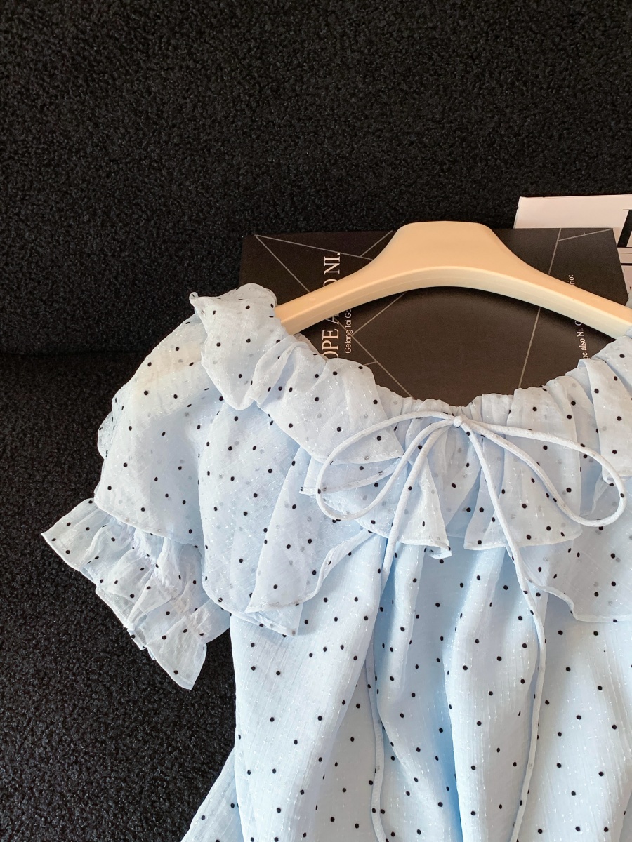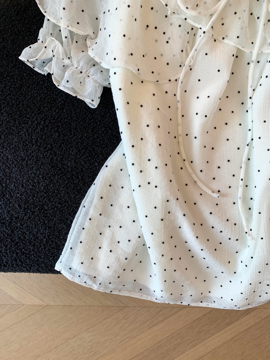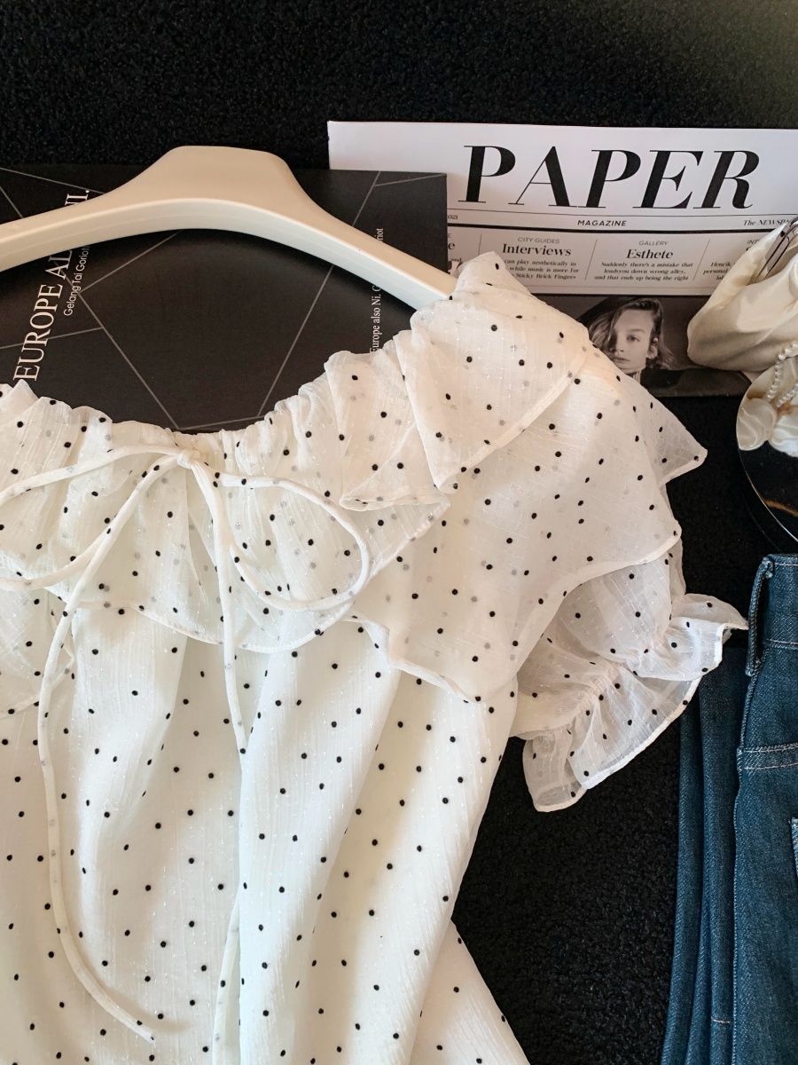 한 부서 페이크 레이어드 도트 무늬 반팔 셔츠 여성 여름 루즈핏 다용도 부드러운 바람이 아닙니다. 규칙 밑단 인형 맨위