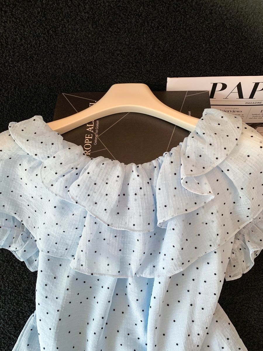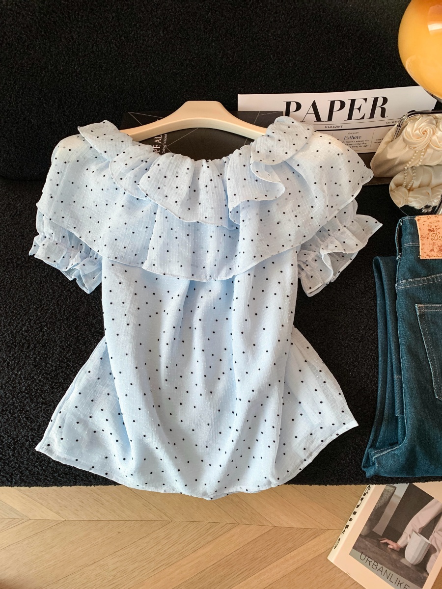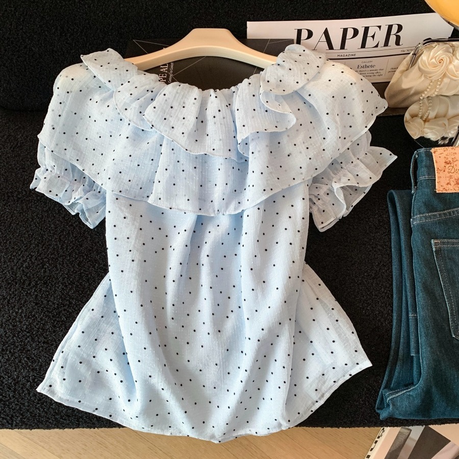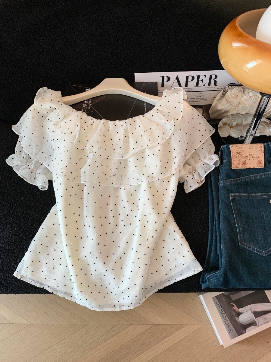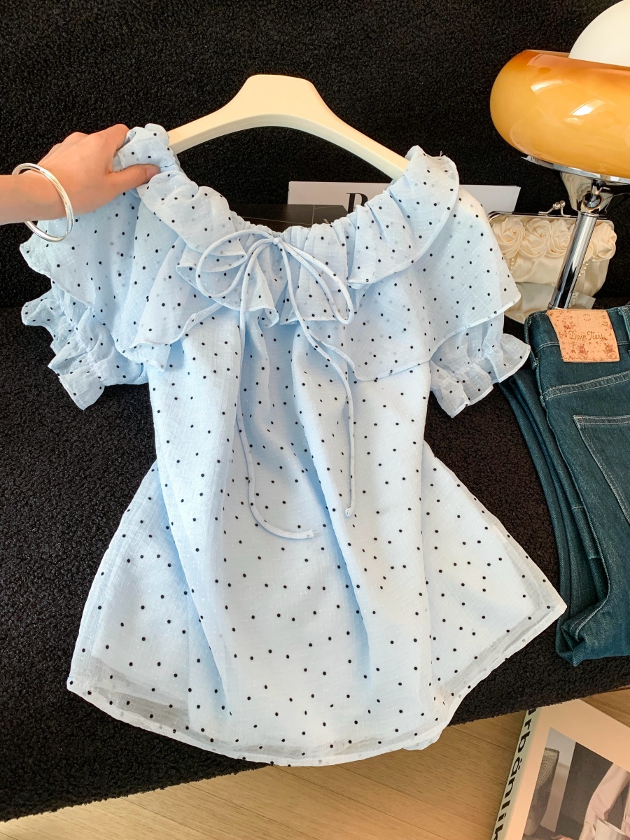 한 부서 페이크 레이어드 도트 무늬 반팔 셔츠 여성 여름 루즈핏 다용도 부드러운 바람이 아닙니다. 규칙 밑단 인형 맨위