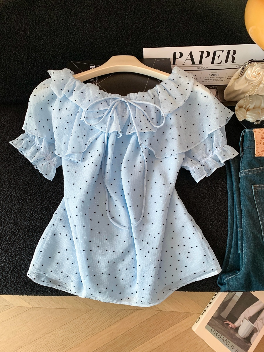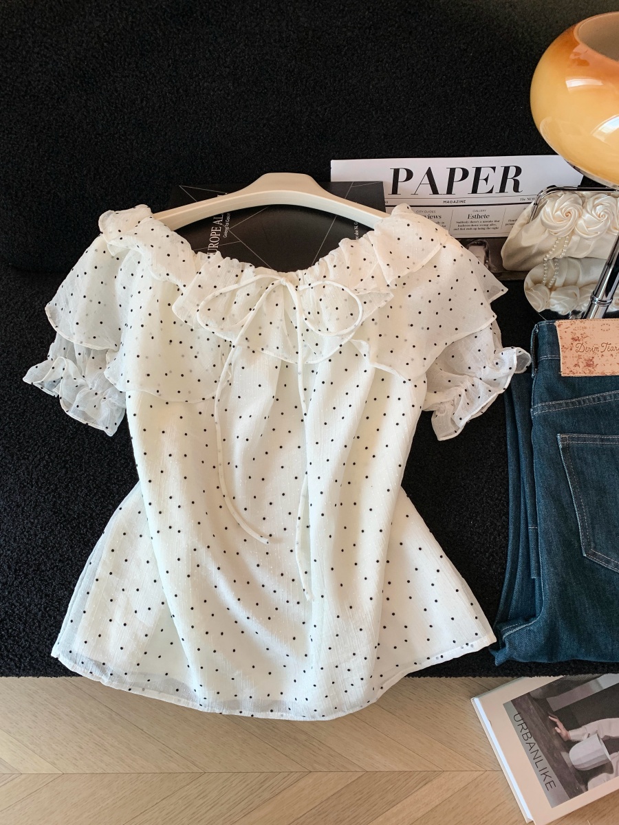 프랑스식 프릴 패치워크 레이스업 거품 소매 반팔 맨위 여성 연령 감소 슬림해 보이는 표지 배 디자인 센스 셔츠