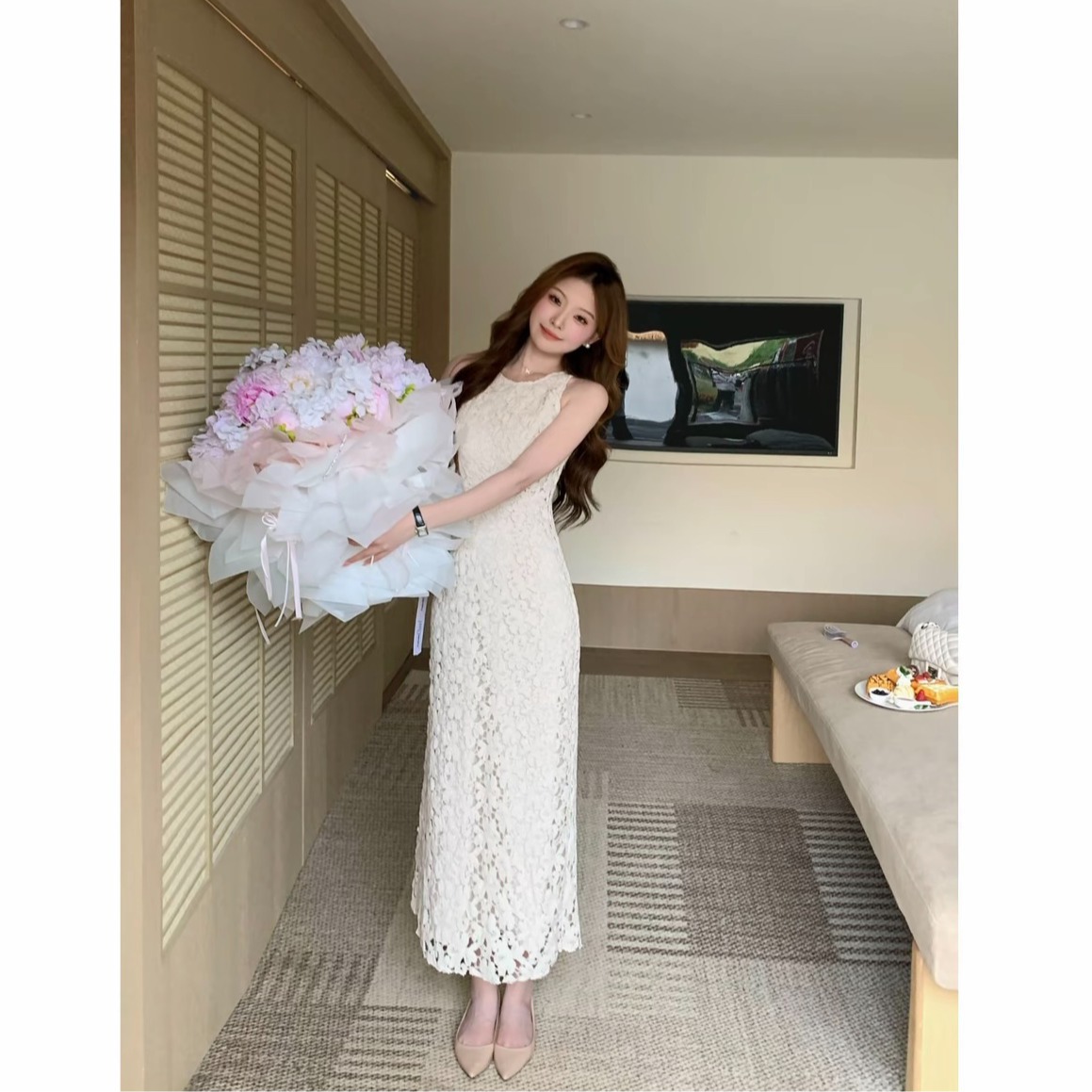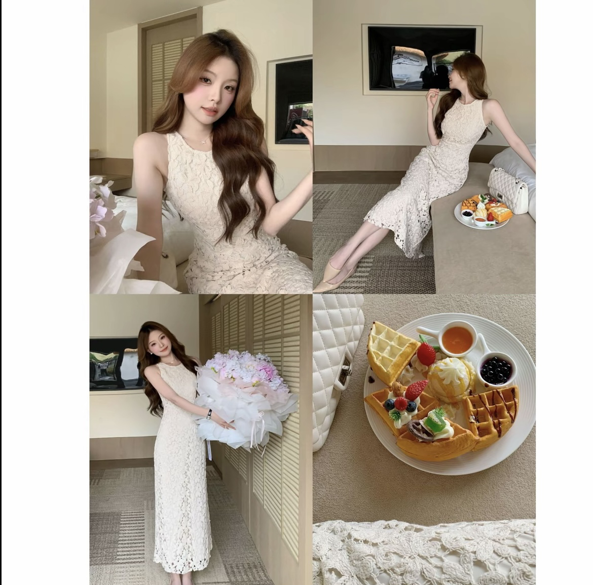 sza 꽃 객실 주리예 줄려엽 여름 새로운 부드러운 품격 홀로우 아웃 레이스 민소매 쇼트 스타일 드레스