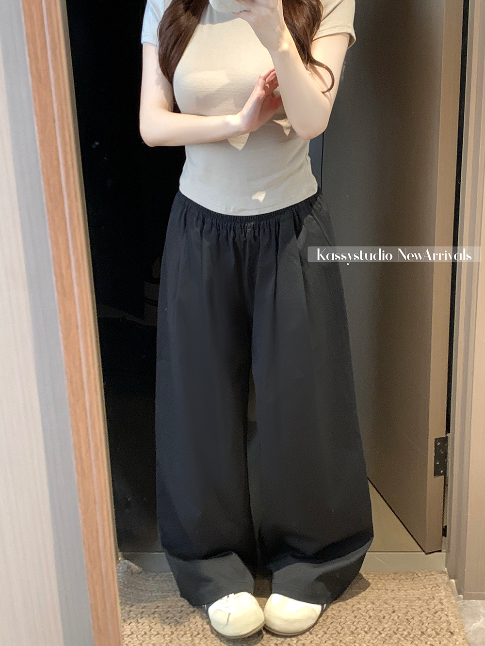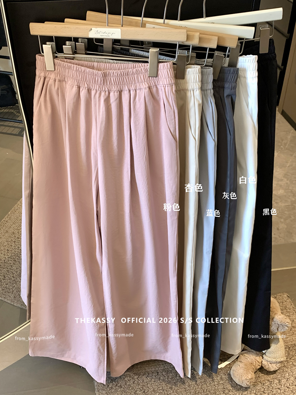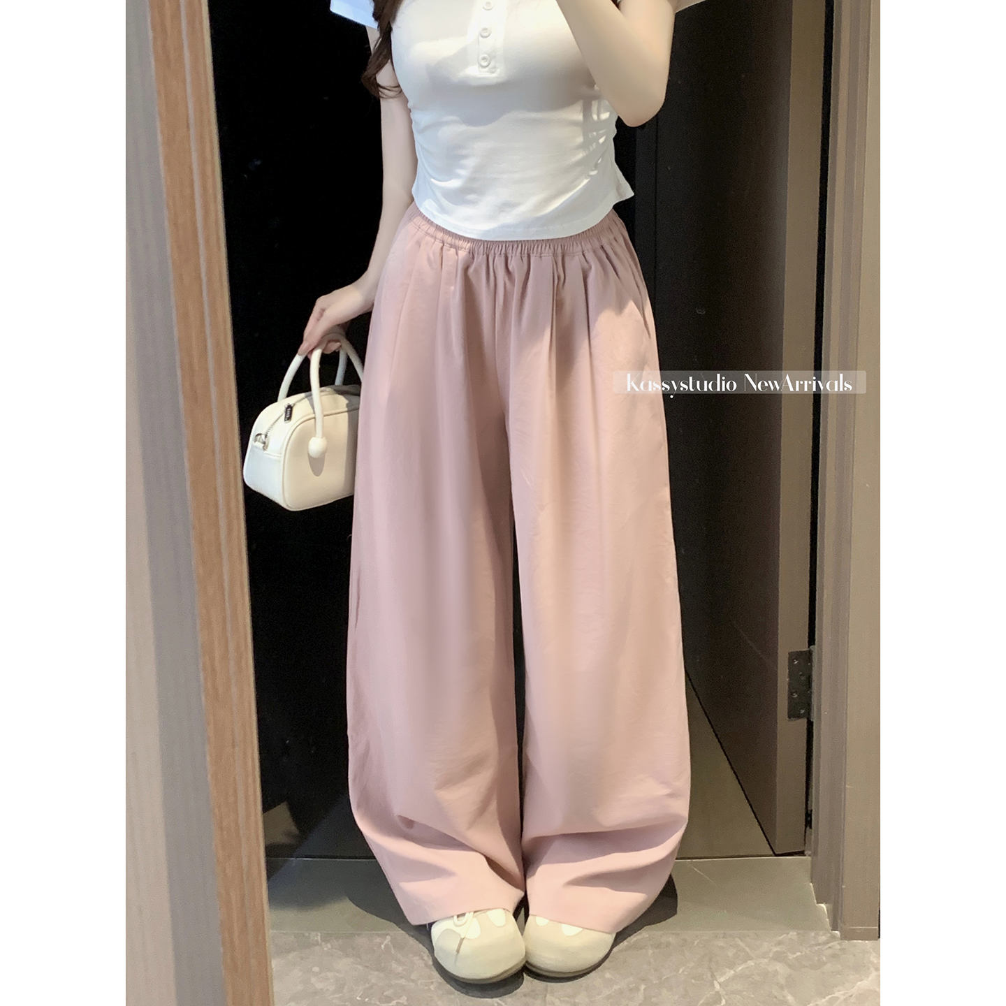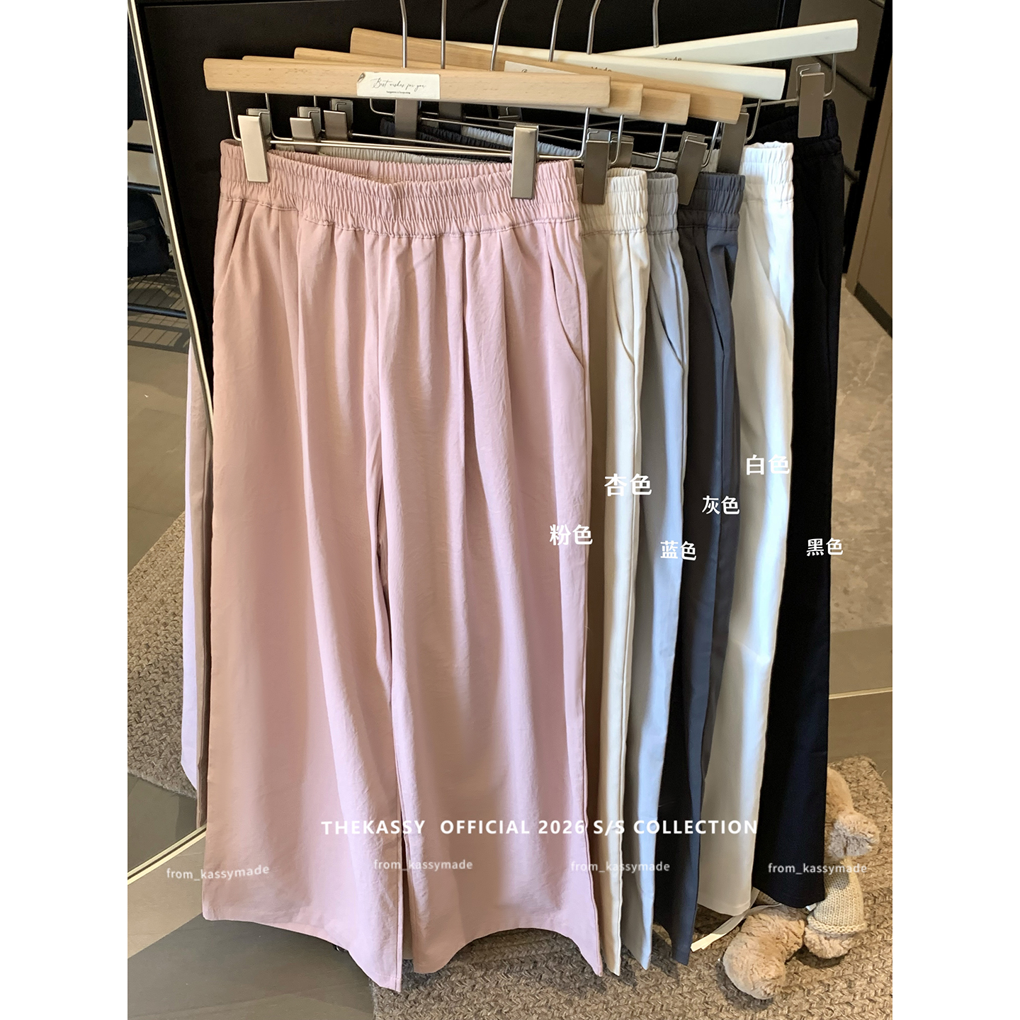 실사 2026 여름 새로운 단색 허리밴드 캐주얼 바지 여성 루즈핏 9 포인트 와이드 레그 팬츠