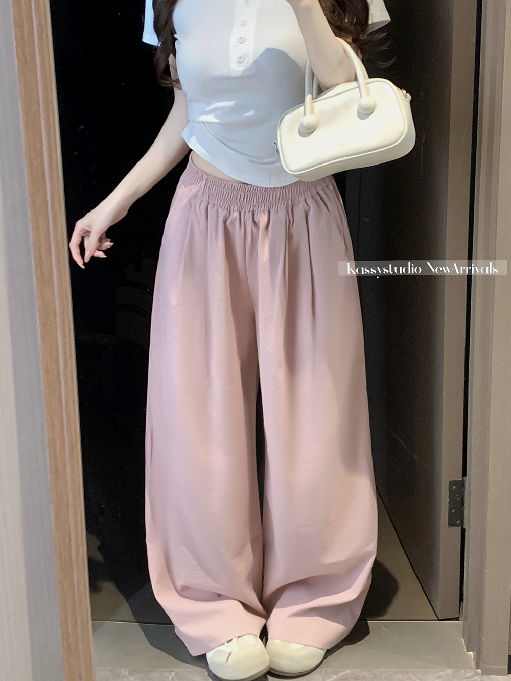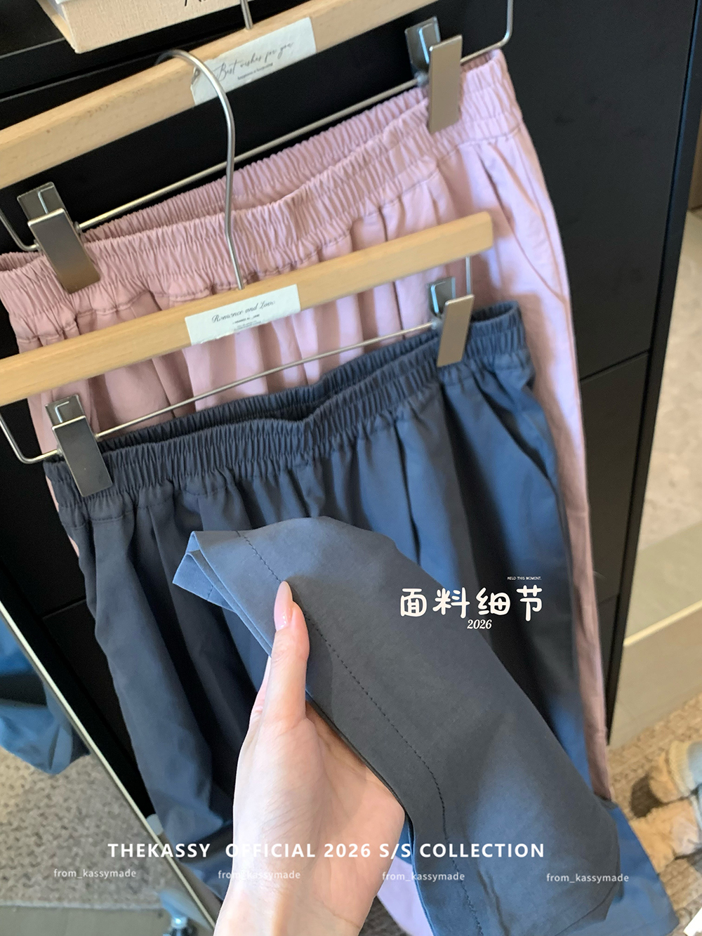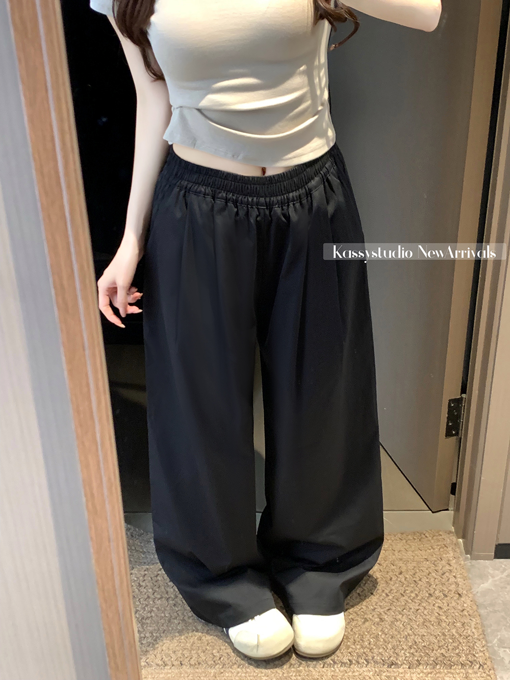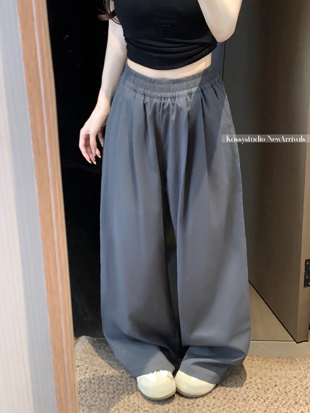 실사 2026 여름 새로운 단색 허리밴드 캐주얼 바지 여성 루즈핏 9 포인트 와이드 레그 팬츠