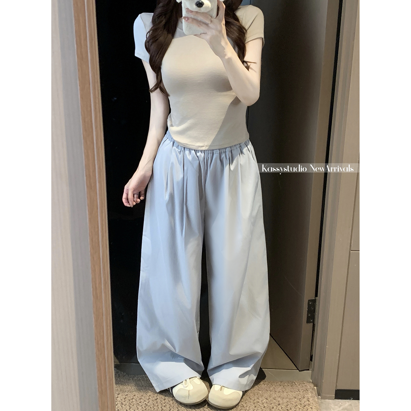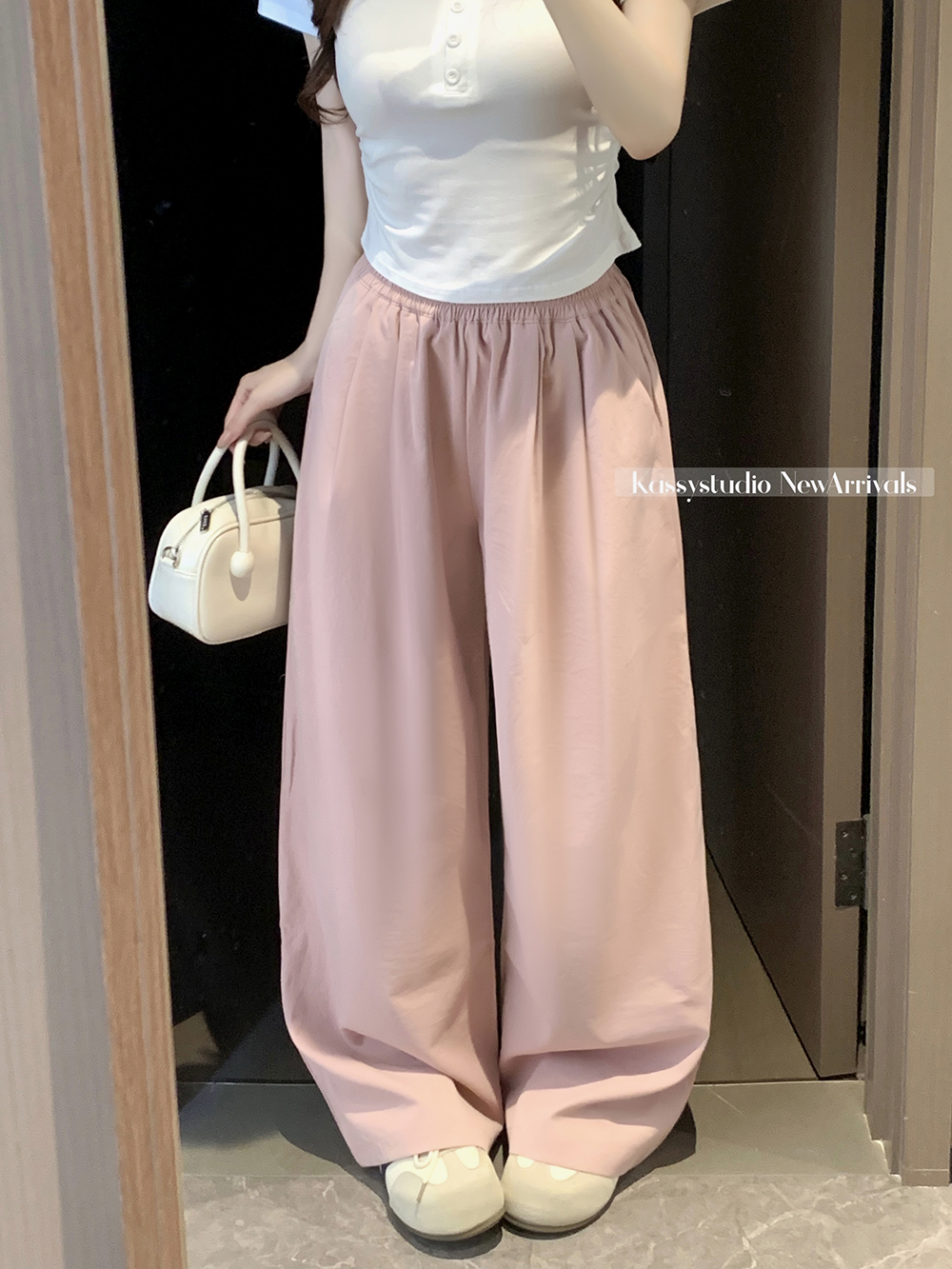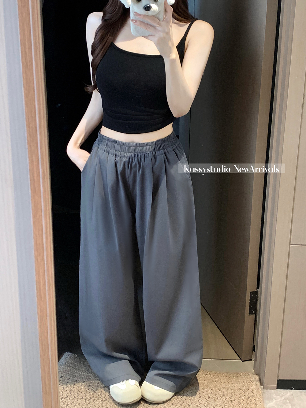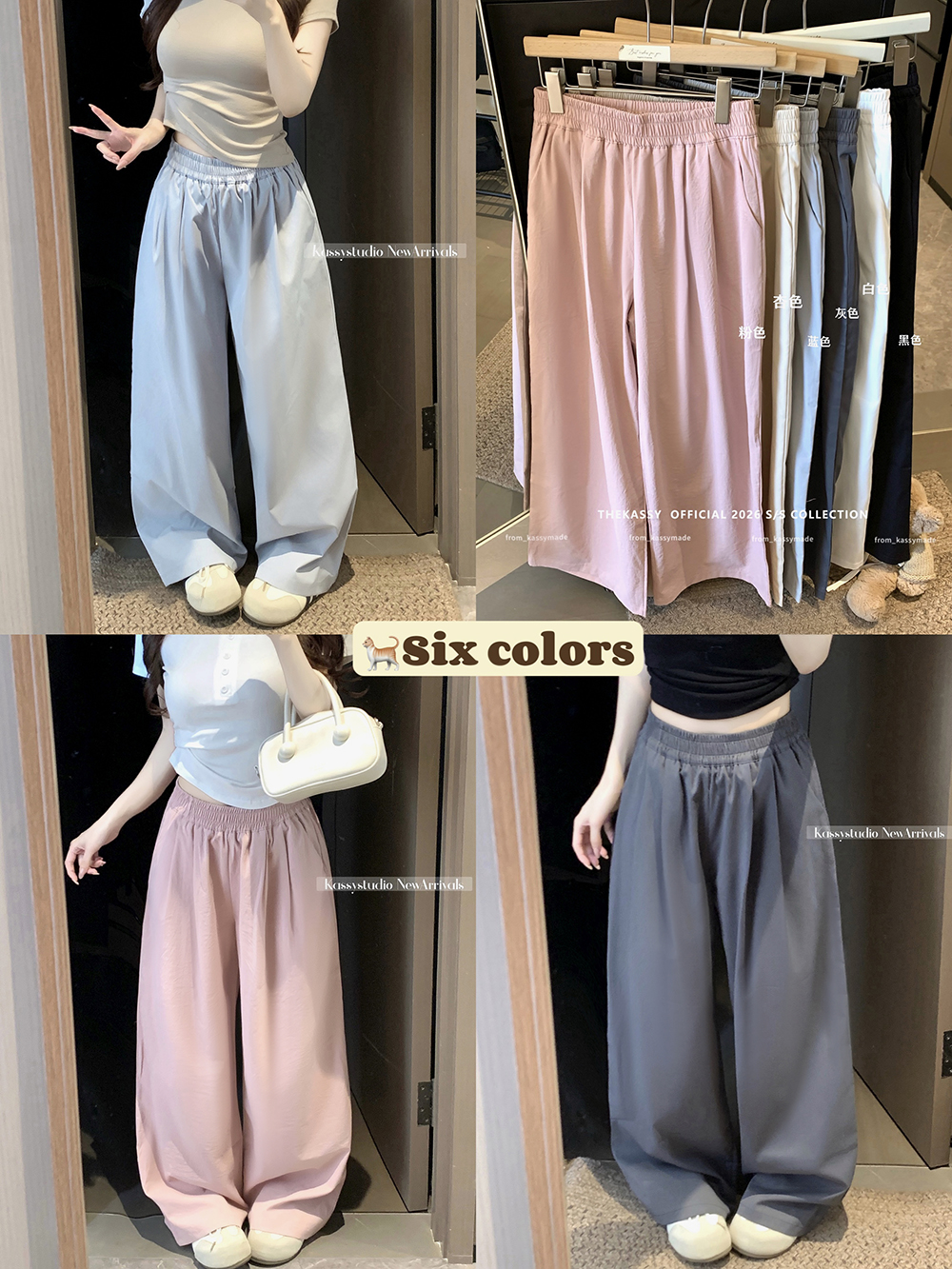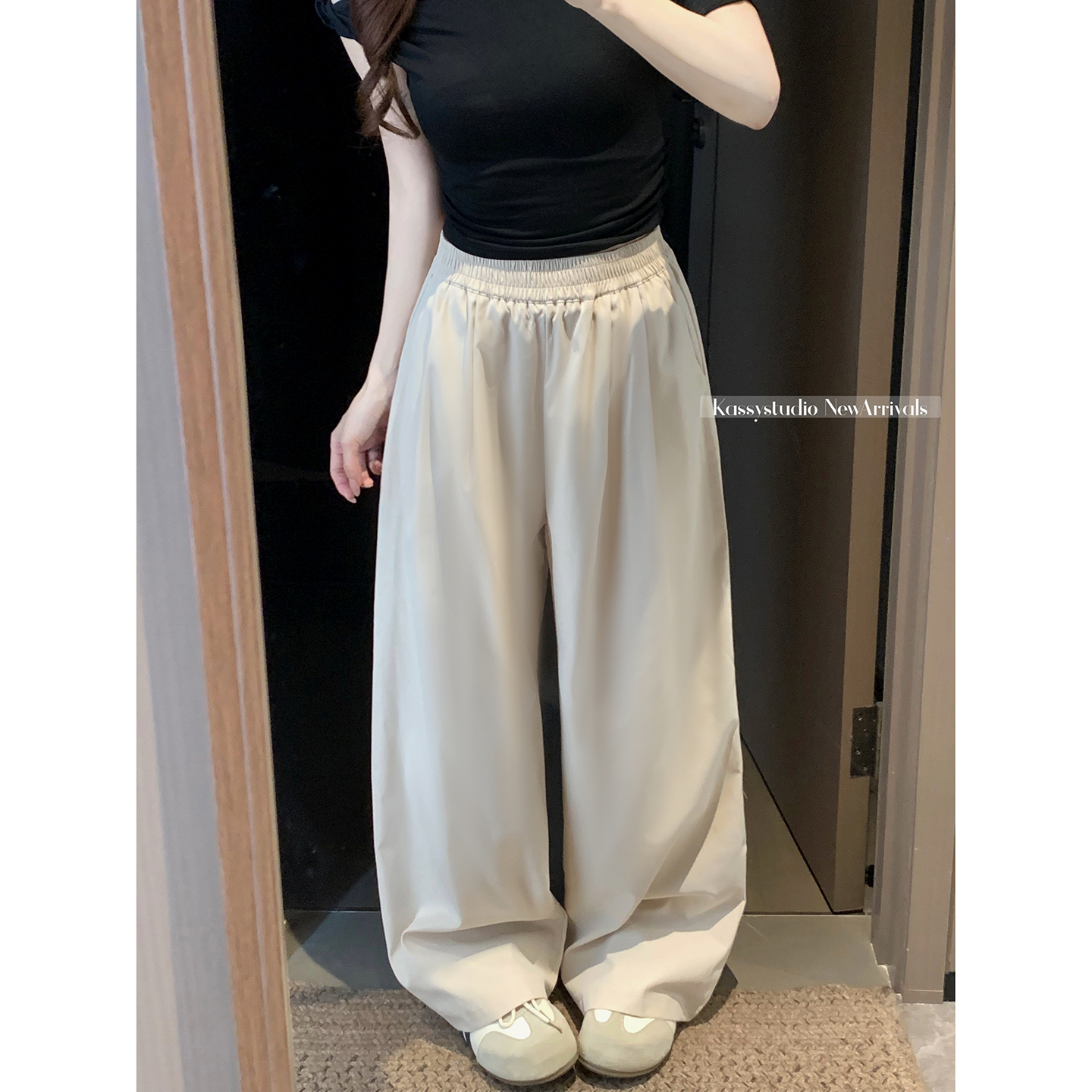 실사 2026 여름 새로운 단색 허리밴드 캐주얼 바지 여성 루즈핏 9 포인트 와이드 레그 팬츠