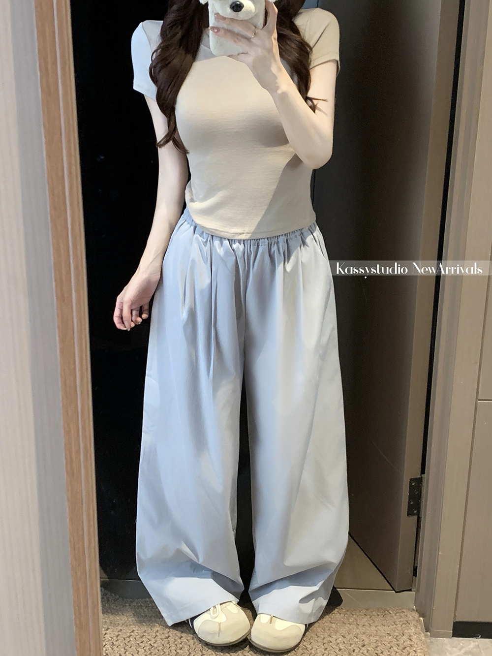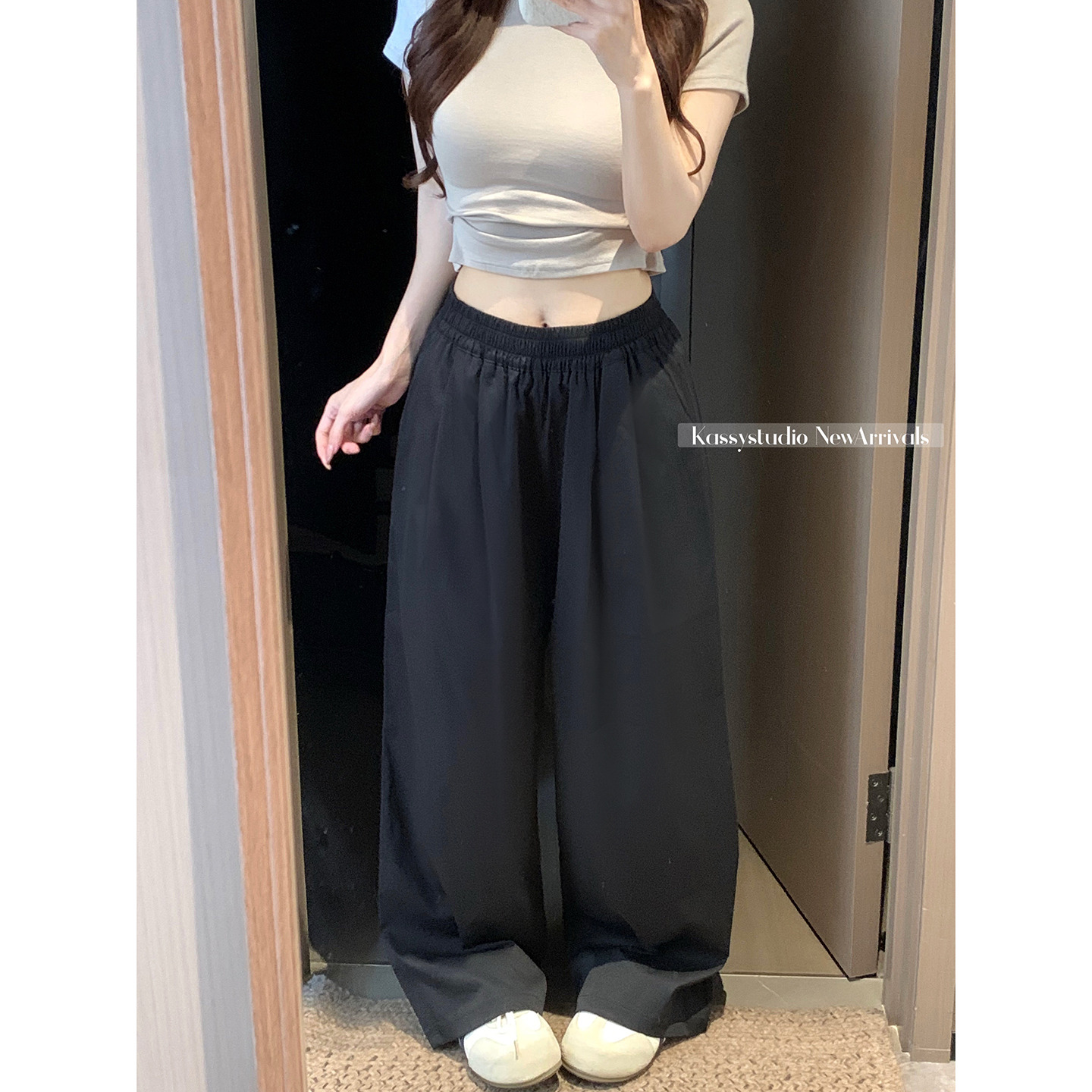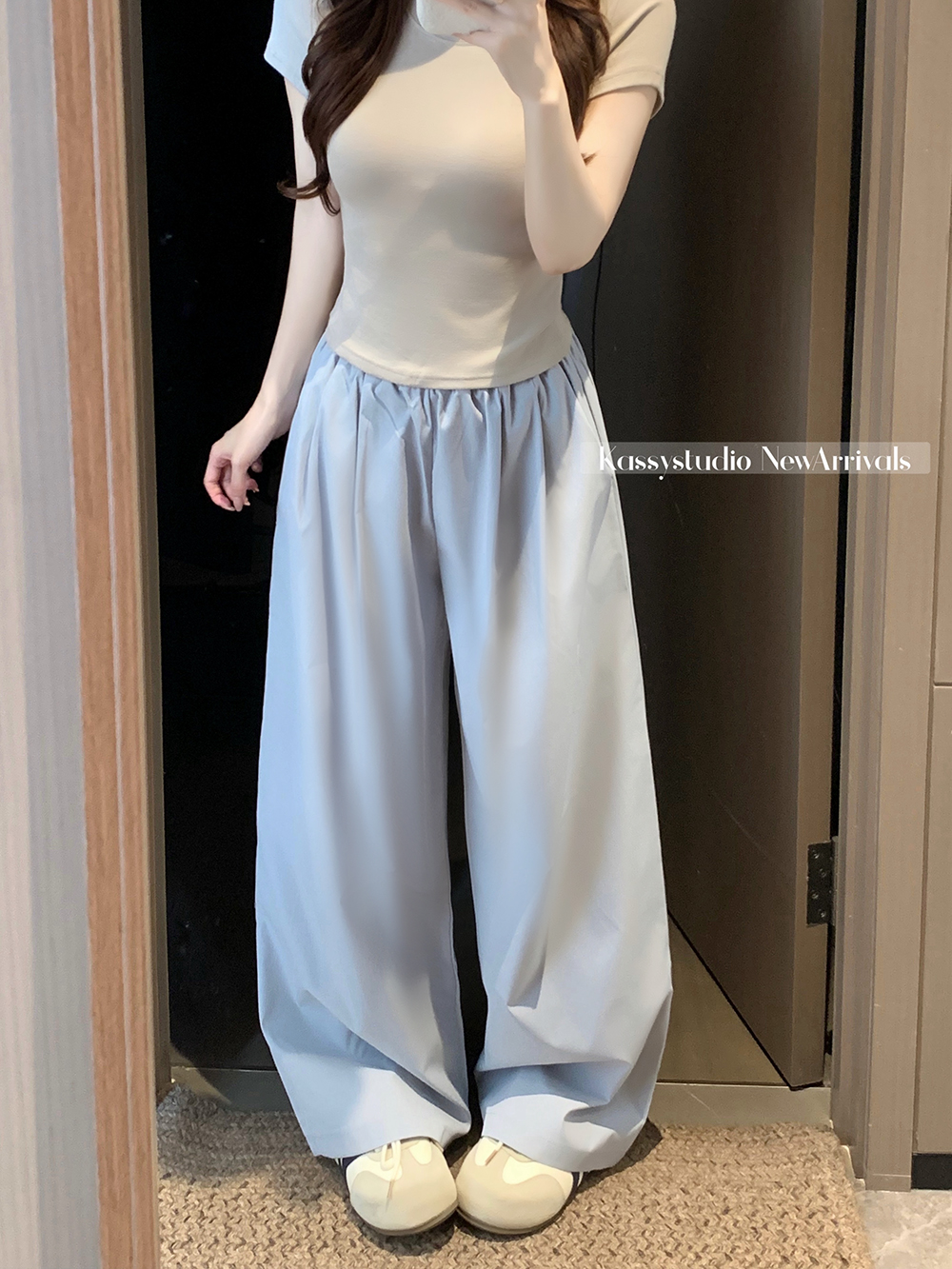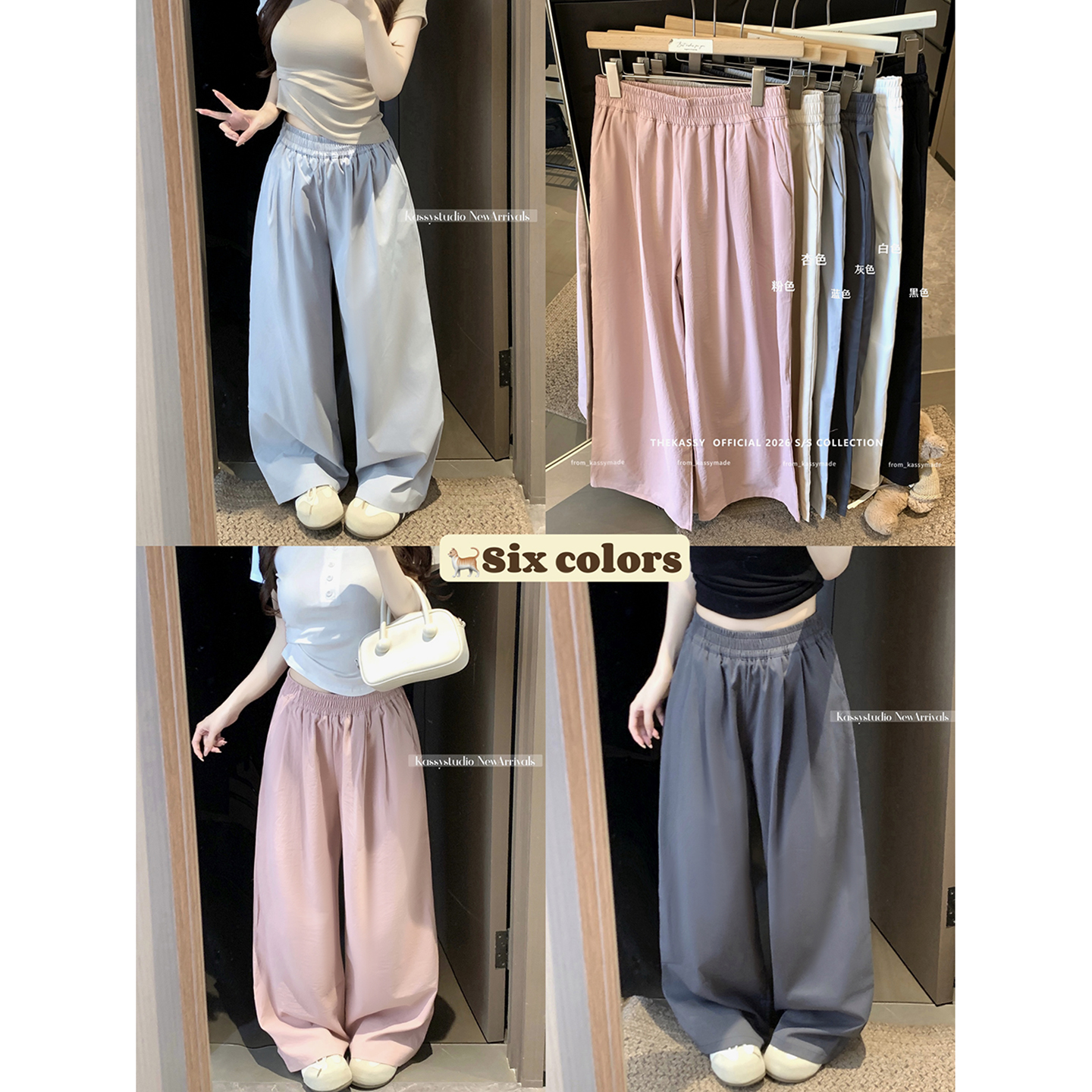 실사 2026 여름 새로운 단색 허리밴드 캐주얼 바지 여성 루즈핏 9 포인트 와이드 레그 팬츠