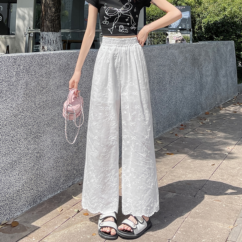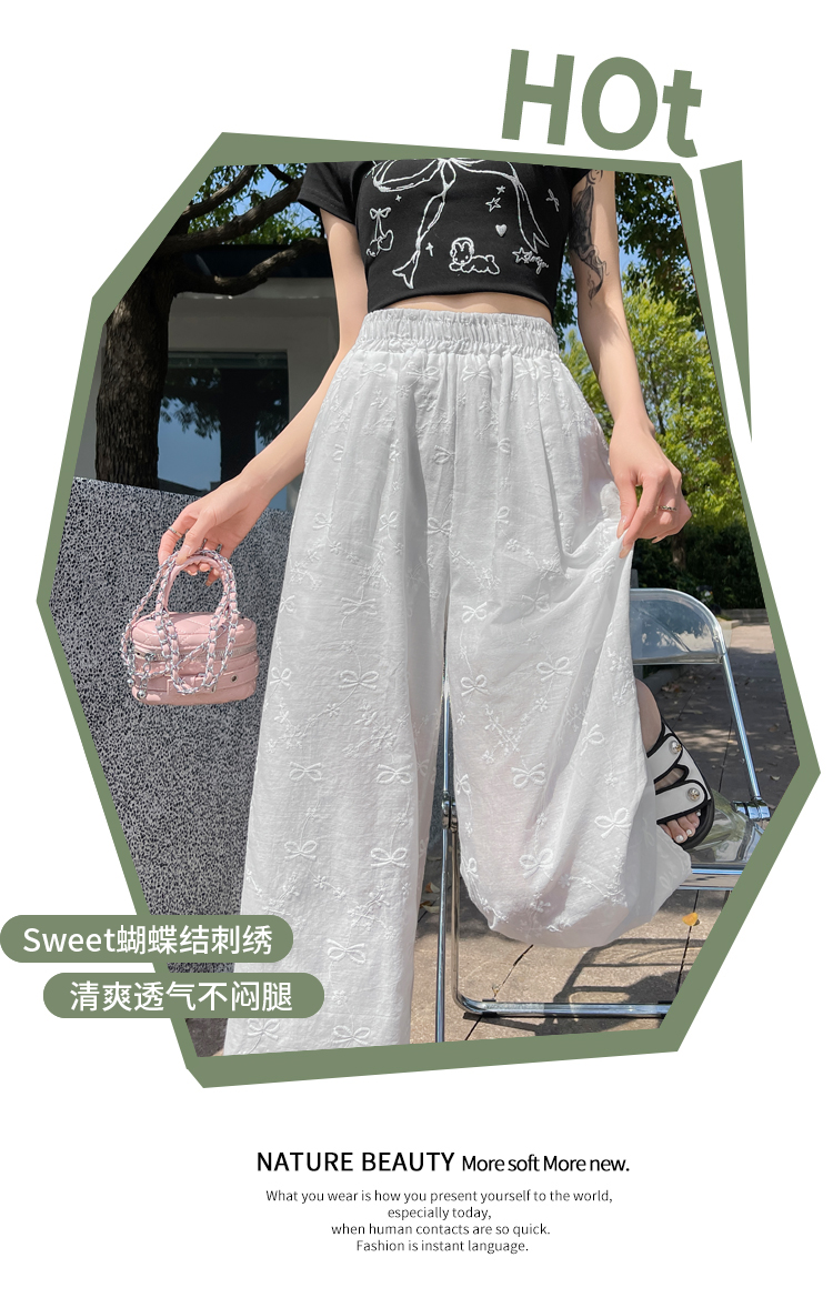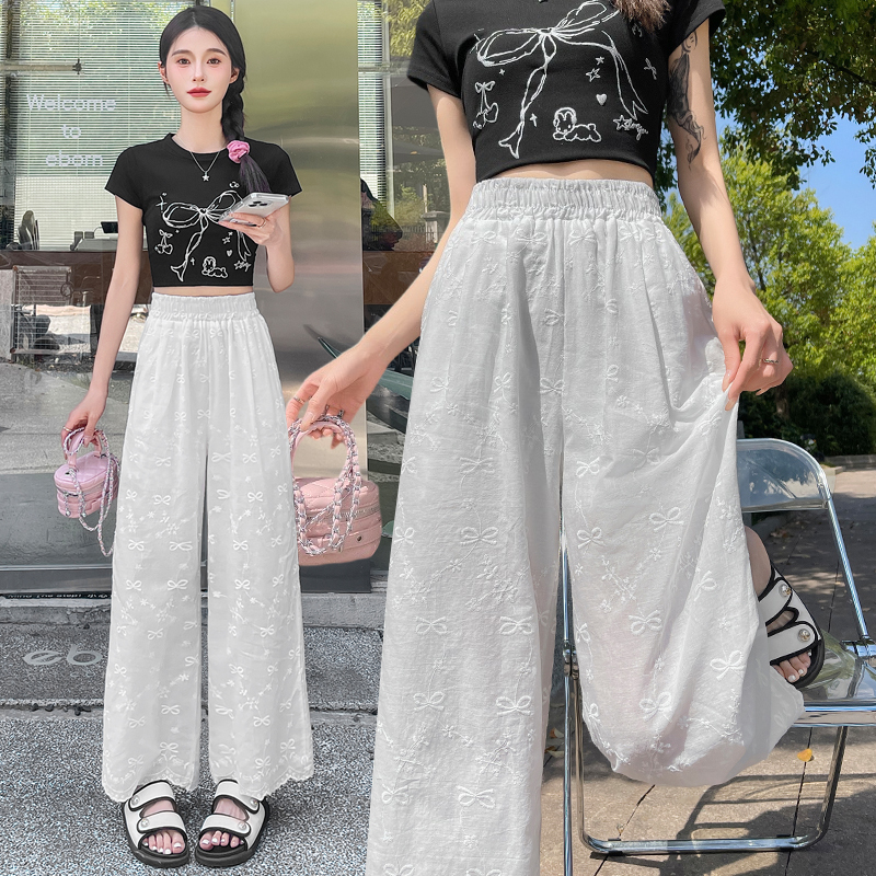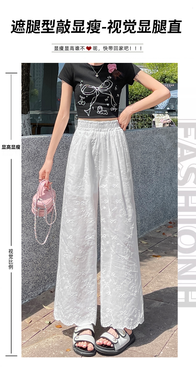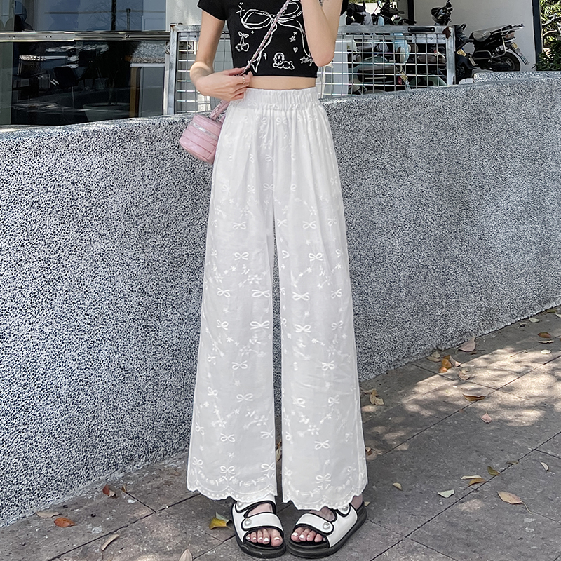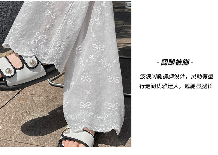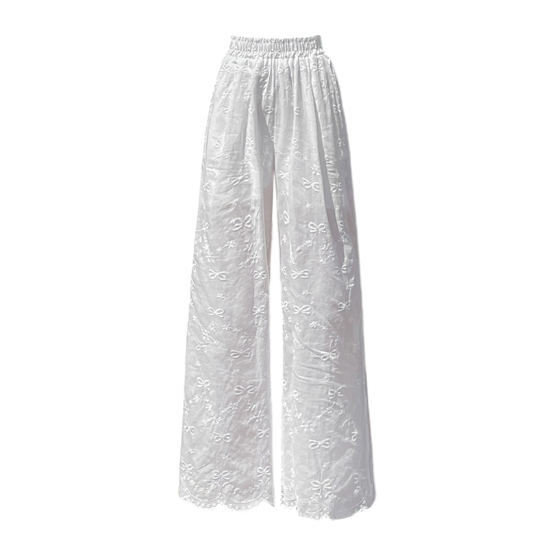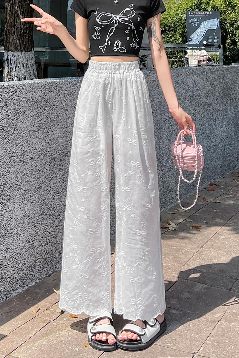 실사 여름 새로운 얇은 스타일 화이트 홀로우 아웃 레이스 나비 매듭 자수 캐주얼 루즈핏 스트레이트 와이드 레깅스 바지