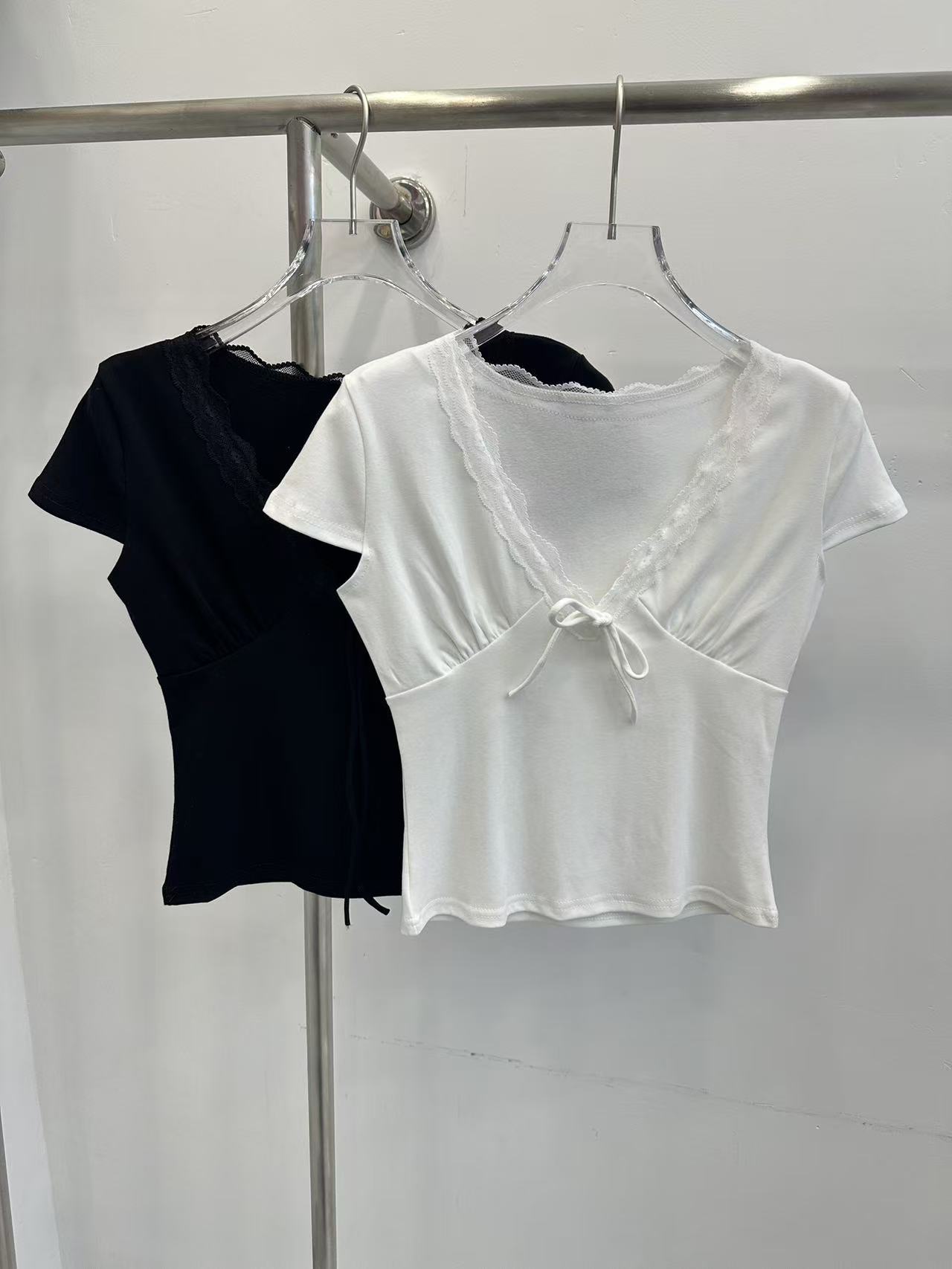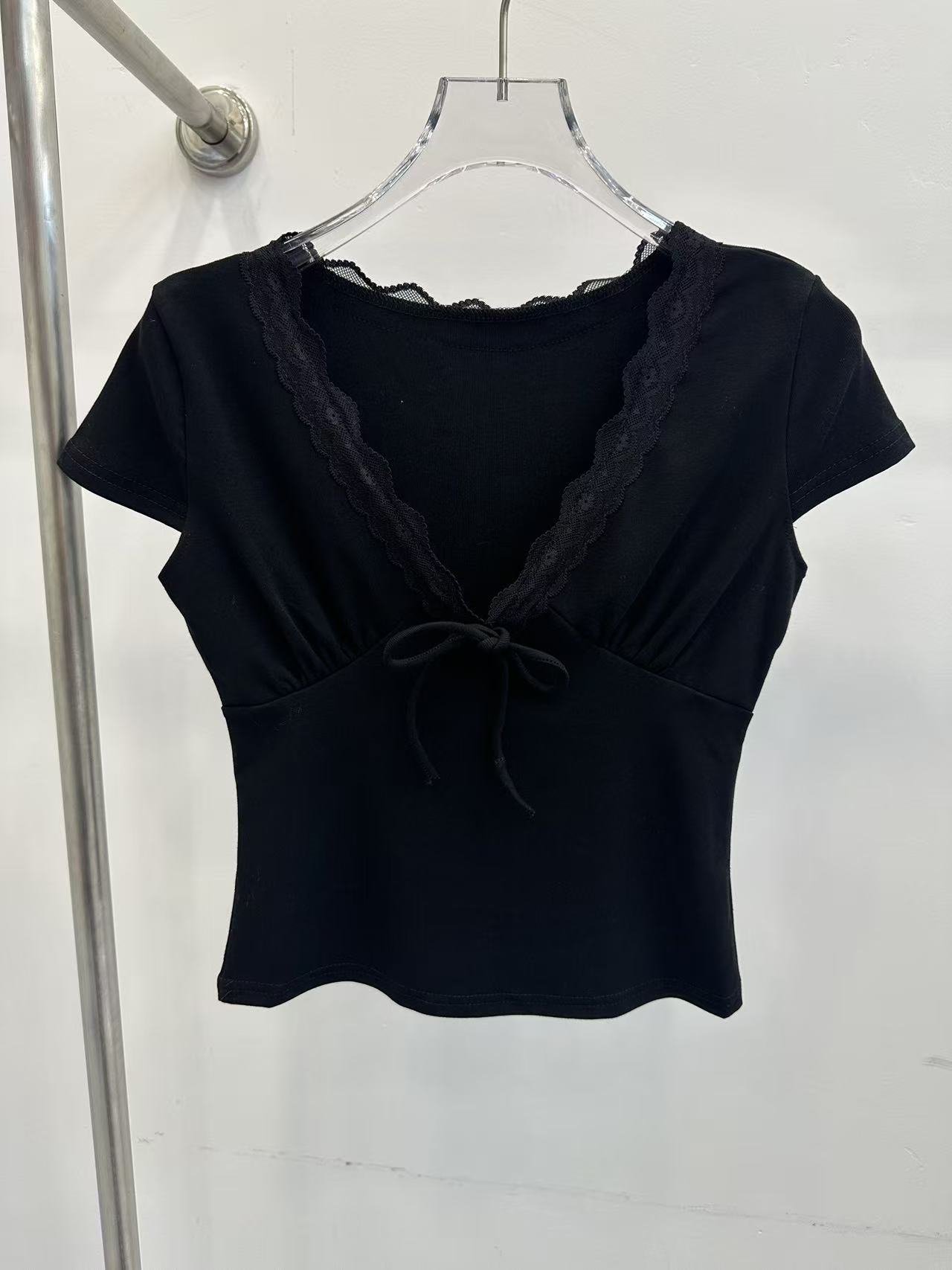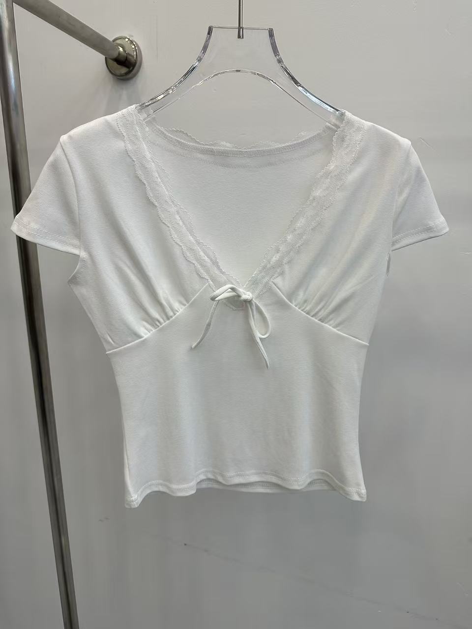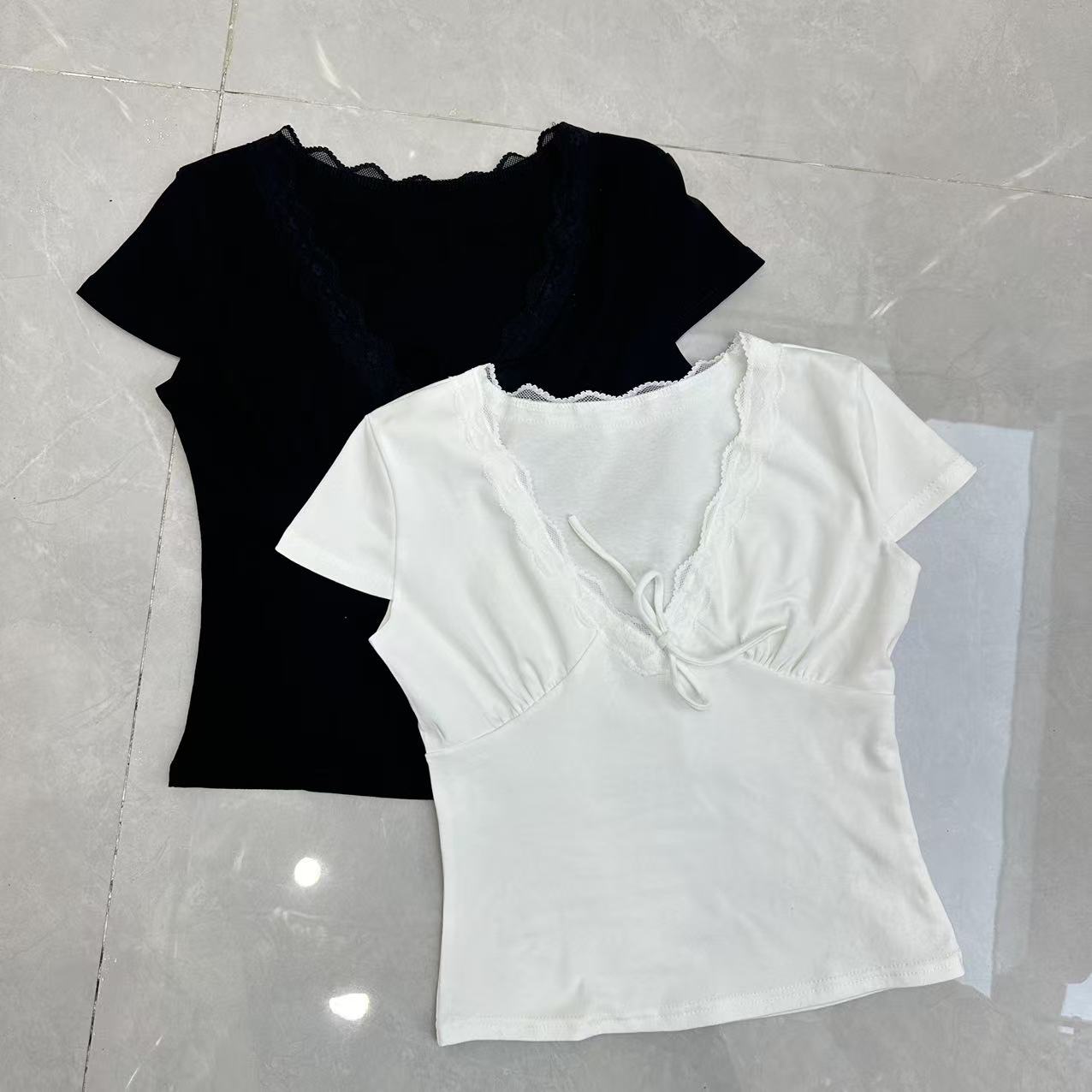 송 긍정적 인 En 화이트 레이스 조각 스트랩 V넥 반팔 티셔츠 여성 여름 몸매 가꾸기 순수한 욕망 디자인 센스 고유 한 맨위