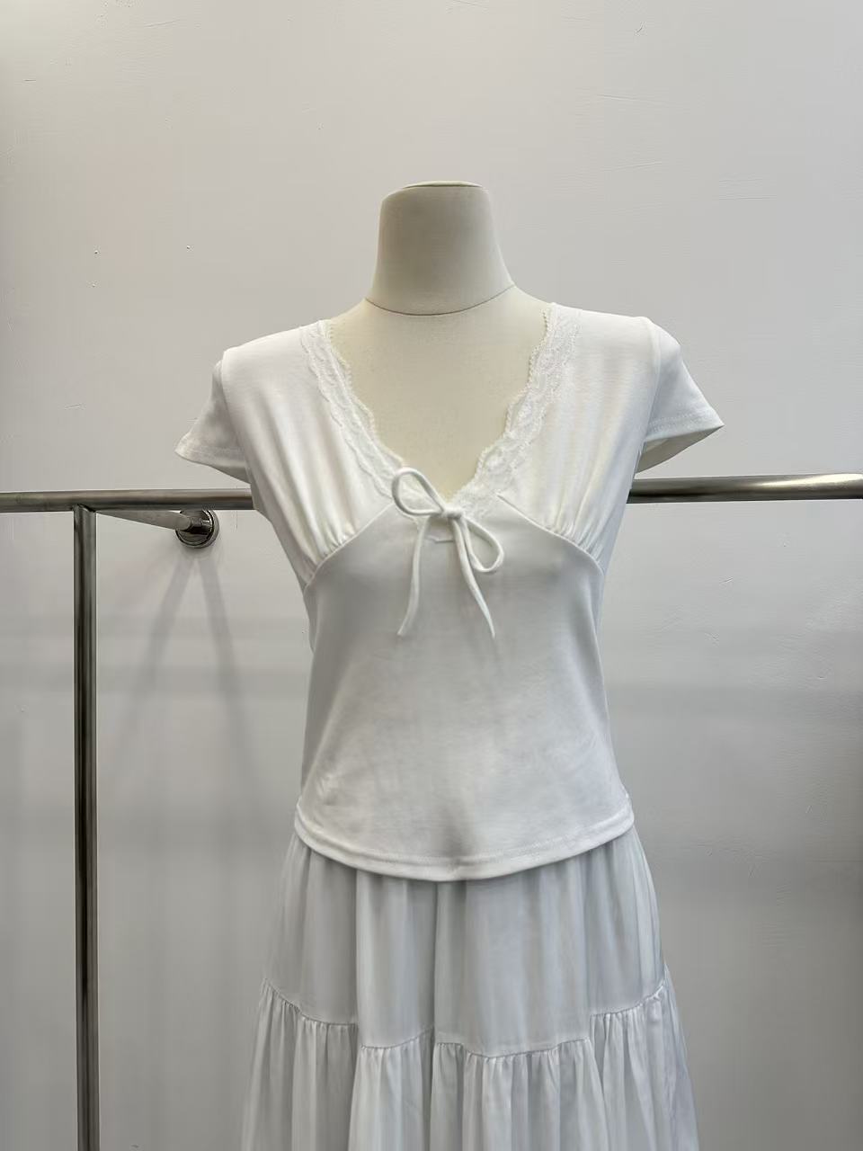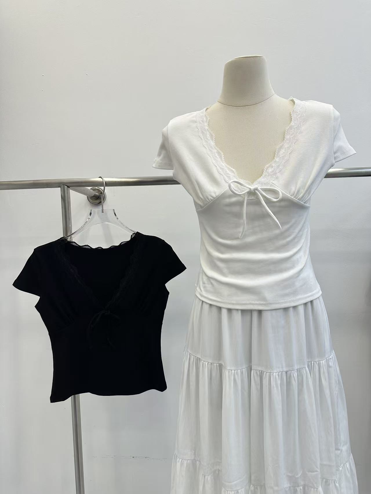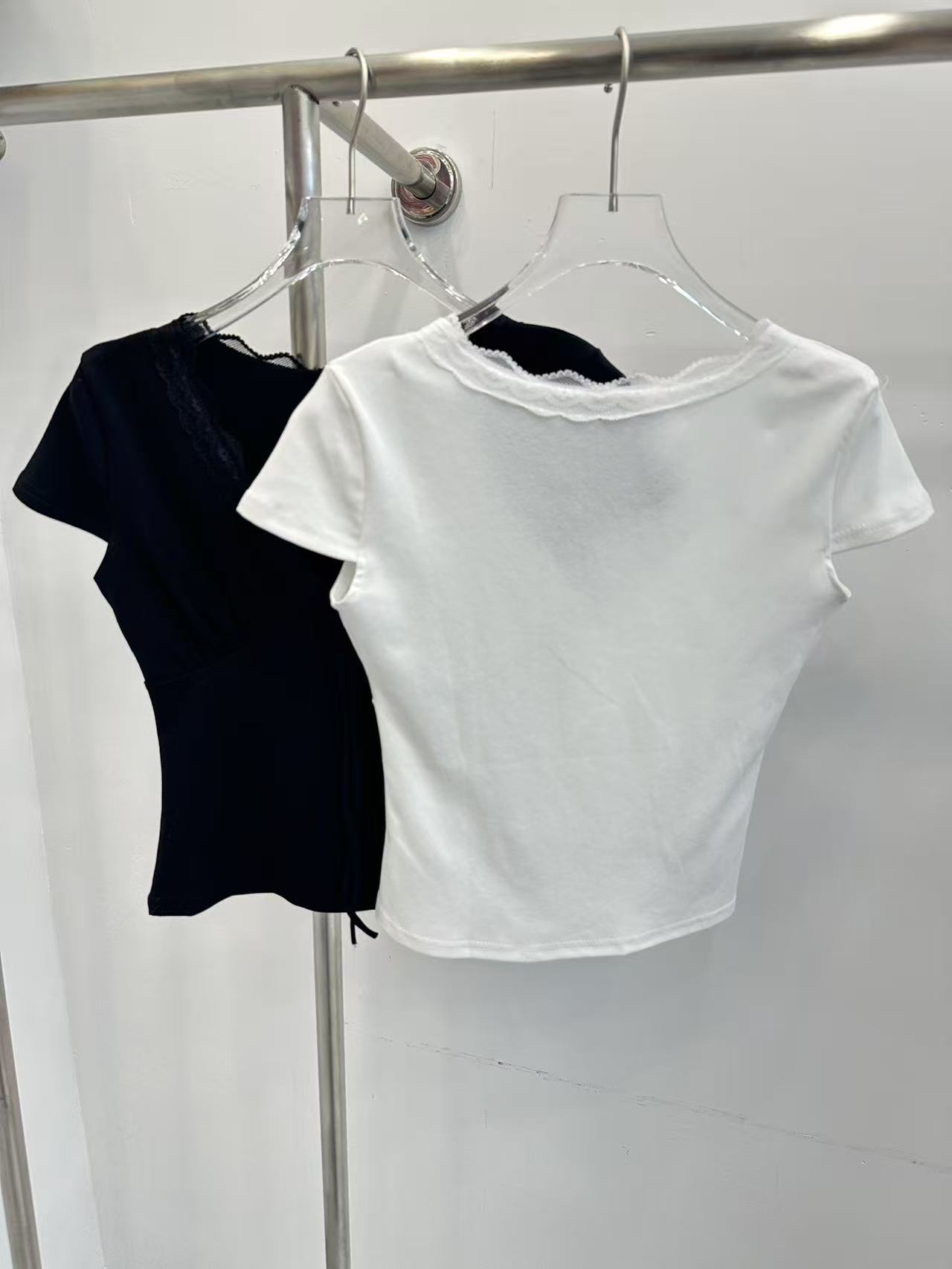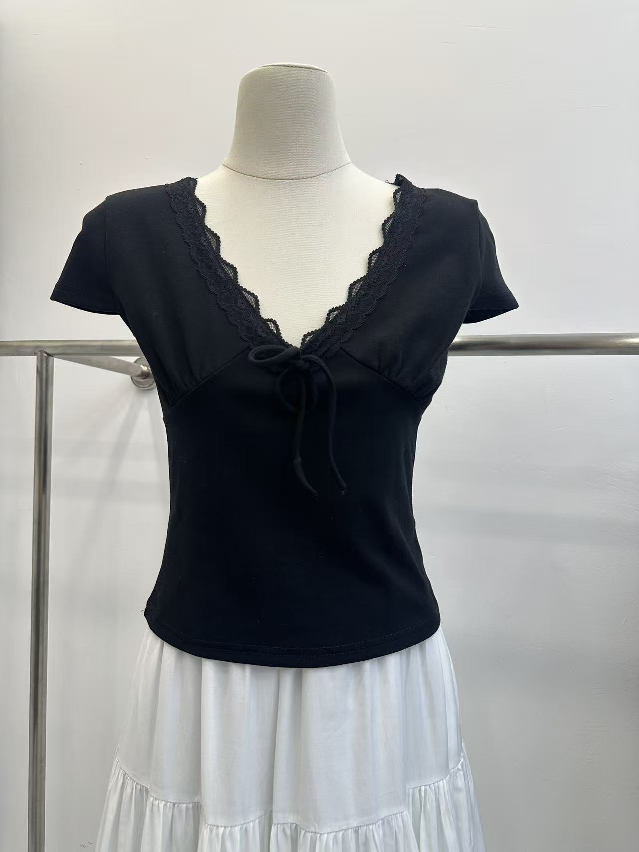 송 긍정적 인 En 화이트 레이스 조각 스트랩 V넥 반팔 티셔츠 여성 여름 몸매 가꾸기 순수한 욕망 디자인 센스 고유 한 맨위