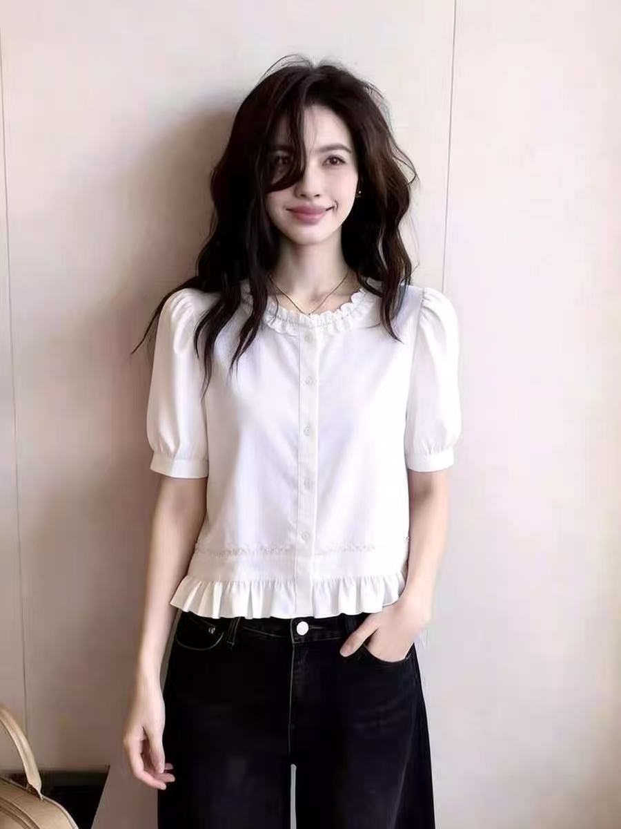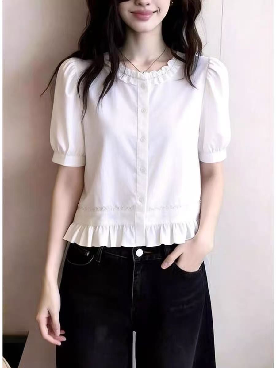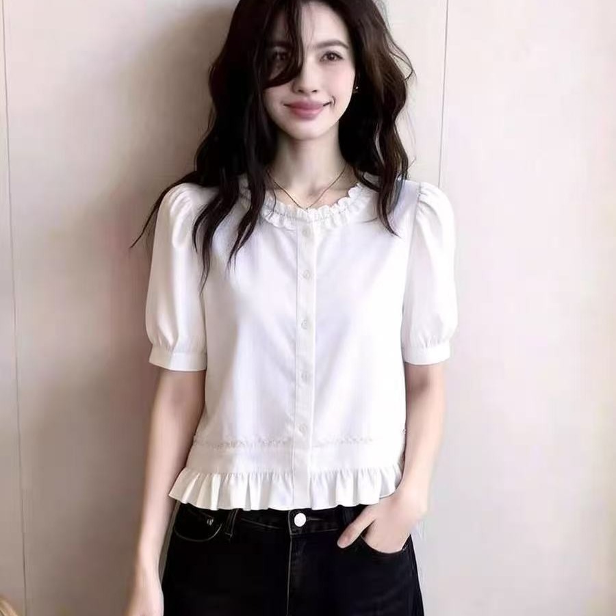 화이트 프릴 거품 소매 여성 셔츠 여름 새로운 부드러운 바람 외국 가스 허리 수축 슬림해 보이는 다용도 반팔 맨위