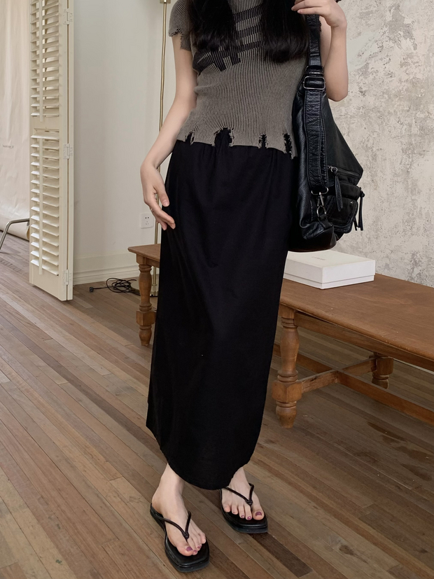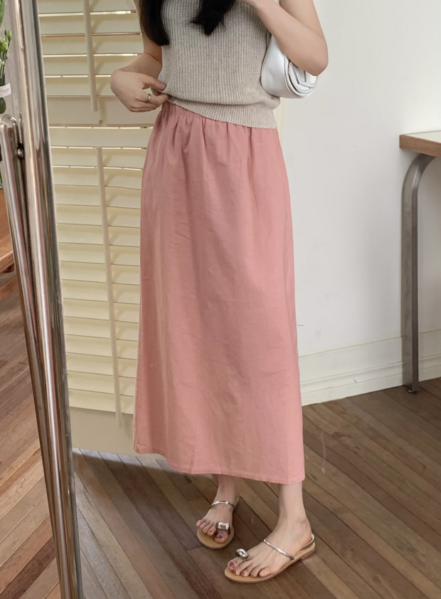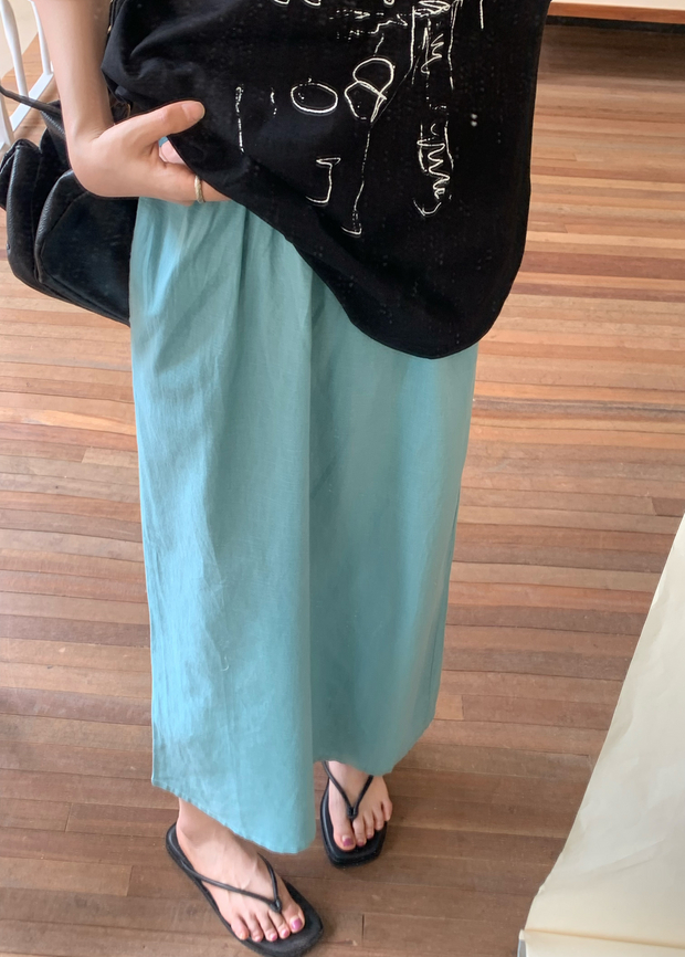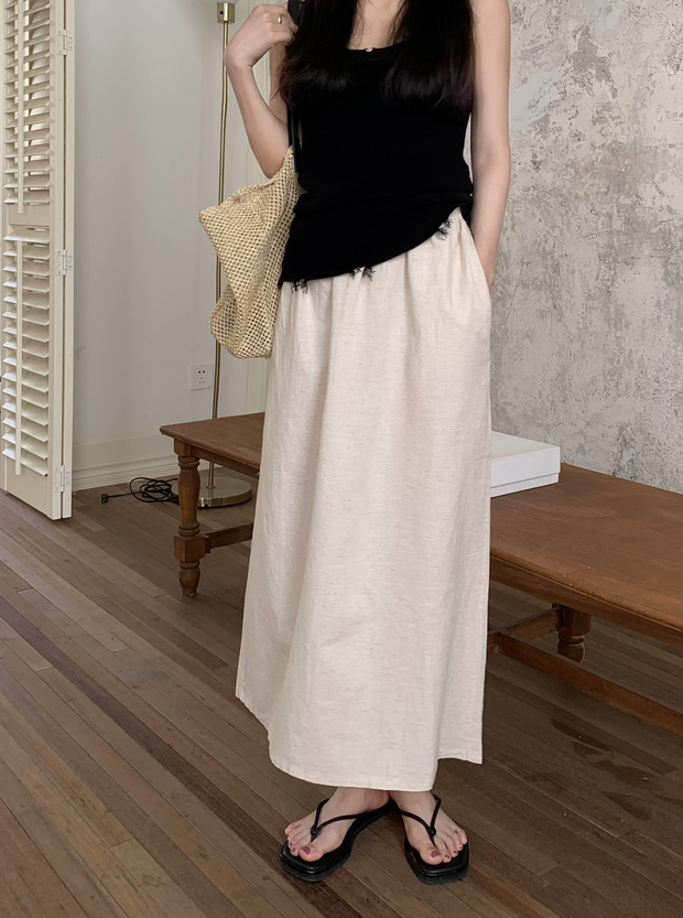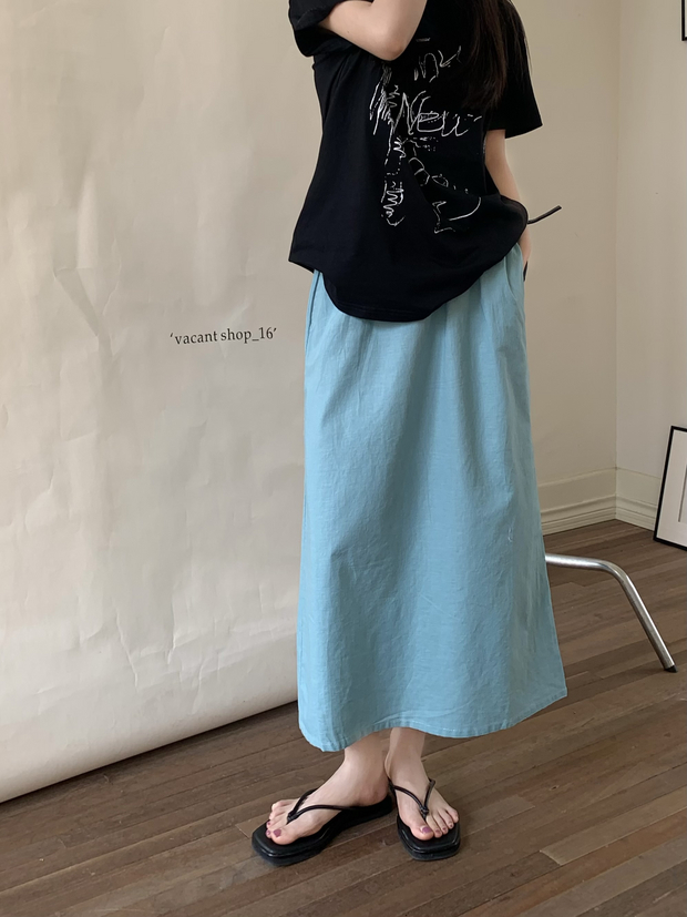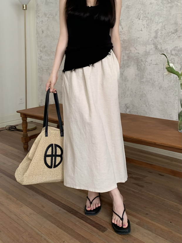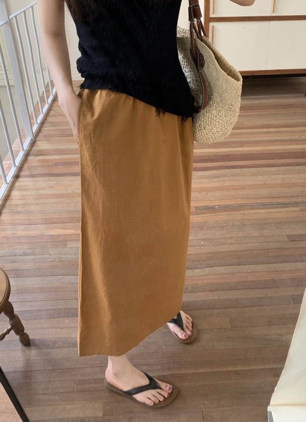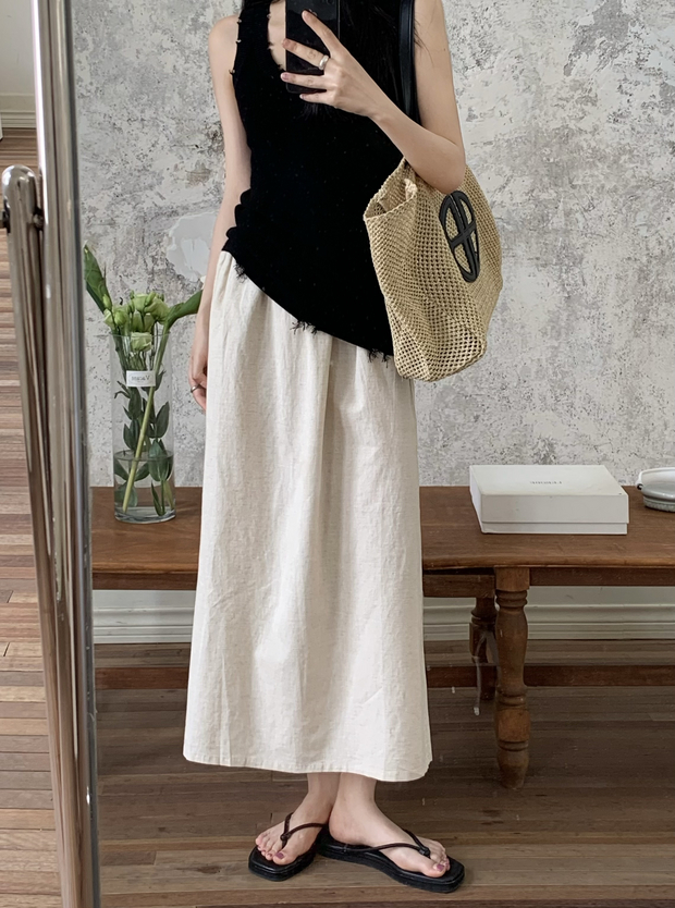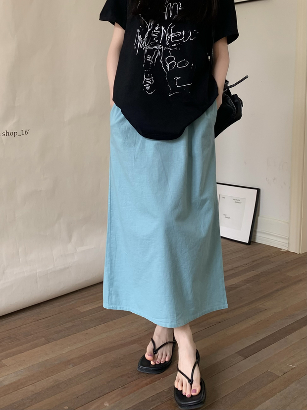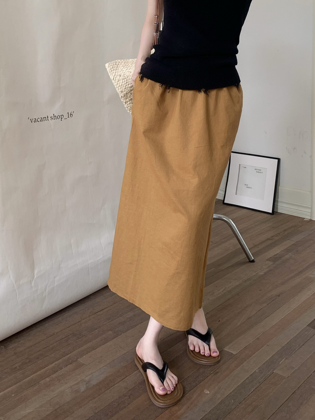 실사 일본식 레트로 면 린넨 반신 스커트 여름 얇은 스타일 작은 키 트임 밴딩 하이웨이스트 스트레이트 한 마디 롱 스커트