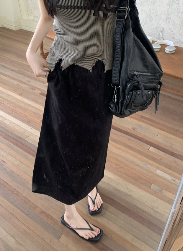 실사 유럽 역 2026 유럽 상품 여름 허리밴드 이후 트임 스트레이트 마 재료 반신 스커트 무릎 아래 롱 스커트