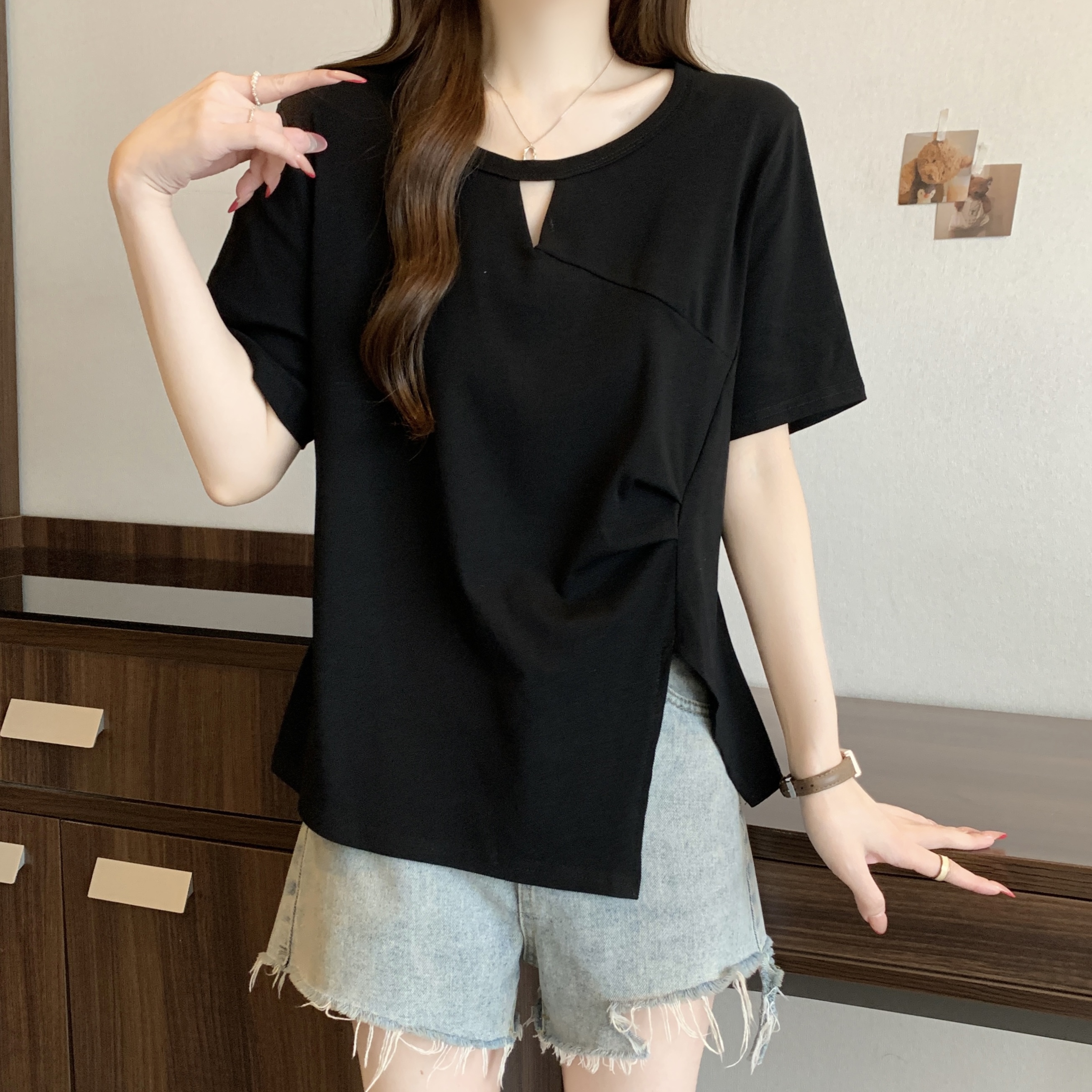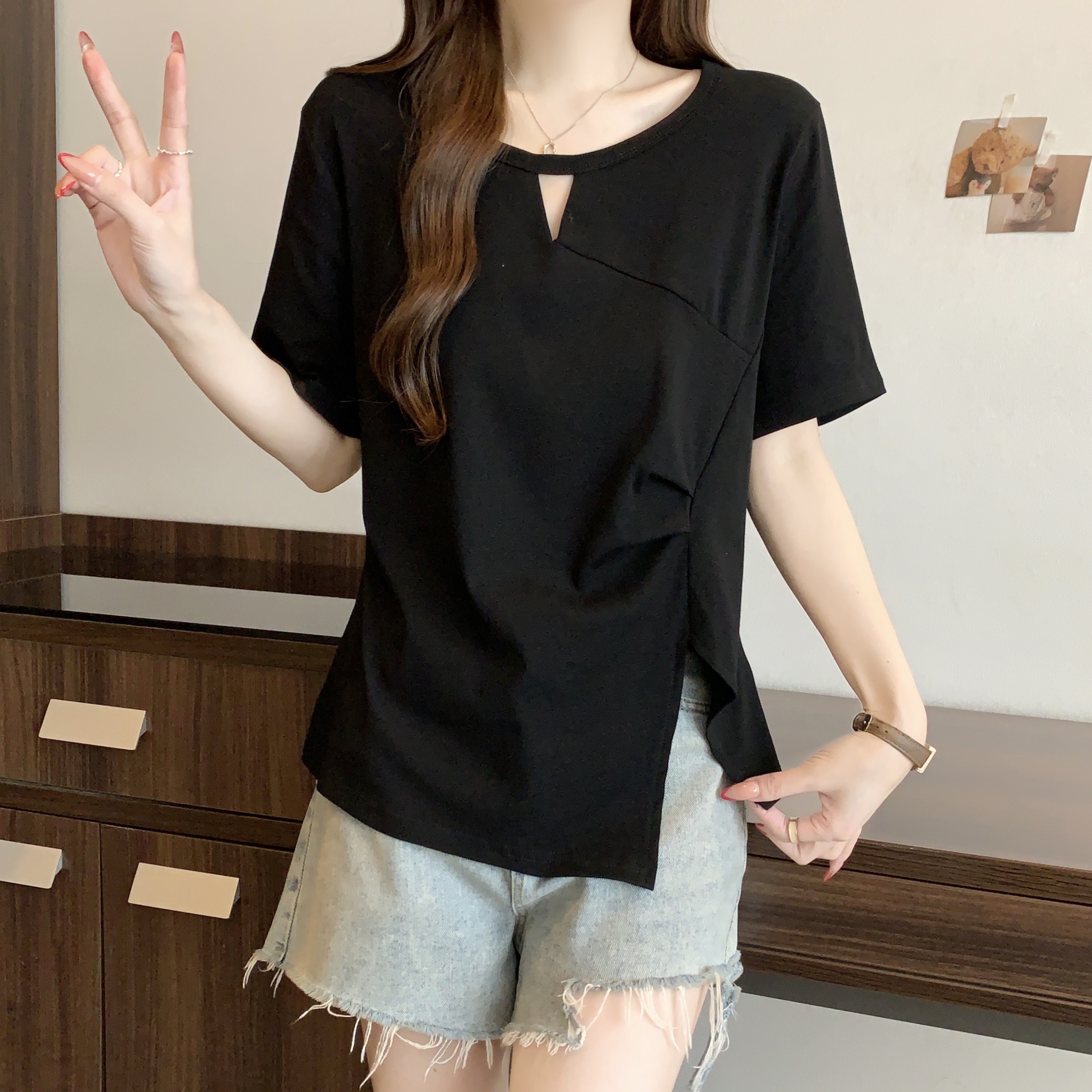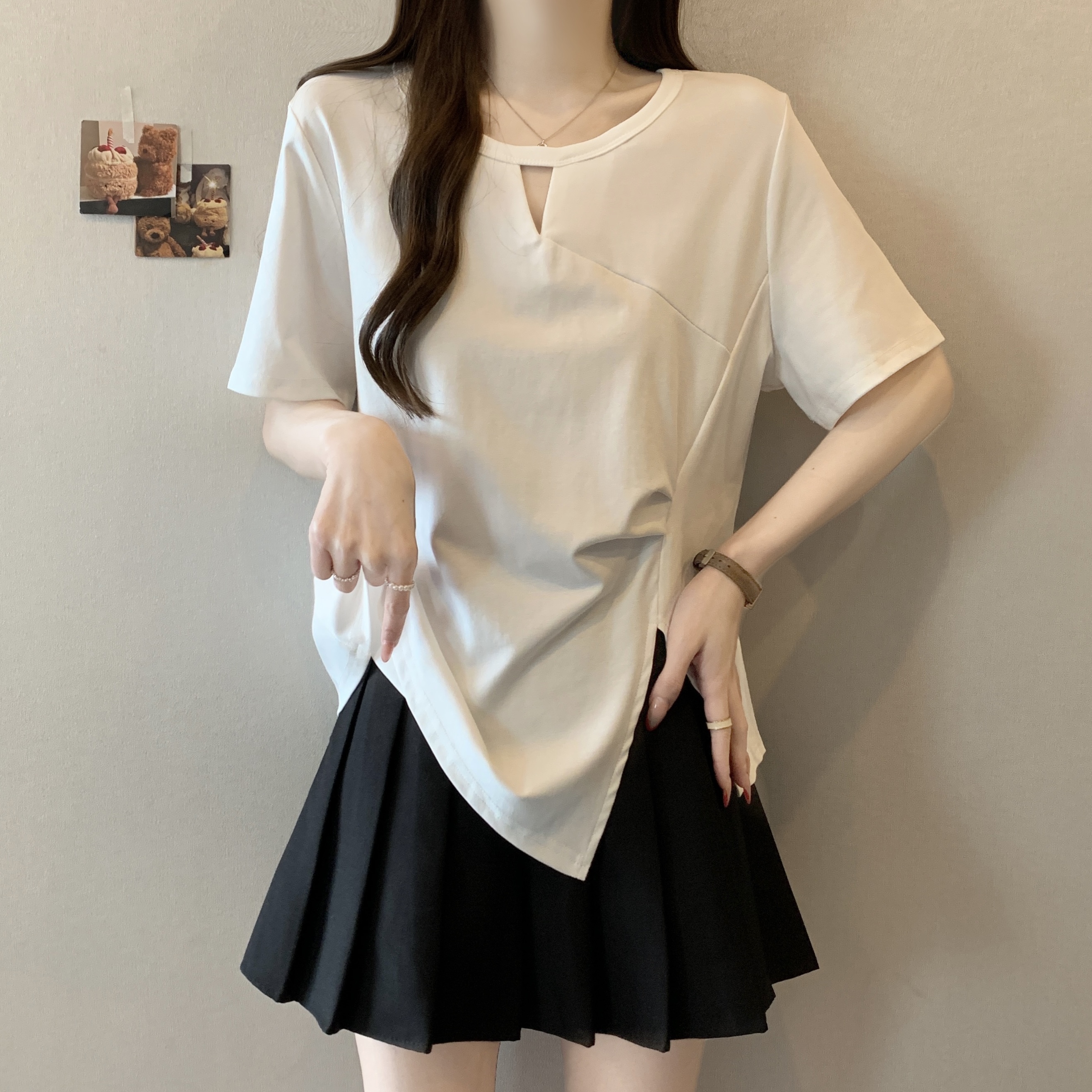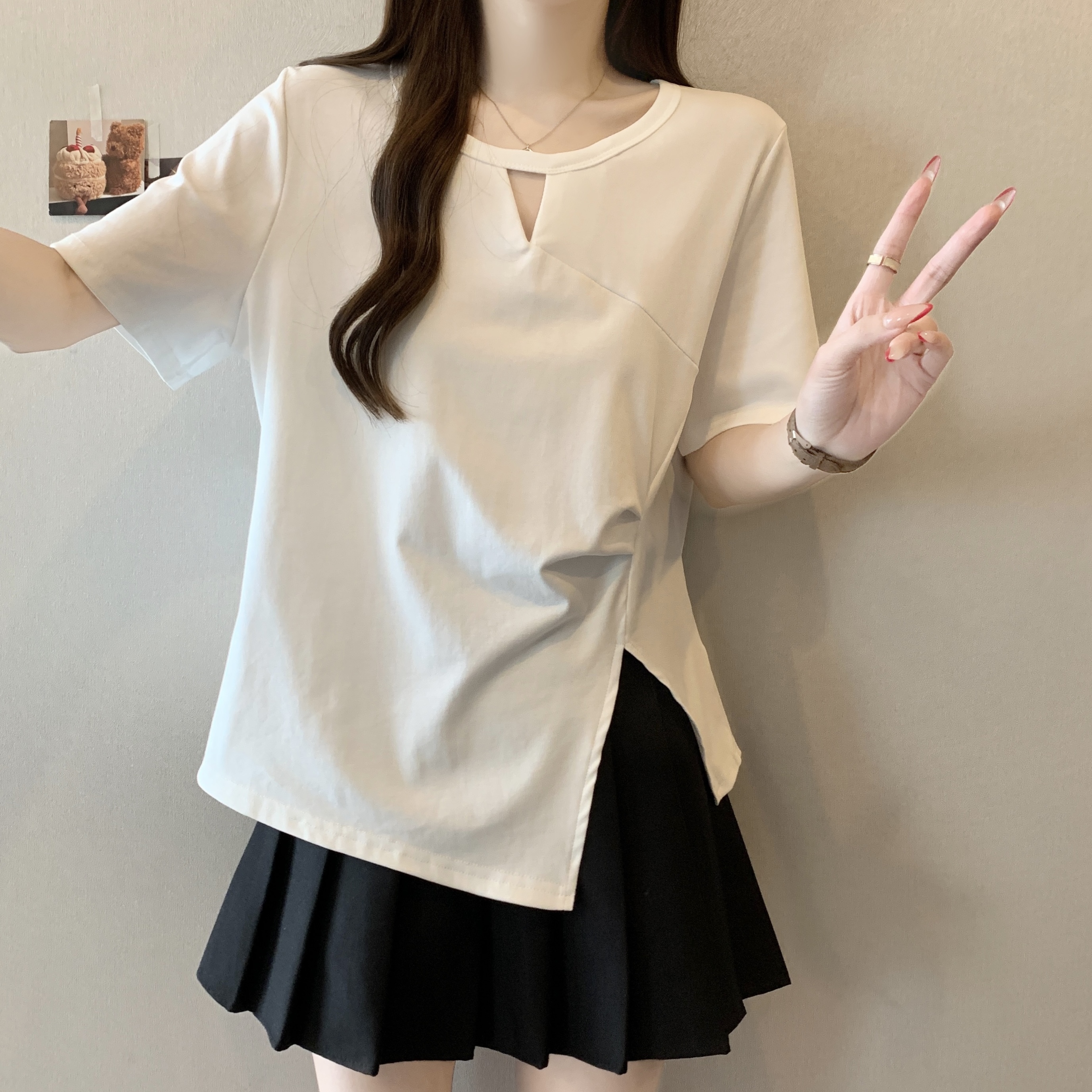 실사 빅 사이즈 불규칙 홀로우 아웃 디자인 센스 주름 티셔츠 지방 mm 슬림해 보이는 긍정적 인 어깨 반팔 허리 수축 맨위 여성 여름