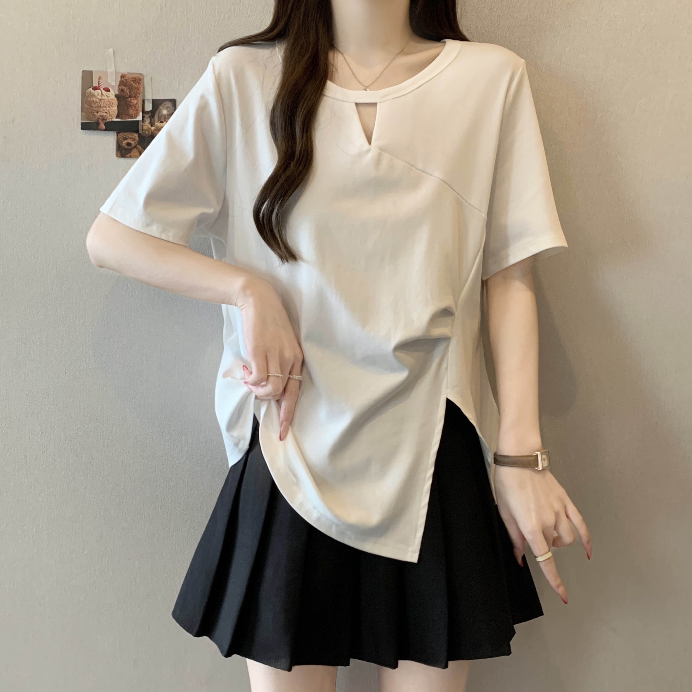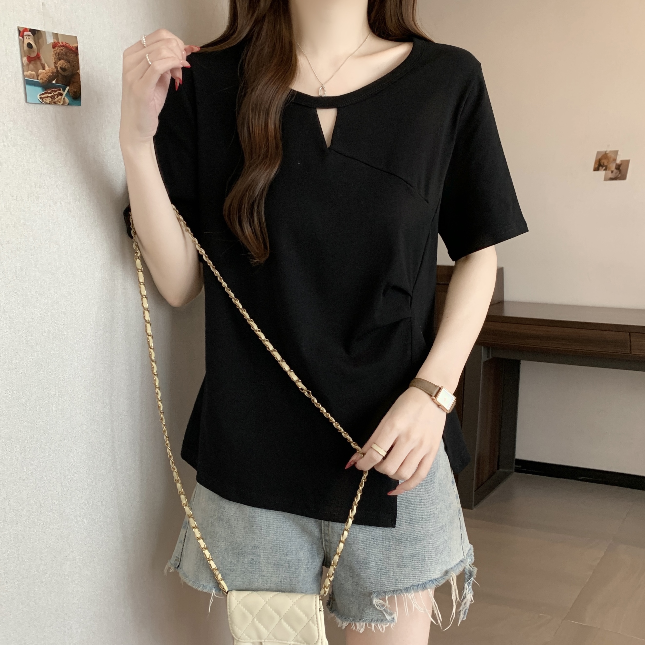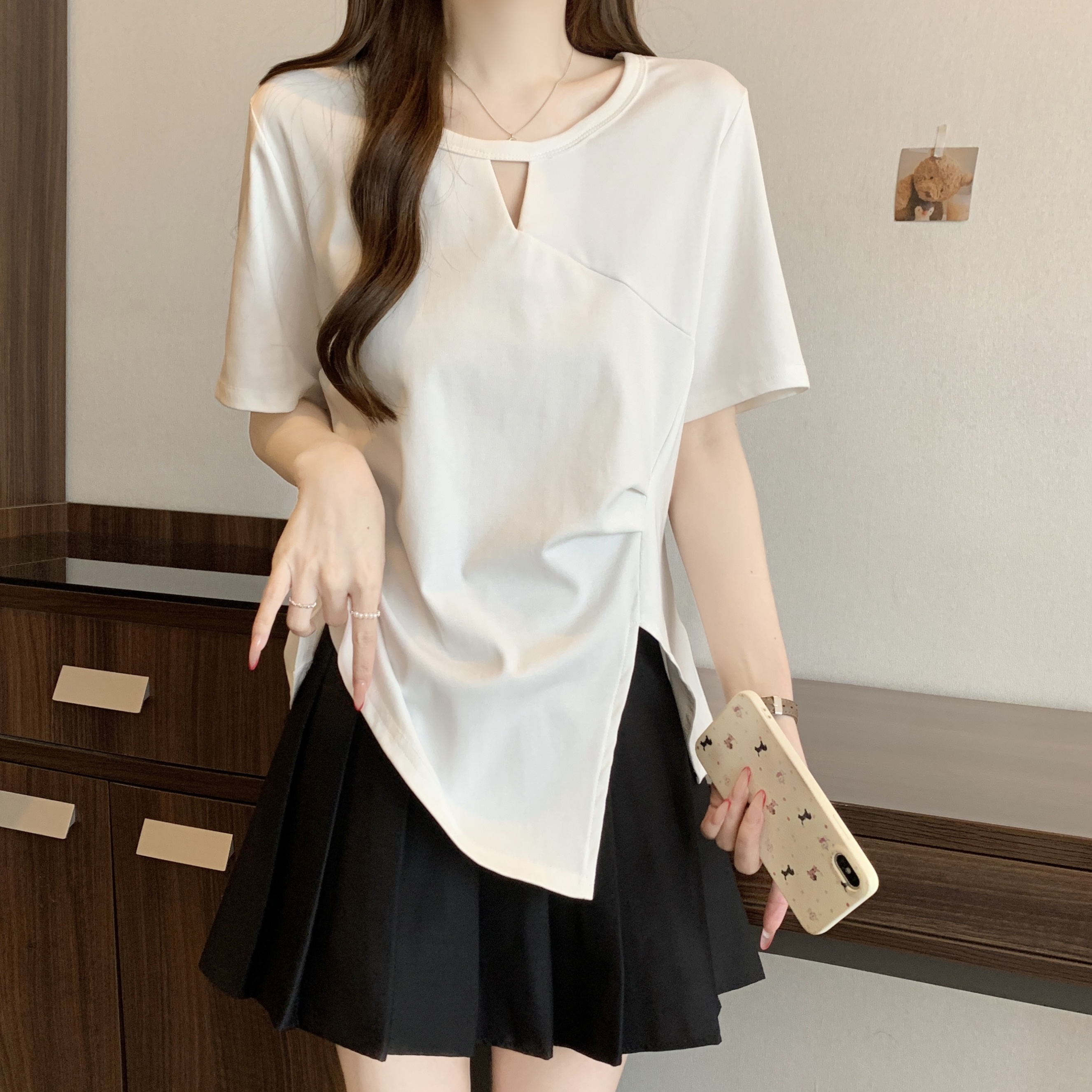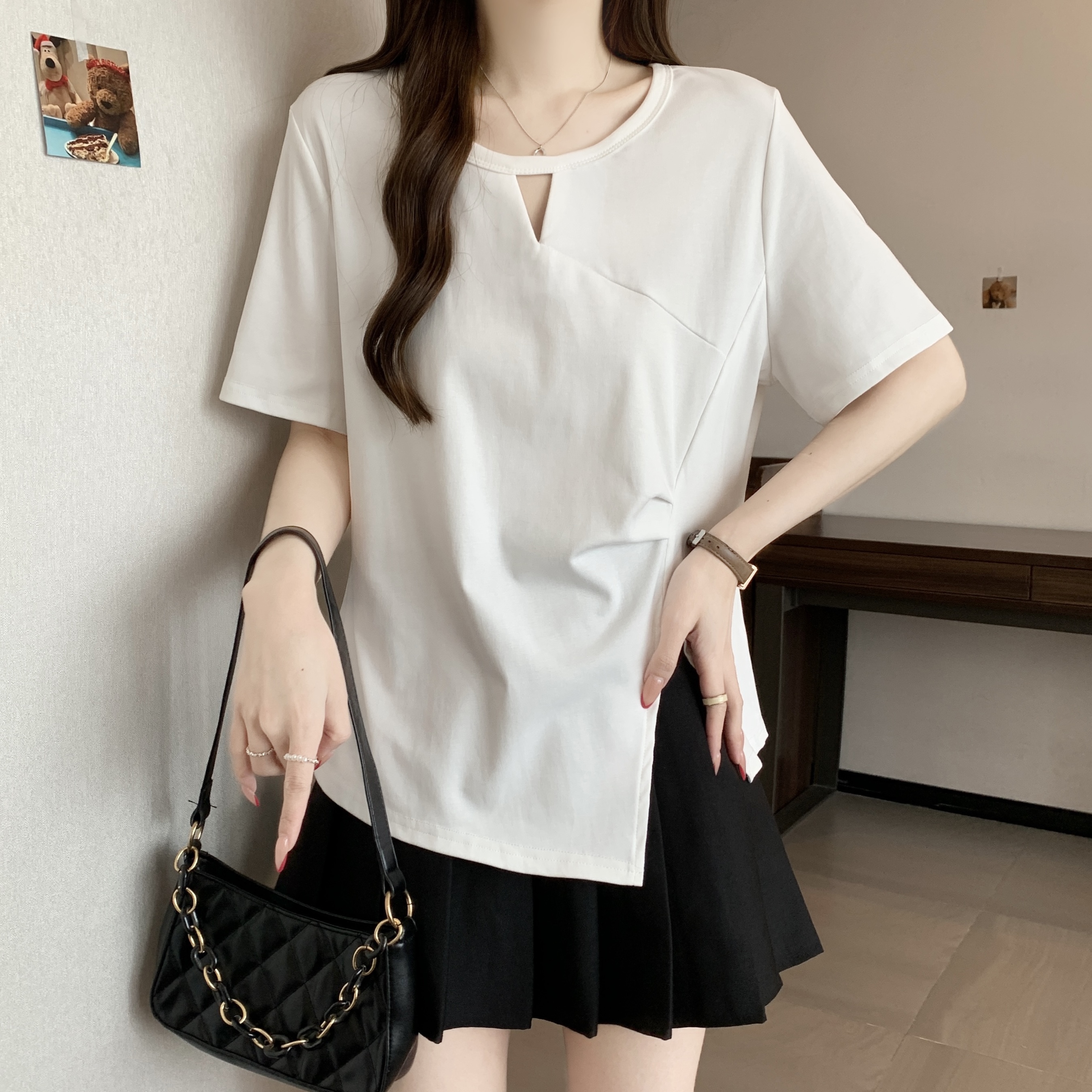 실사 빅 사이즈 불규칙 홀로우 아웃 디자인 센스 주름 티셔츠 지방 mm 슬림해 보이는 긍정적 인 어깨 반팔 허리 수축 맨위 여성 여름