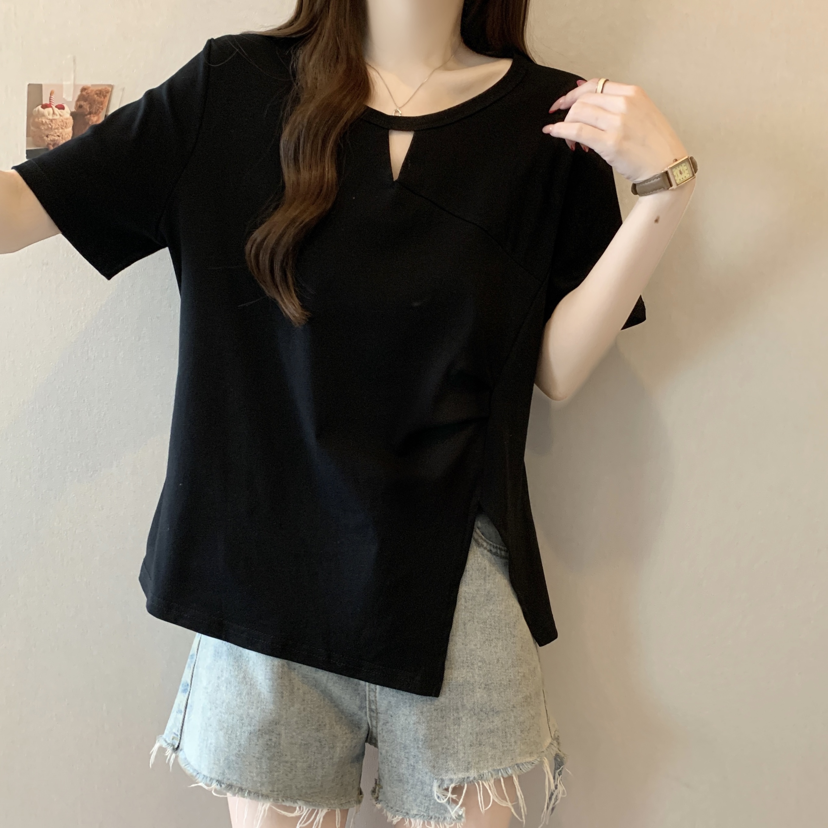 실사 빅 사이즈 지방 mm 디자인 센스 작은 심장 기계 행침 목 홀로우 아웃 오프숄더 외국 가스 다용도 티셔츠 맨위