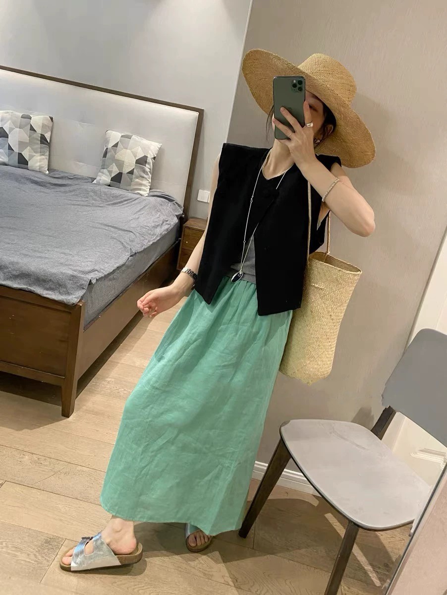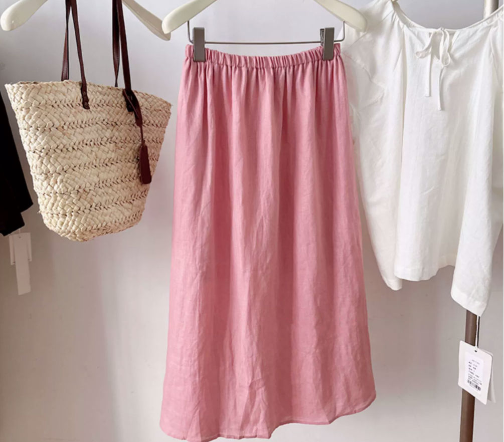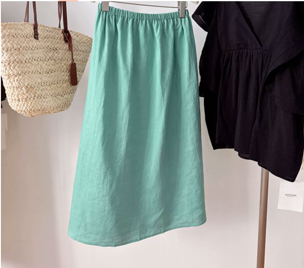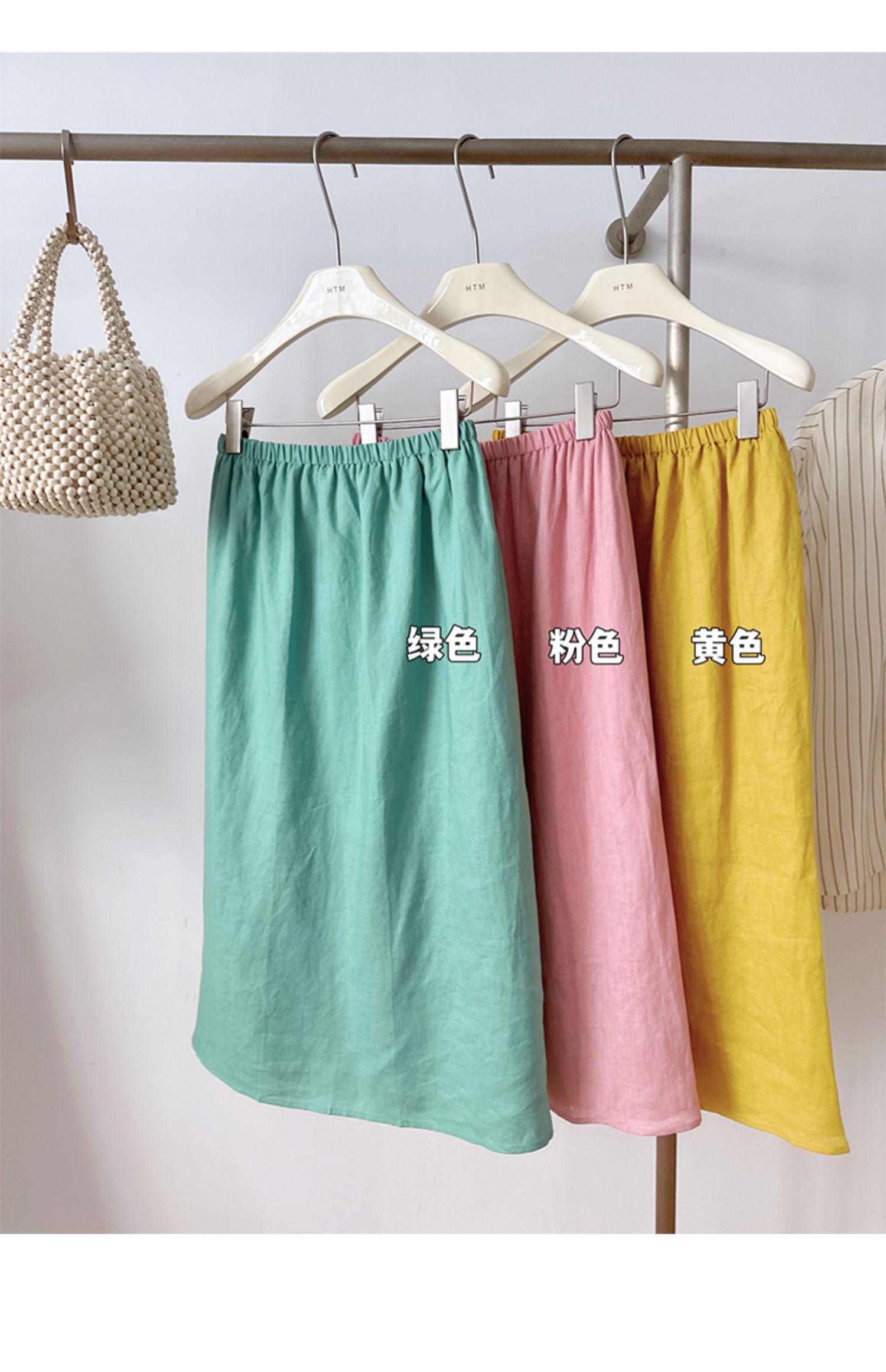 실사 일본식 레트로 면 린넨 반신 스커트 여름 얇은 스타일 작은 키 트임 밴딩 하이웨이스트 스트레이트 한 마디 롱 스커트
