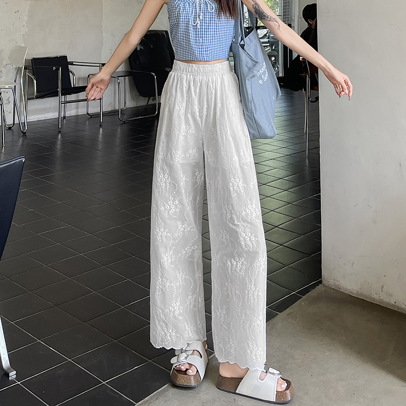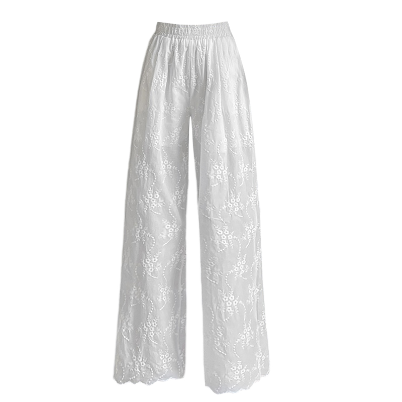 실사 화이트 자수 자수 홀로우 아웃 스트레이트 캐주얼 바지 여성 면 100% 레이스 조각 스트레이트 하이웨이스트 넓은 다리 길이 바지
