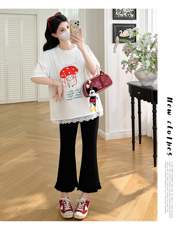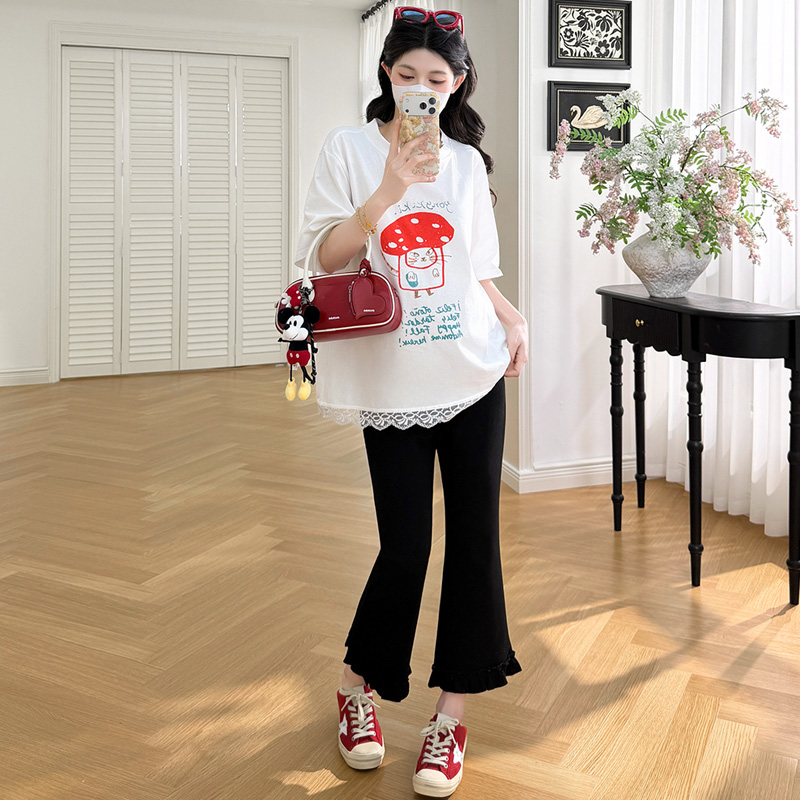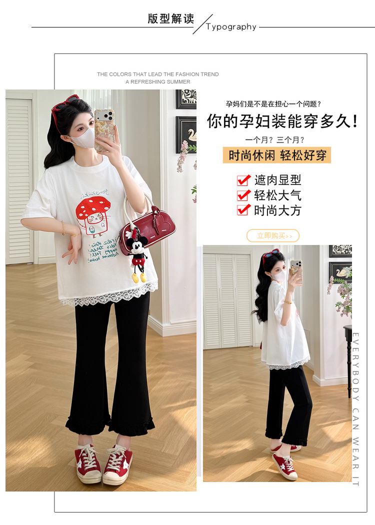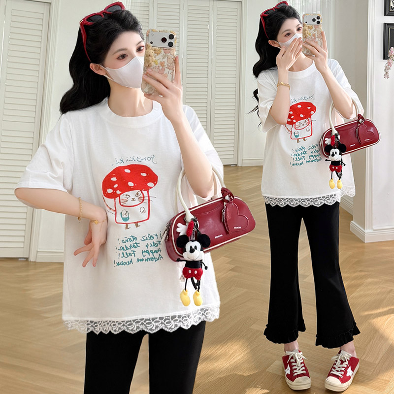 실사 지금 임산부 봄 여름 외출용 디자인 센스 루즈핏 다용도 연령 감소 티셔츠 펌프 로프 슬림해 보이는 바지 세트