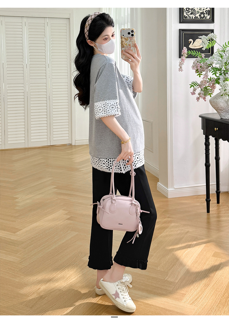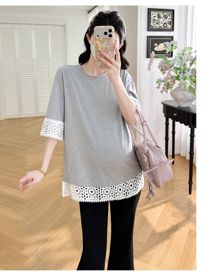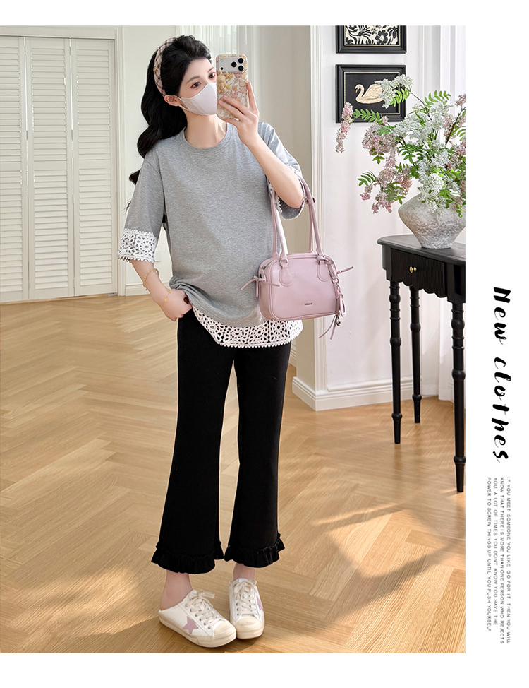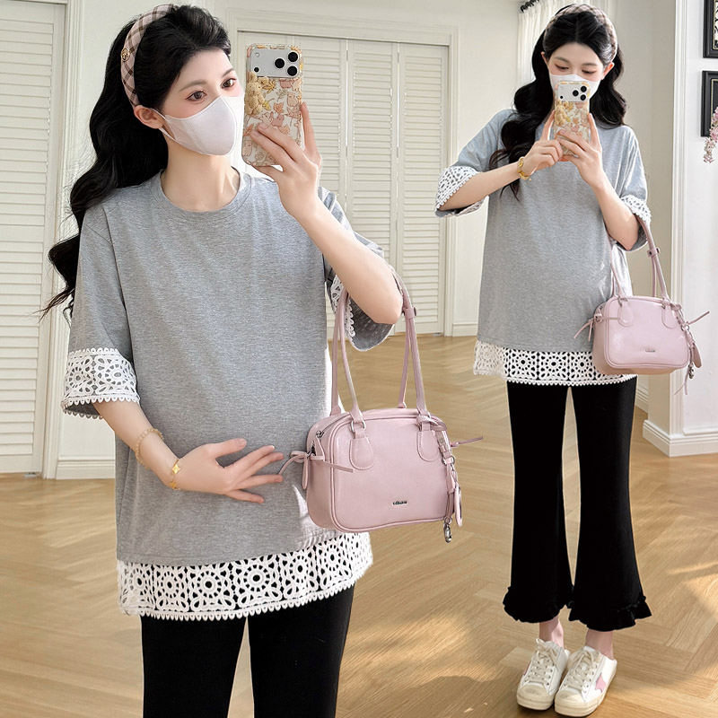 실사 지금 임산부 봄 여름 외출용 디자인 센스 루즈핏 다용도 연령 감소 티셔츠 펌프 로프 슬림해 보이는 바지 세트