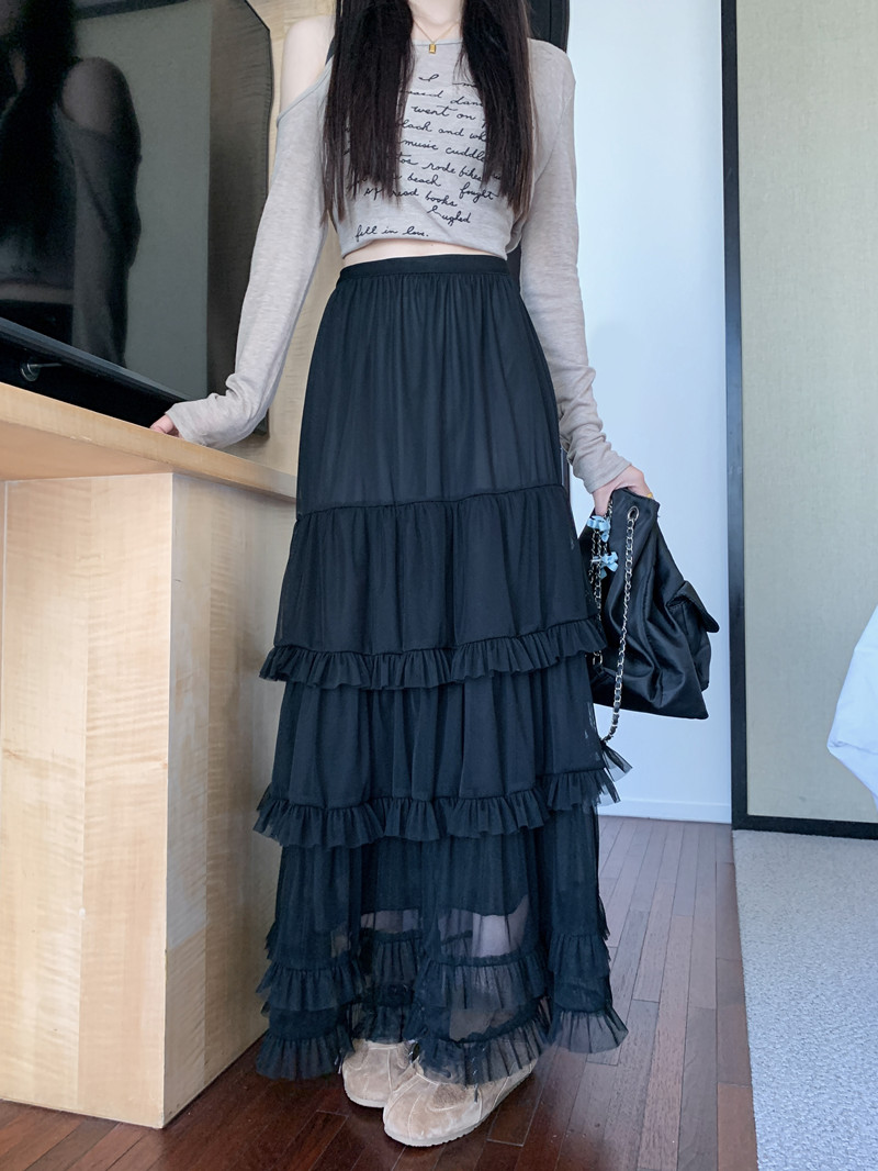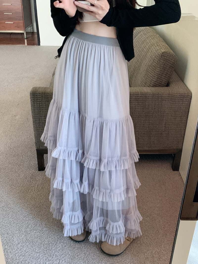 봄 여름 불규칙 망사 반신 스커트 빅 사이즈 여성 의류 하이웨이스트 프릴 퍼프 스커트 길다 치마 한 마디 케이크 드레스