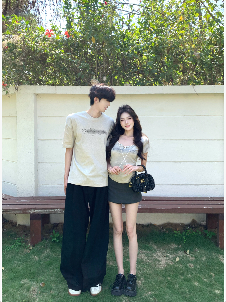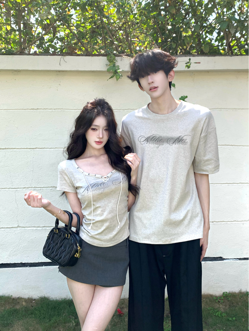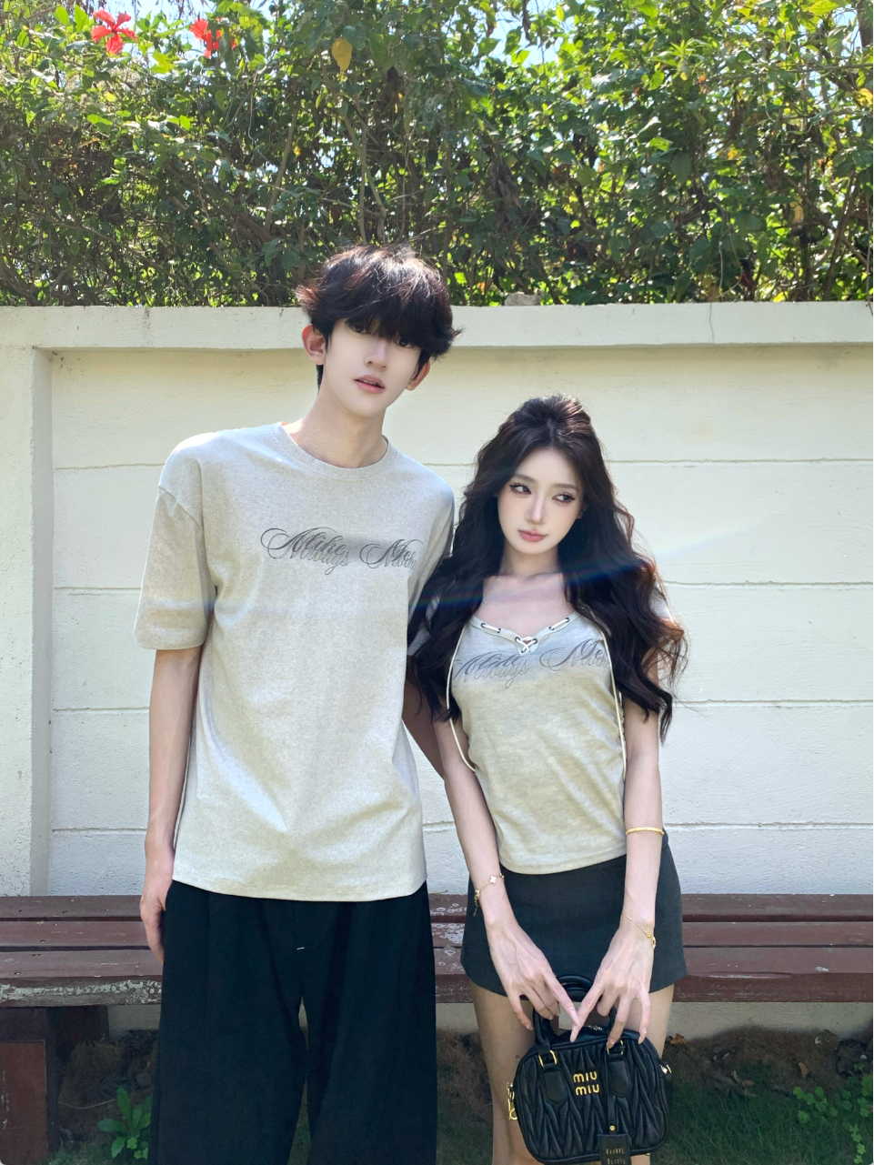 실사 아메리칸 레트로 핫걸 쇼트 스타일 수신 Pleat 곡선 알파벳 프린트 끈 반팔 커플룩