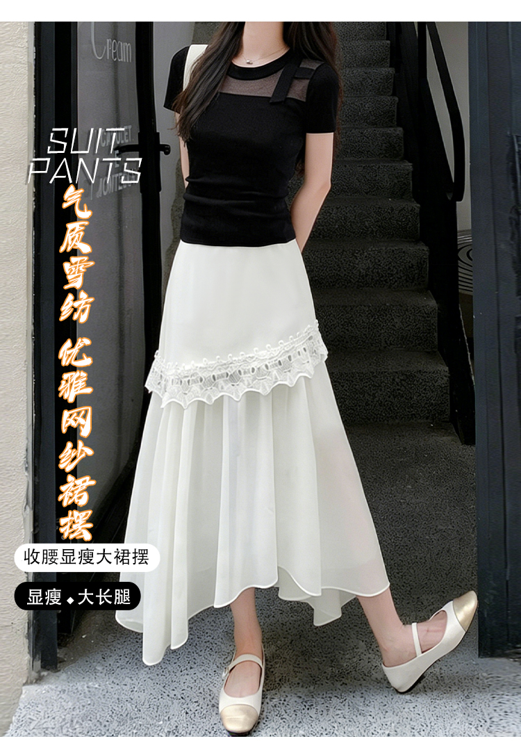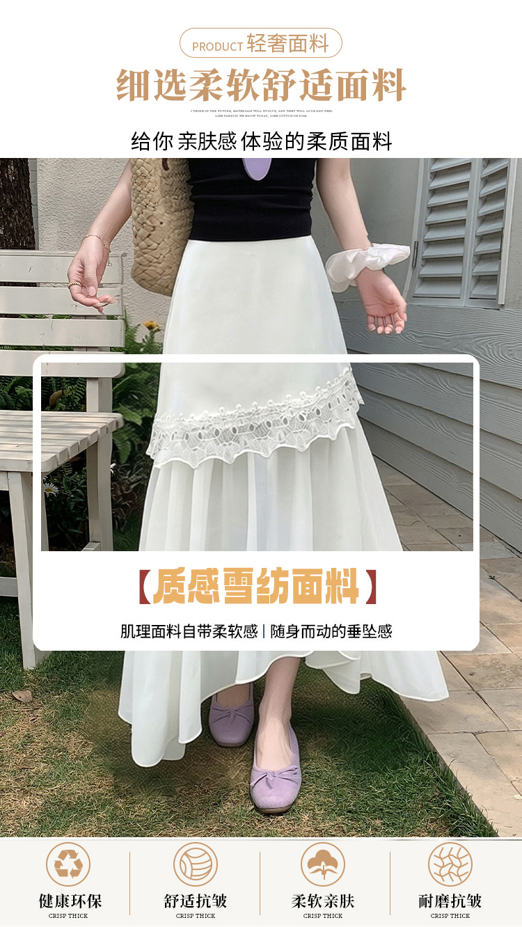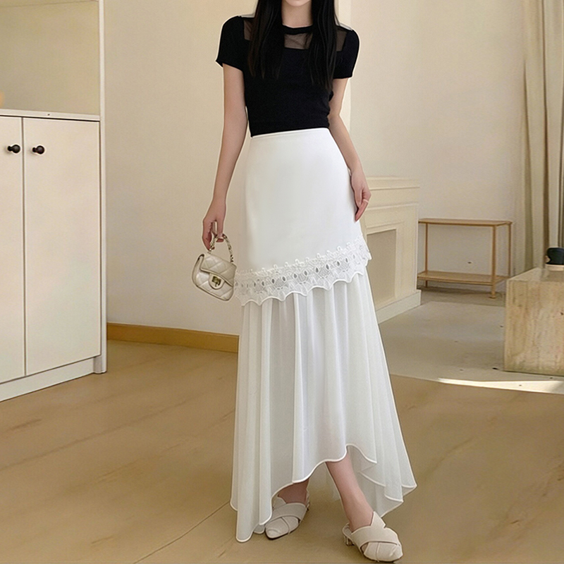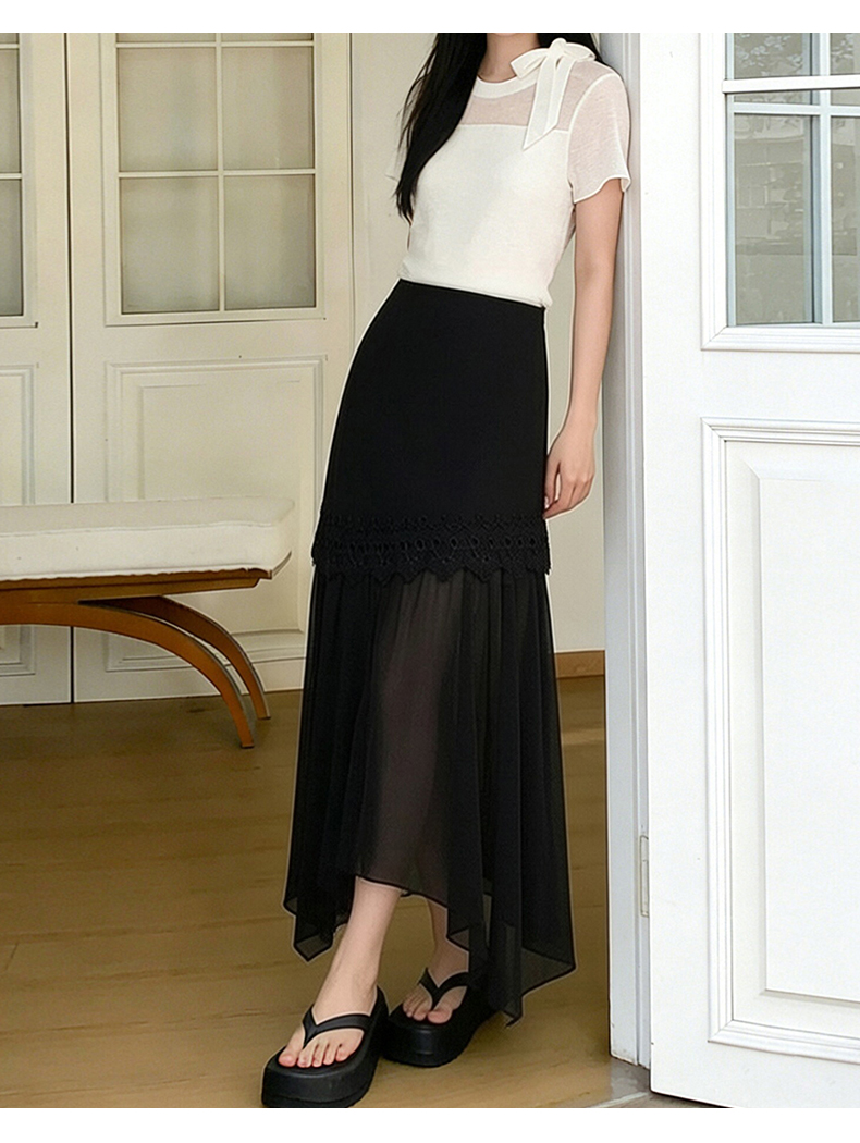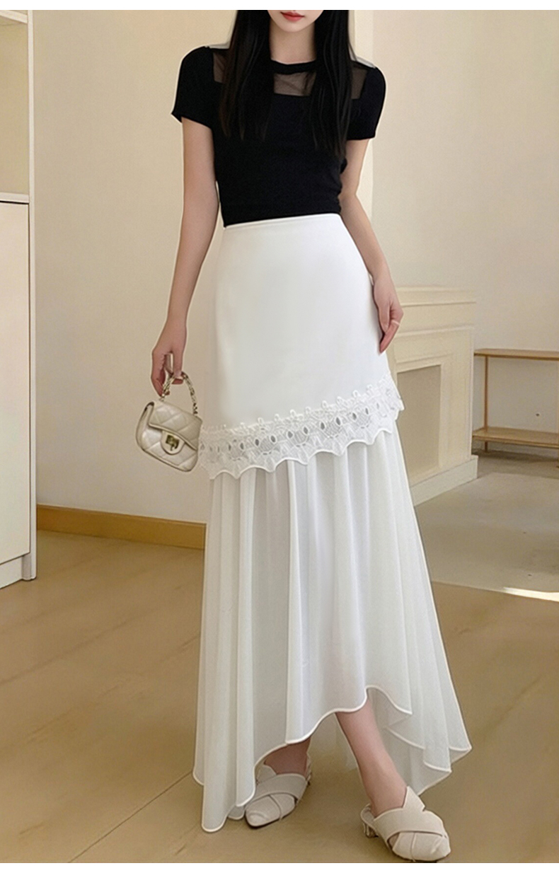실사 봄 여름 새로운 출퇴근 바람 레이스 레이스 명중 재료 패치워크 쉬폰 불규칙 A라인 스커트 계층의 감각 반 스커트