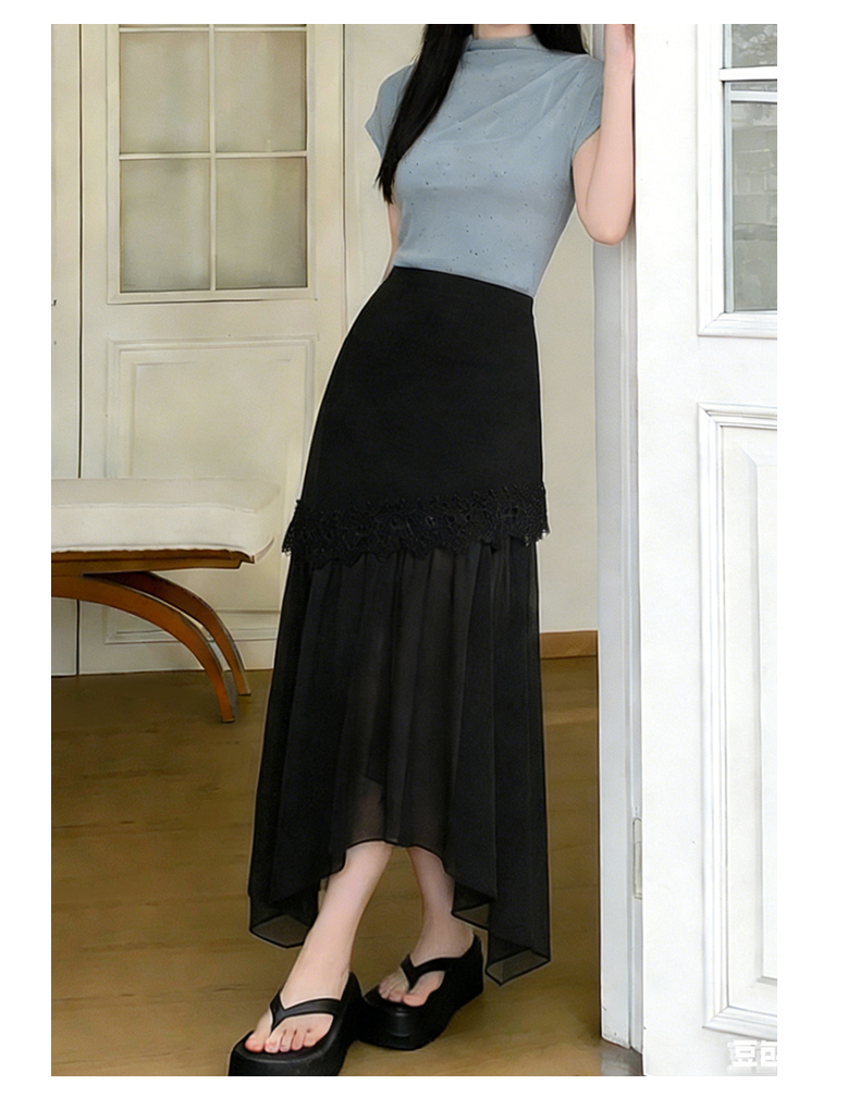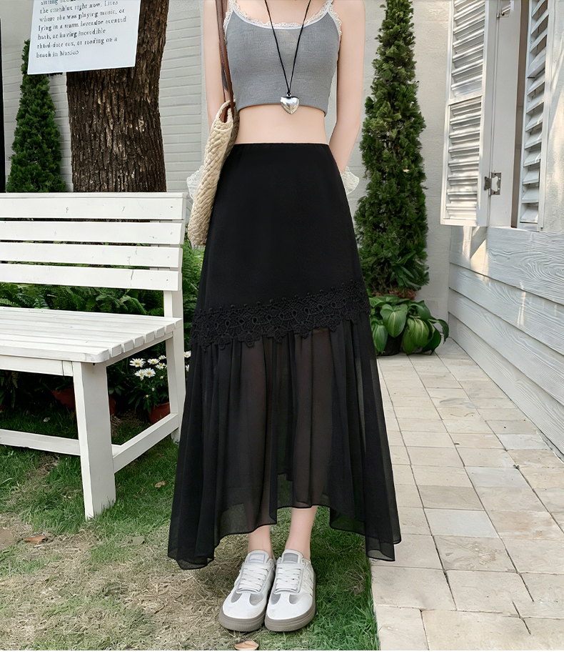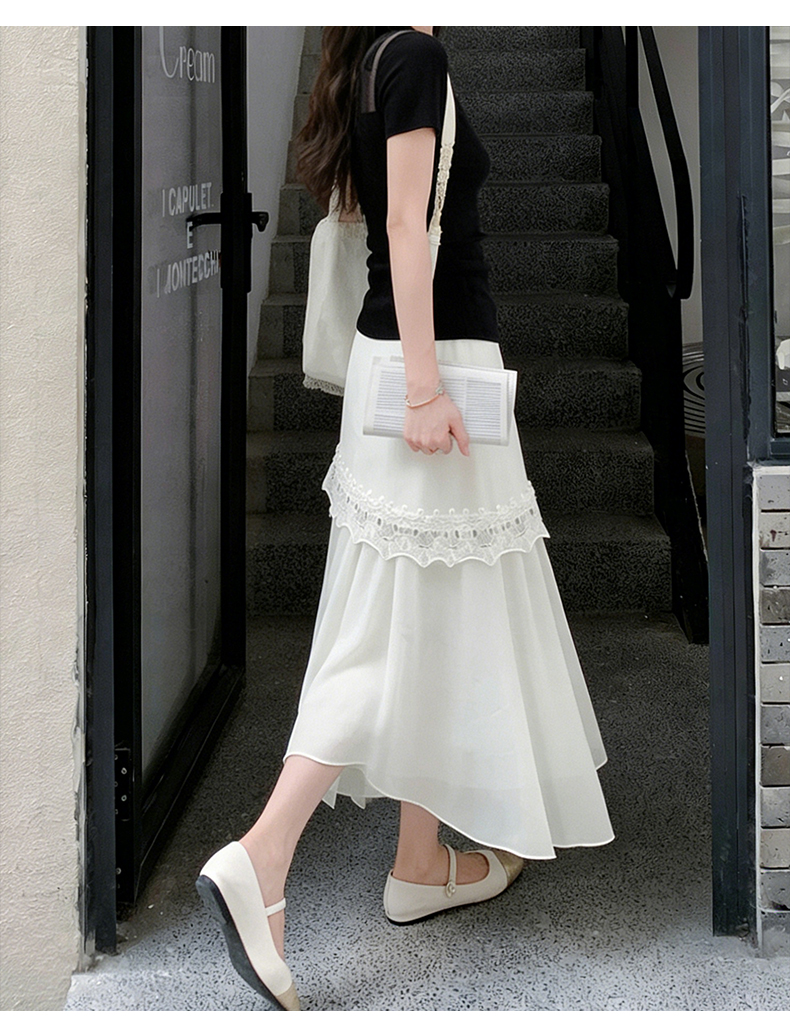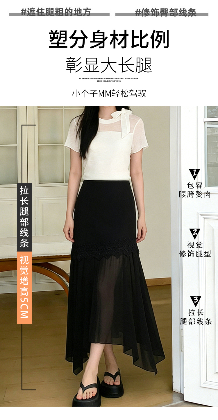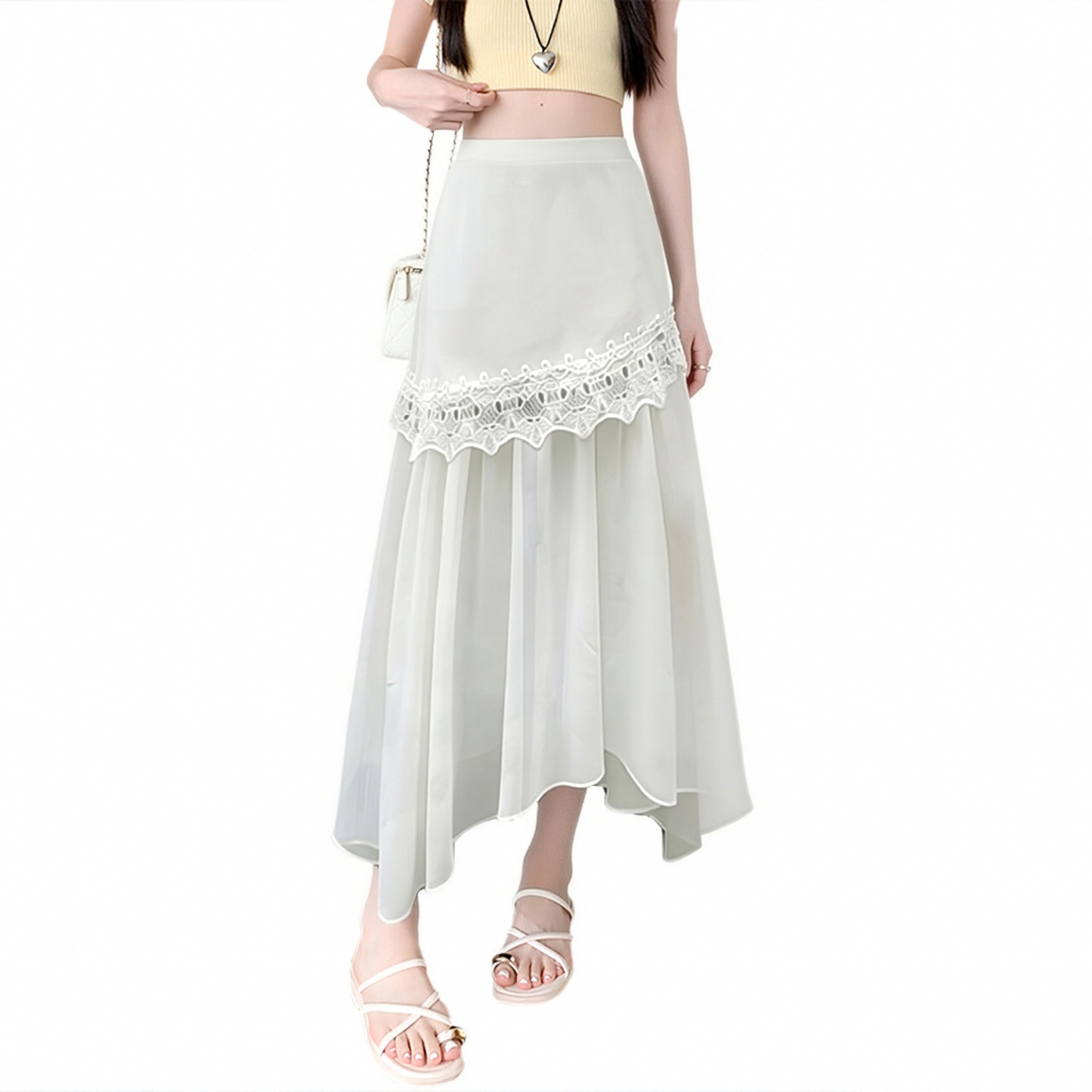 실사 봄 여름 새로운 출퇴근 바람 레이스 레이스 명중 재료 패치워크 쉬폰 불규칙 A라인 스커트 계층의 감각 반 스커트