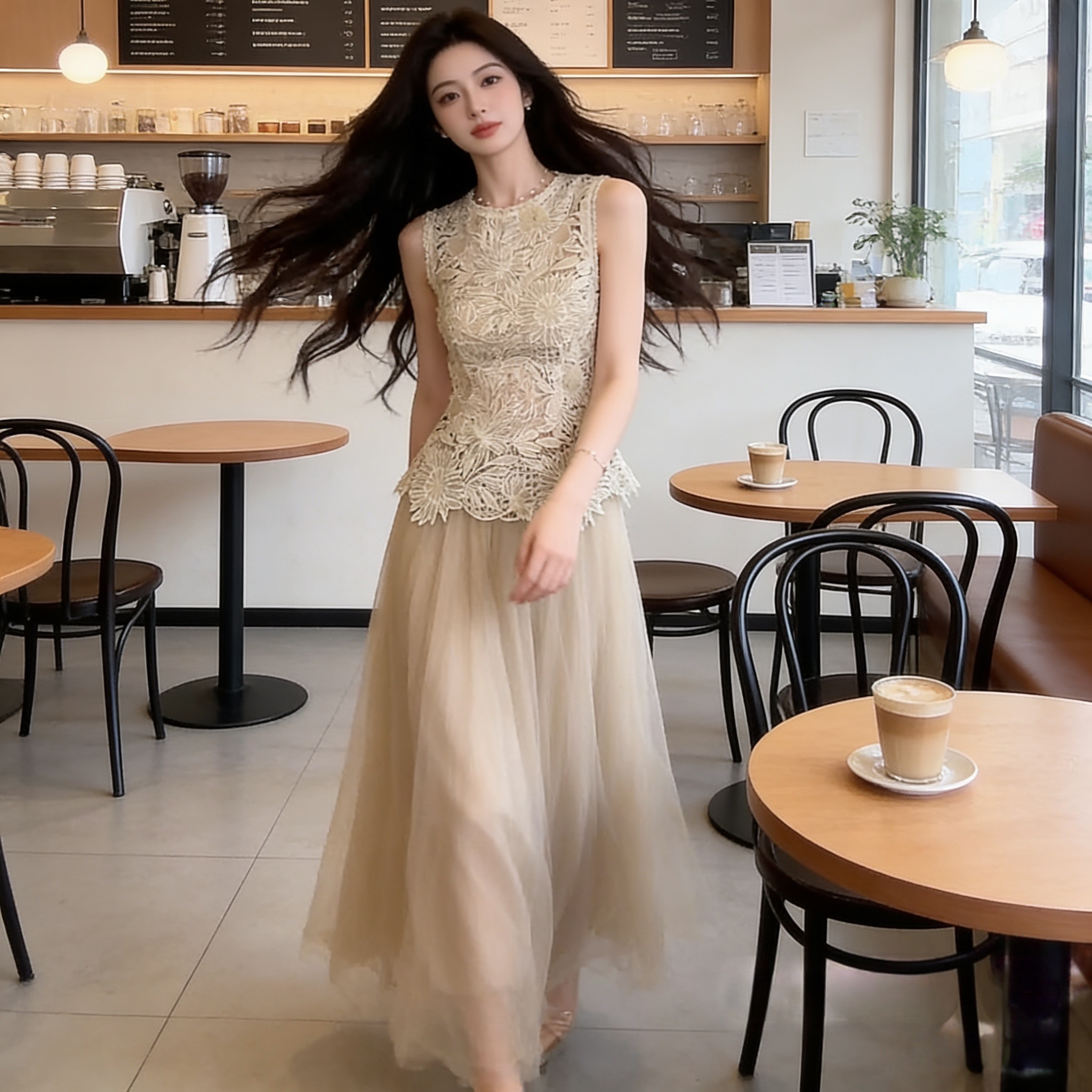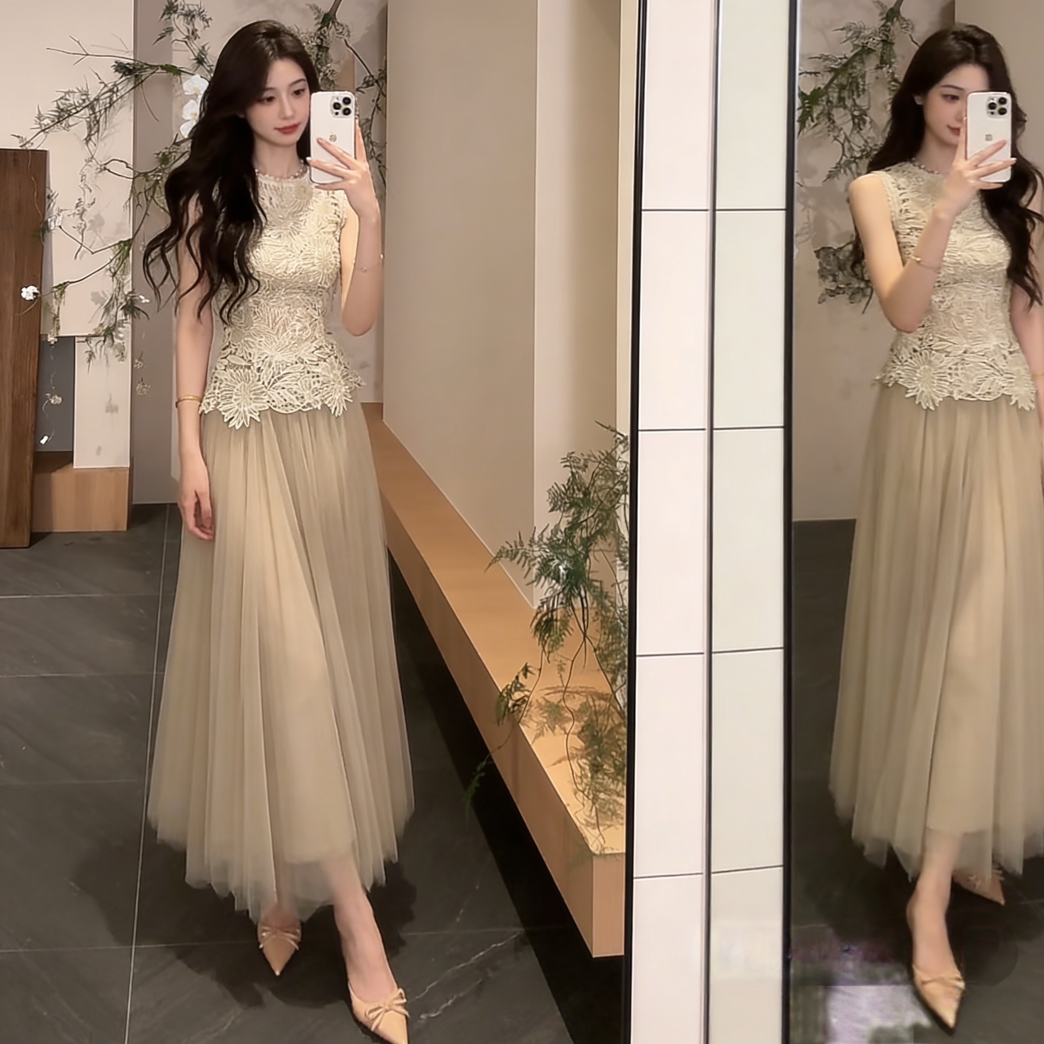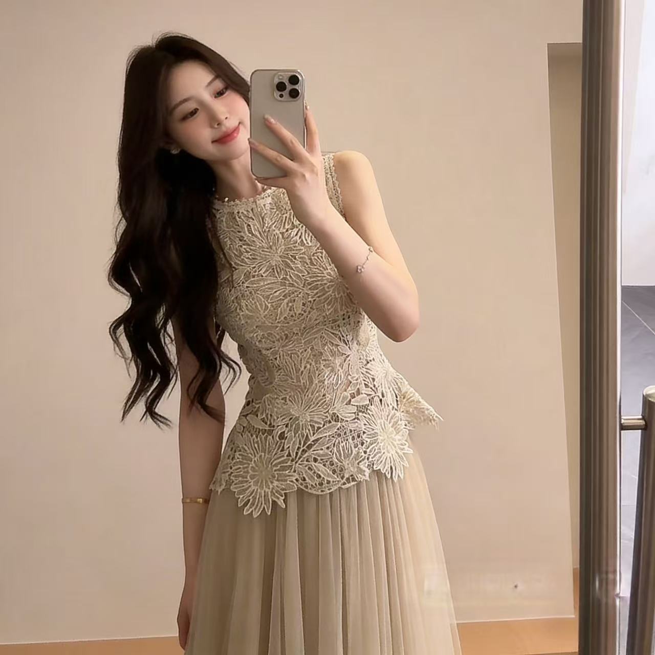 실사 정가 2026 새로운 여성 의류 맨위 레이스 레이스 코디 슬립 반신 스커트 거즈 스커트 세 조각 세트
