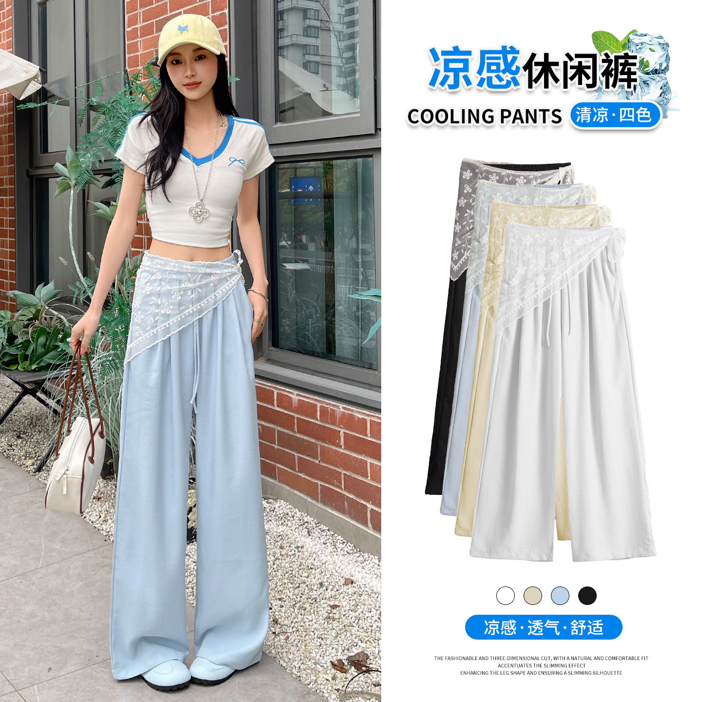 레이스 바람 살구 색상 레이스 넓은 다리 캐주얼 바지 여성 여름 새로운 하이웨이스트 스트레이트 다용도 슬림해 보이는 자외선 차단 속도 건조한 바지