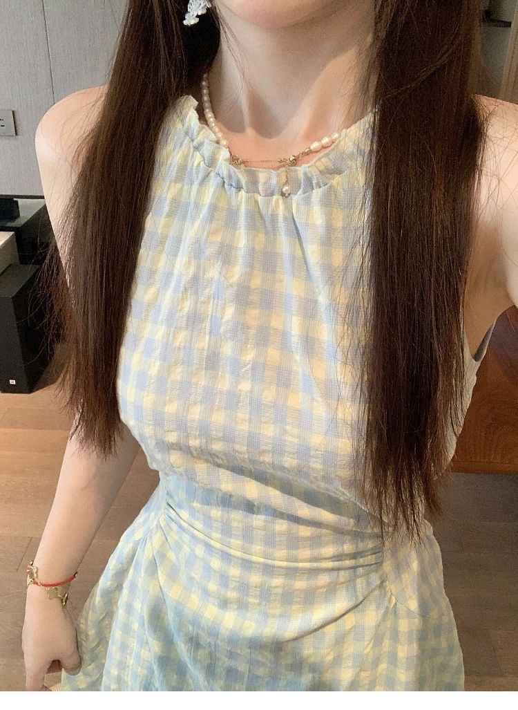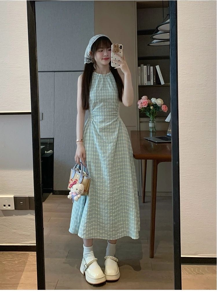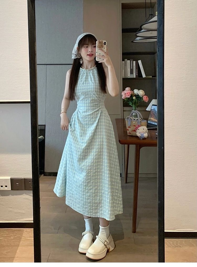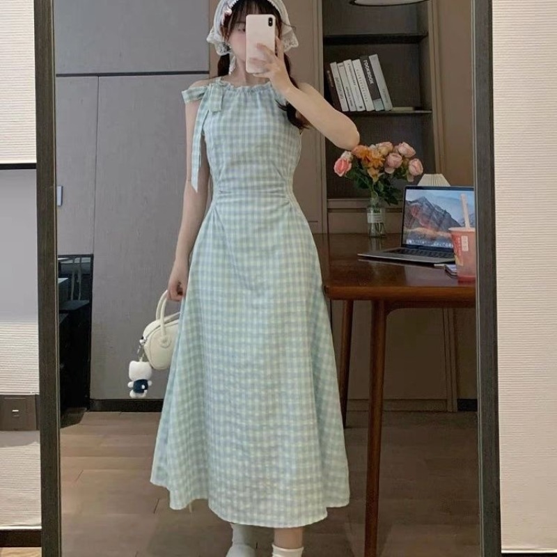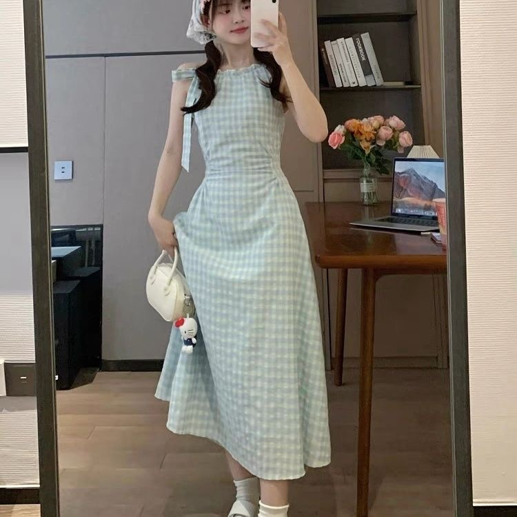 프랑스식 녹색 체크무늬 민소매 슬립 드레스 아이들 여름 2026 새로운 해변가 휴가 바람 허리 수축 롱 스커트