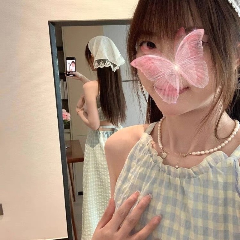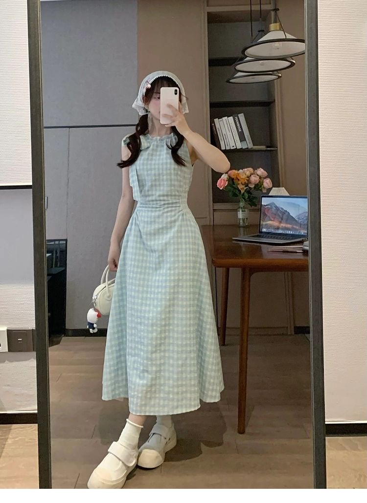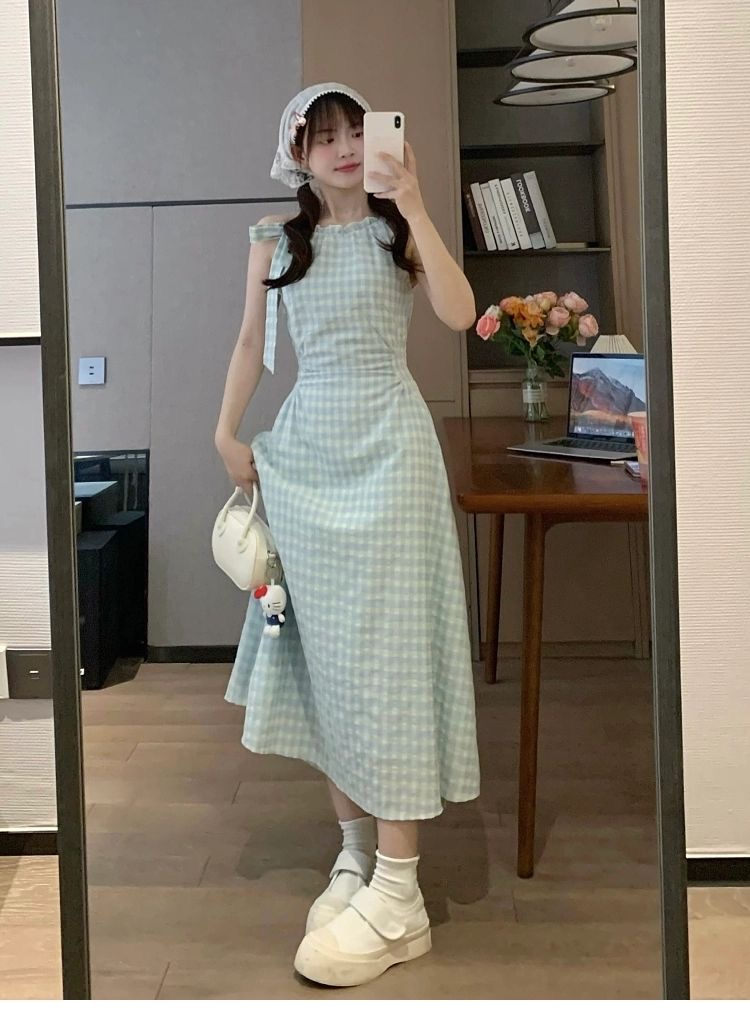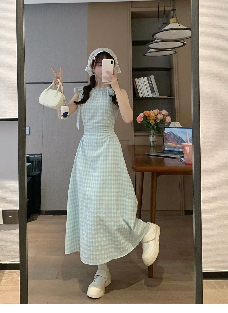 프랑스식 녹색 체크무늬 민소매 슬립 드레스 아이들 여름 2026 새로운 해변가 휴가 바람 허리 수축 롱 스커트