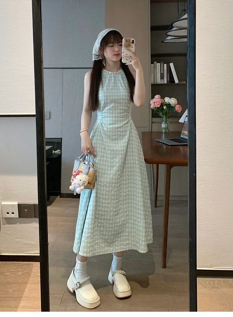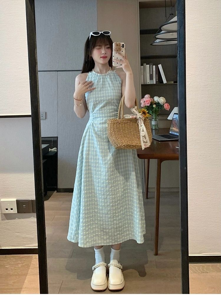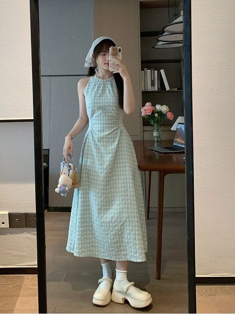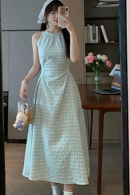 여름 프랑스식 부드러운 바람 행침 목 스타일 플리츠 조끼 여성 드레스 품격 민소매 헤일로 염색 휴가 바람 길다 치마