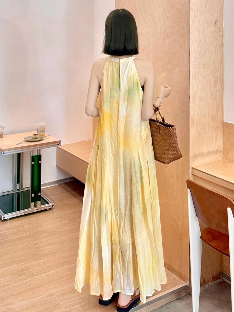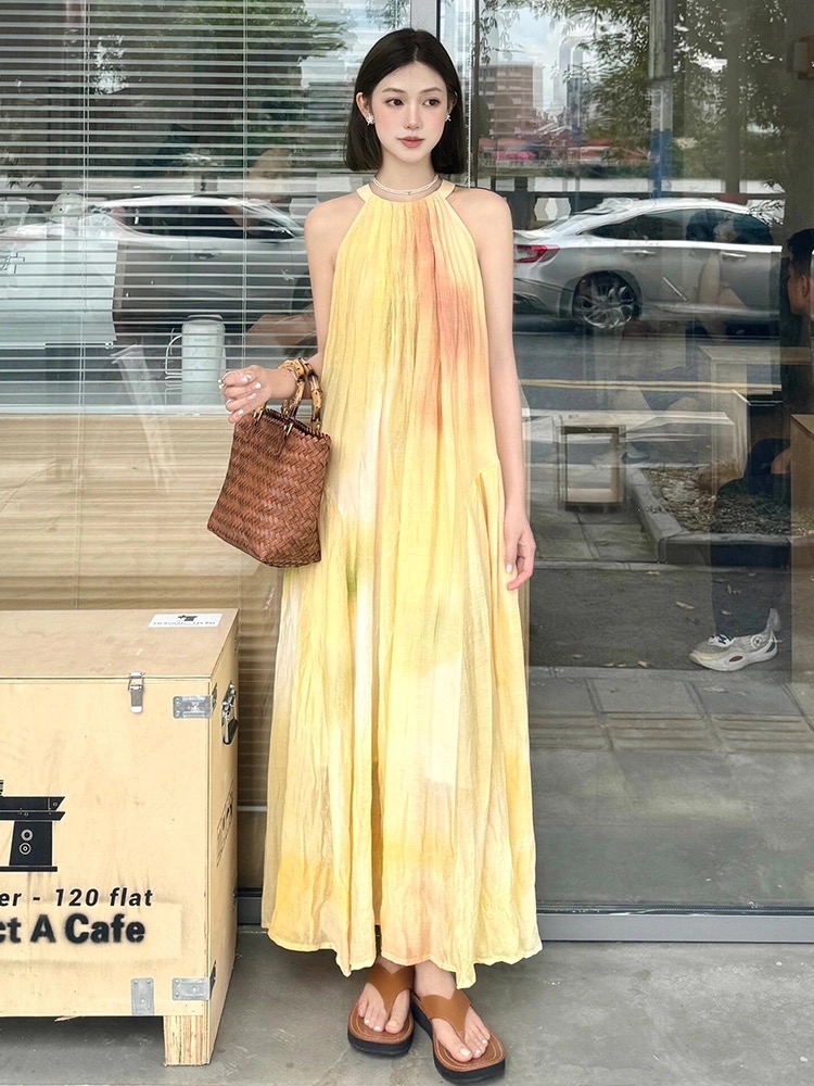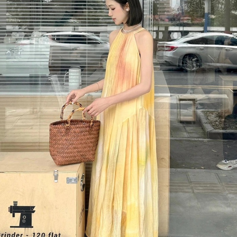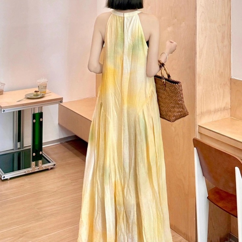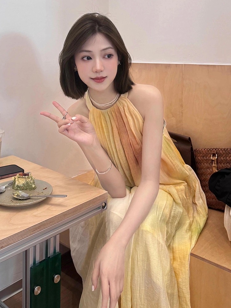 여름 프랑스식 부드러운 바람 행침 목 스타일 플리츠 조끼 여성 드레스 품격 민소매 헤일로 염색 휴가 바람 길다 치마