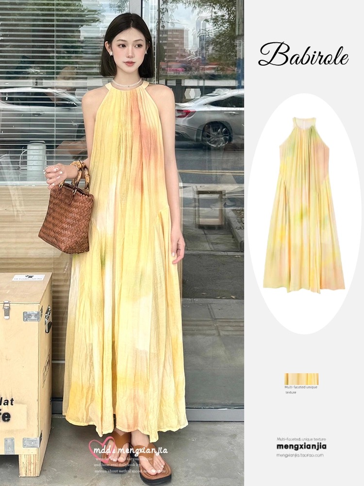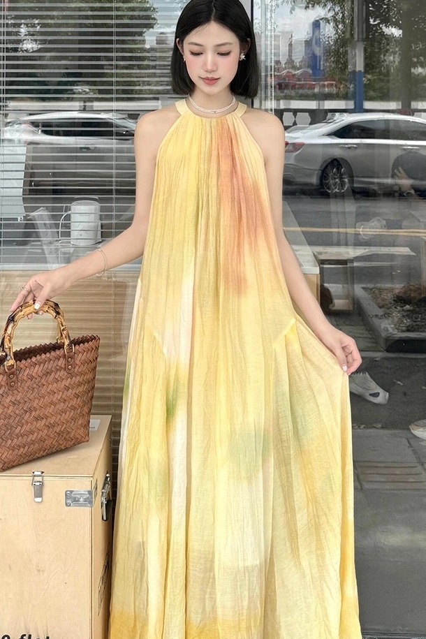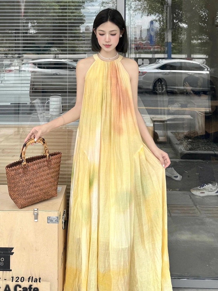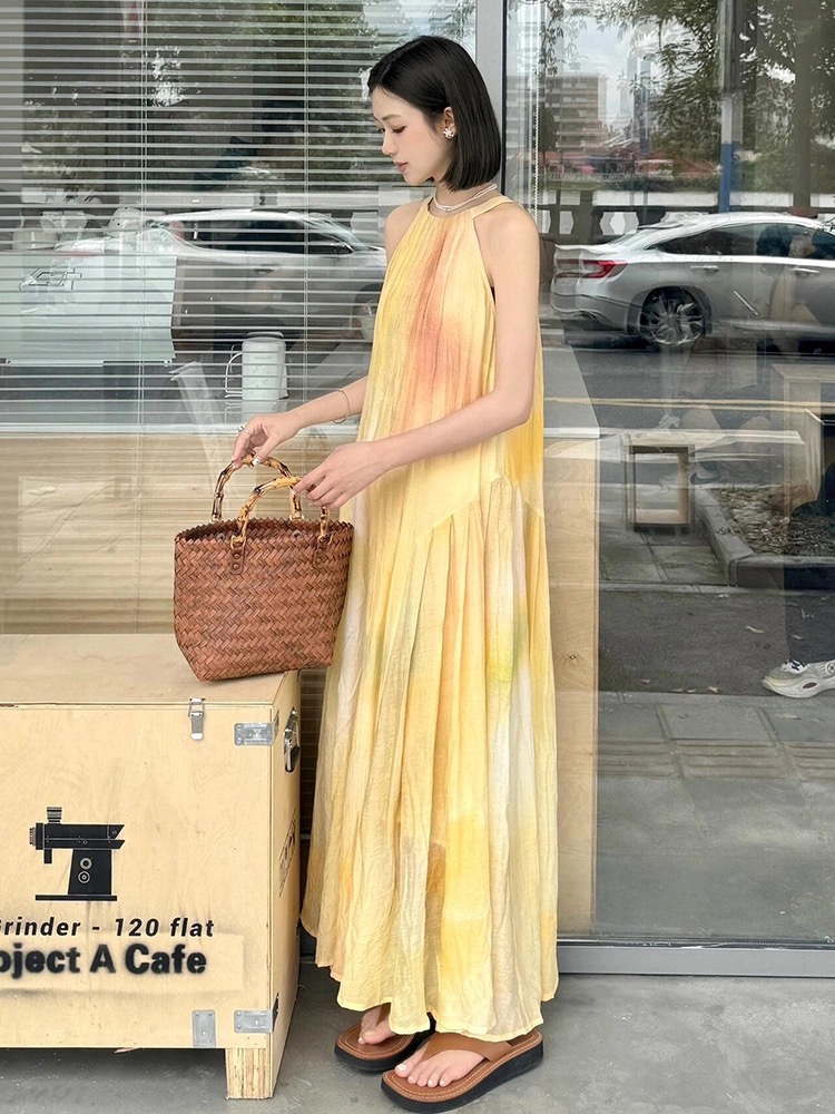 여름 프랑스식 부드러운 바람 행침 목 스타일 플리츠 조끼 여성 드레스 품격 민소매 헤일로 염색 휴가 바람 길다 치마