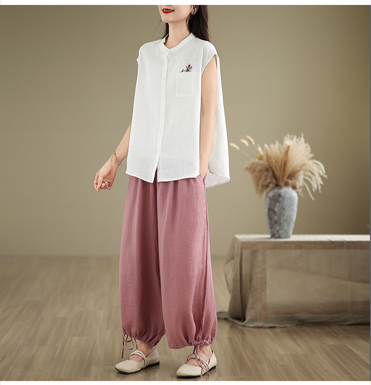 여름 섹션 신제품 오리지널 면 린넨 루즈핏 캐주얼 7 점 와이드 레그 팬츠 둘 착용 펌프 로프 바지 빅 사이즈 단색 바지