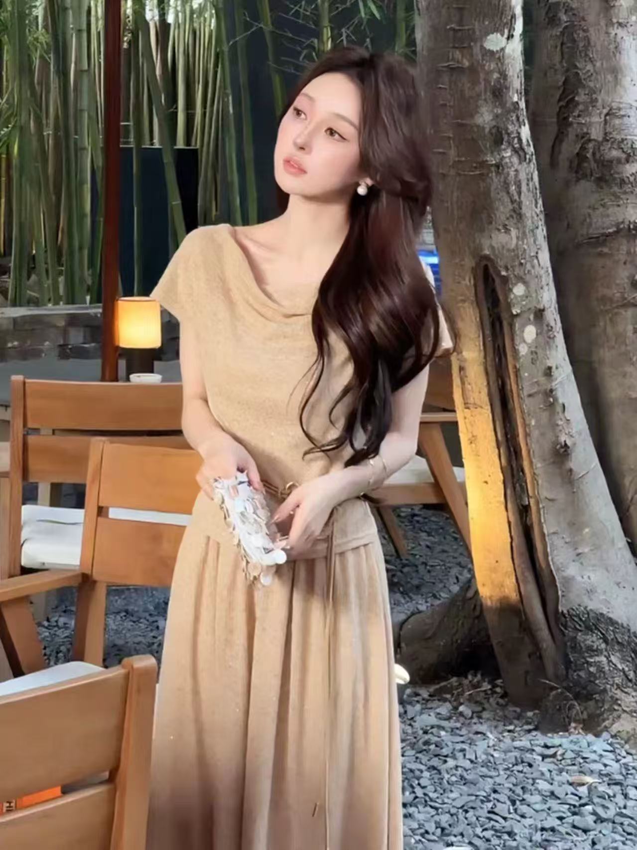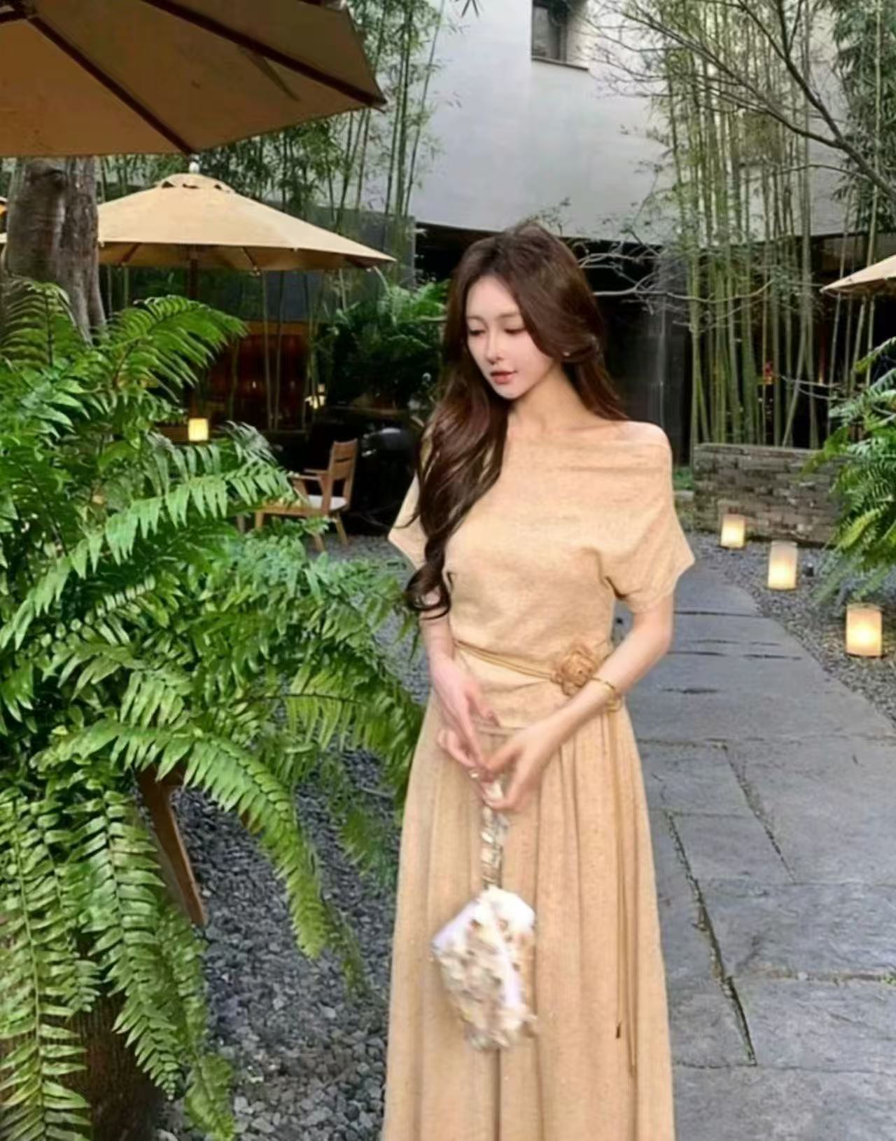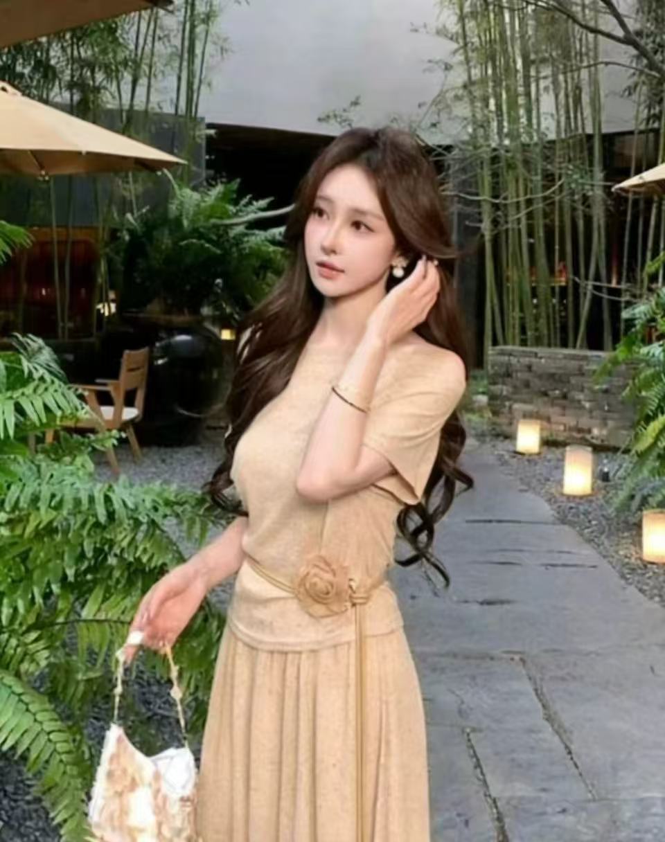 새로운 한국 스타일 패션 캐주얼 스트랩 반팔 맨위 허리밴드 슬림해 보이는 반신 롱 스커트 투피스 세트