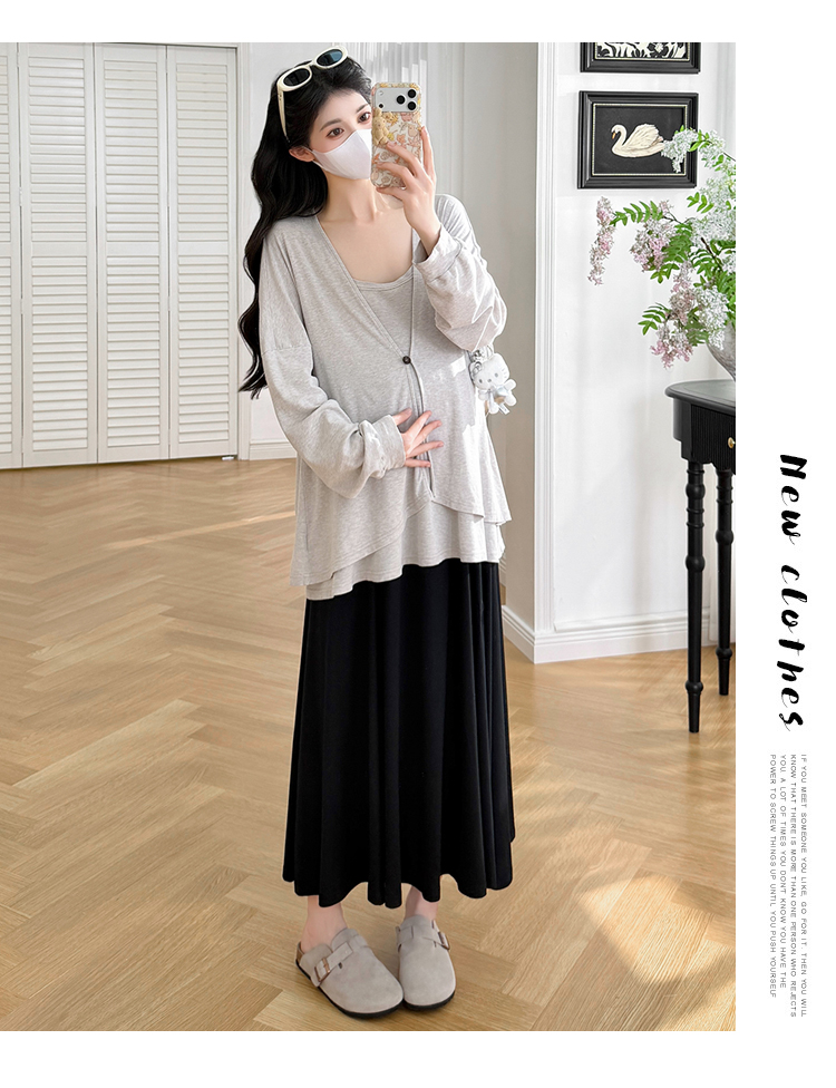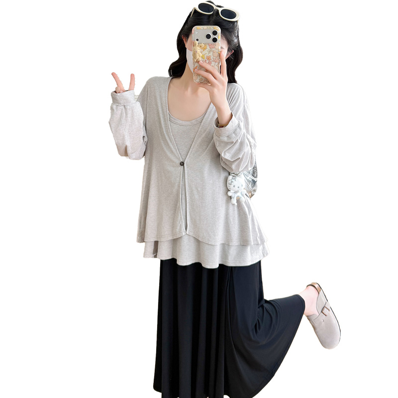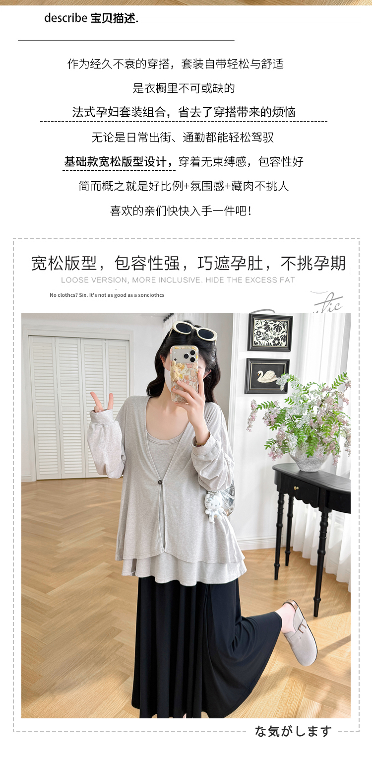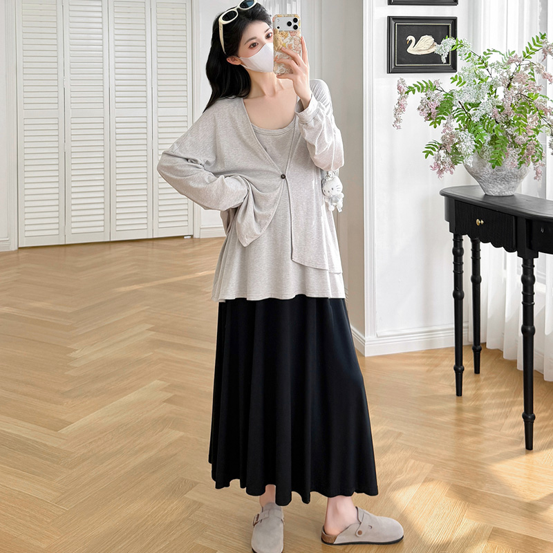 실사 신제품 임산부 봄 여름 외출용 디자인 센스 루즈핏 다용도 연령 감소 티셔츠 복부 지지 슬림해 보이는 치마 세트