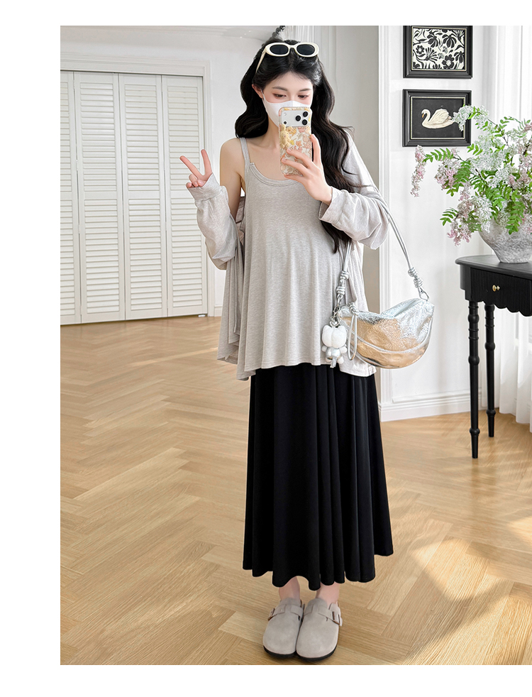실사 출산 착용 여름 드레스 패션 임산부 드레스 루즈핏 중간 길이 멜빵 치마 세트 외국 가스 트렌디 엄마 반팔