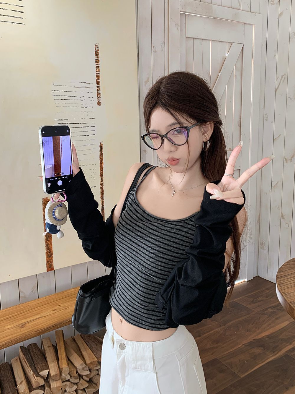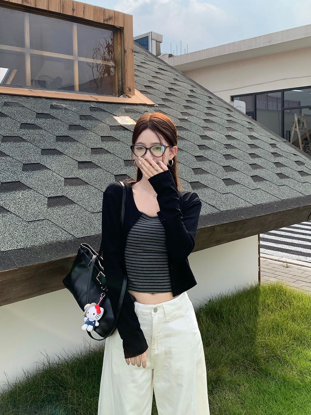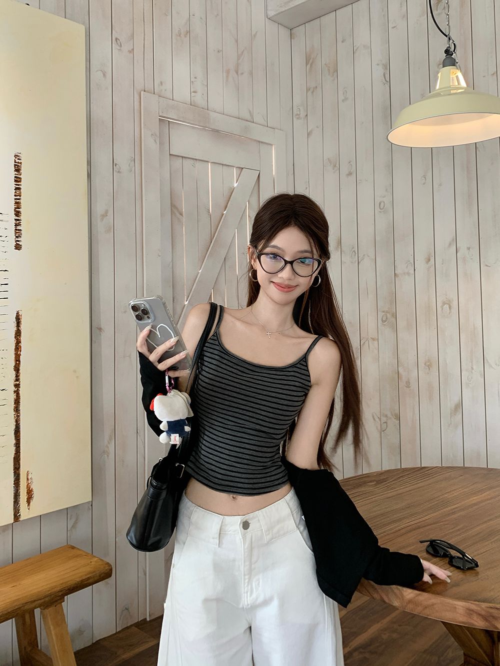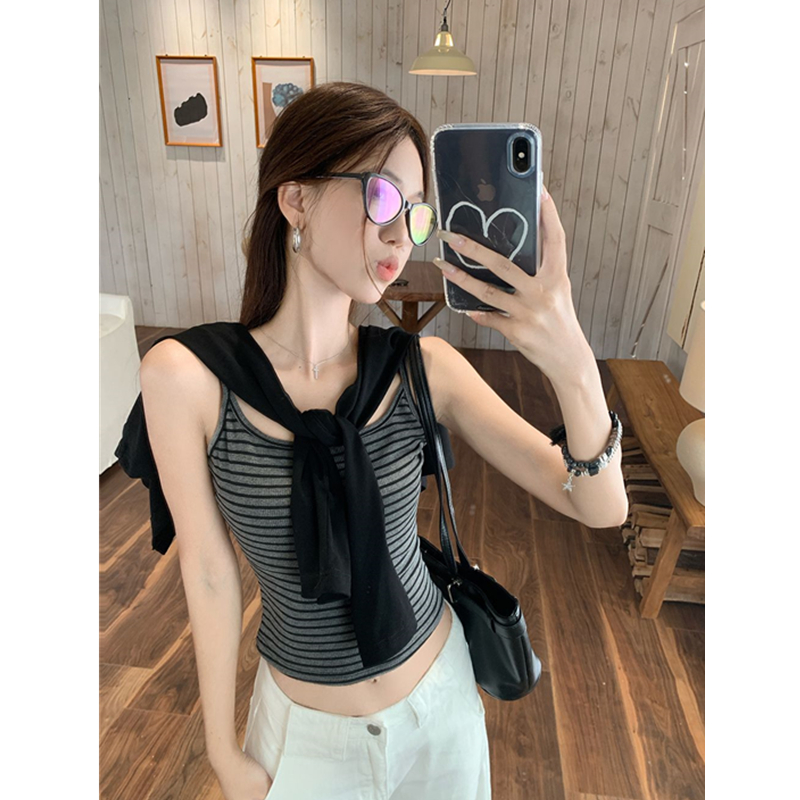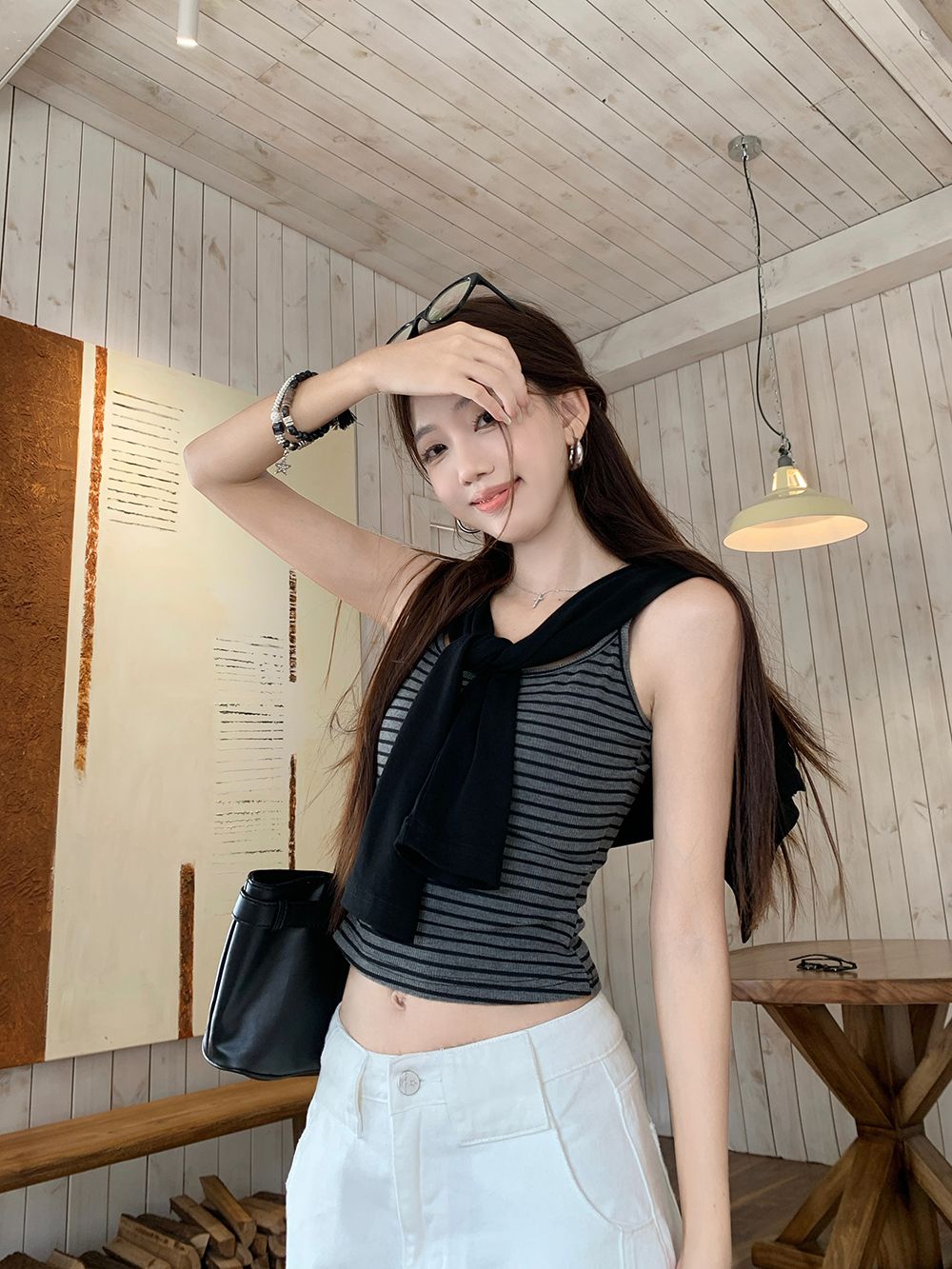 실사 정가 스트라이프 행침 목 백리스 조끼 품격 핫걸 흔들다 칼라 디자인 센스 쇼트 스타일 맨위 여성