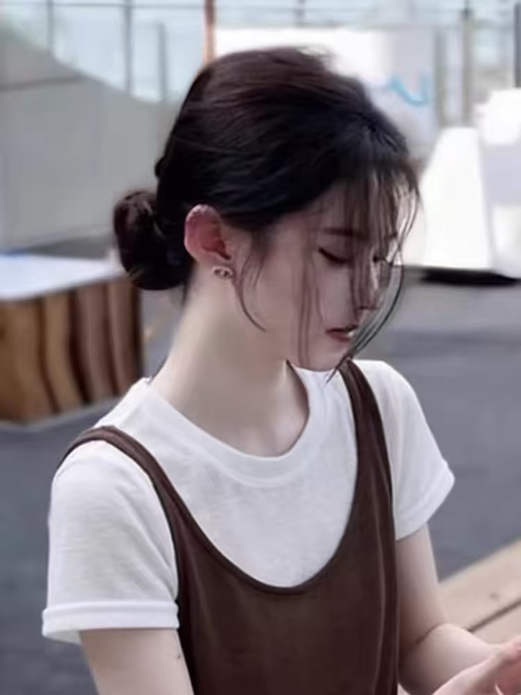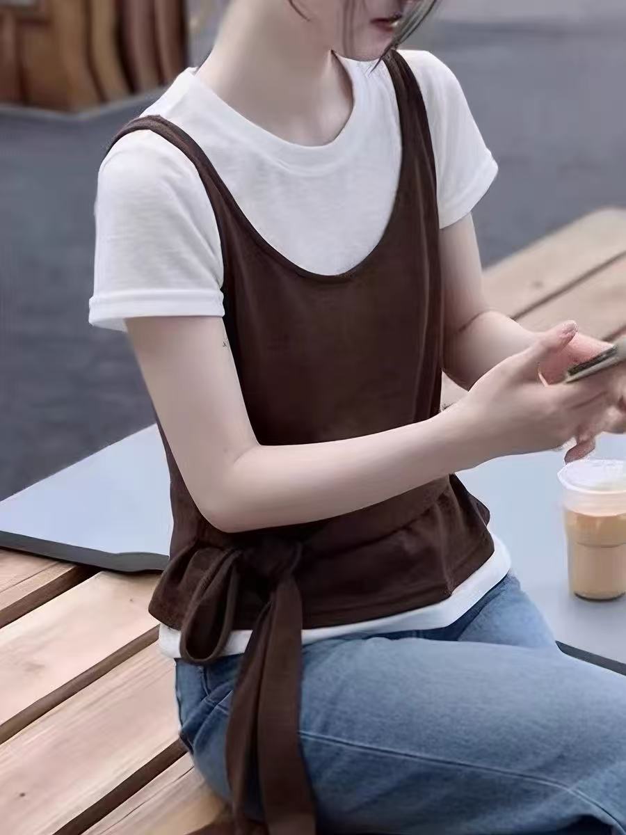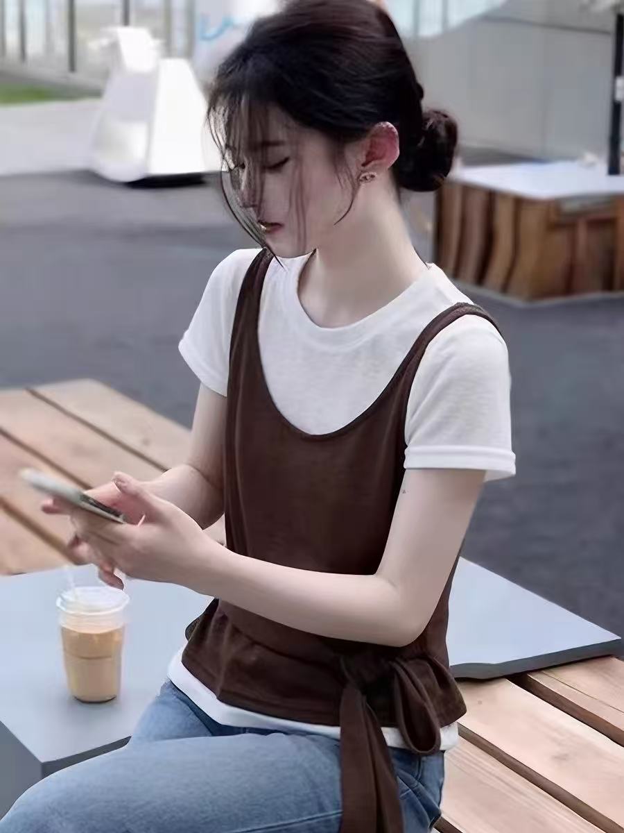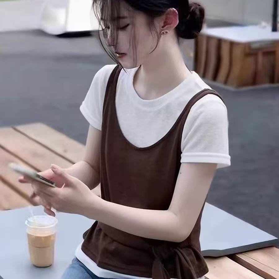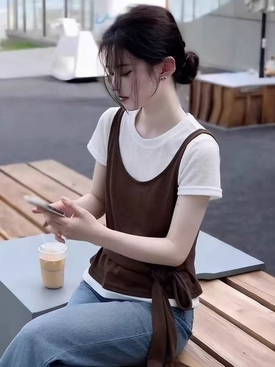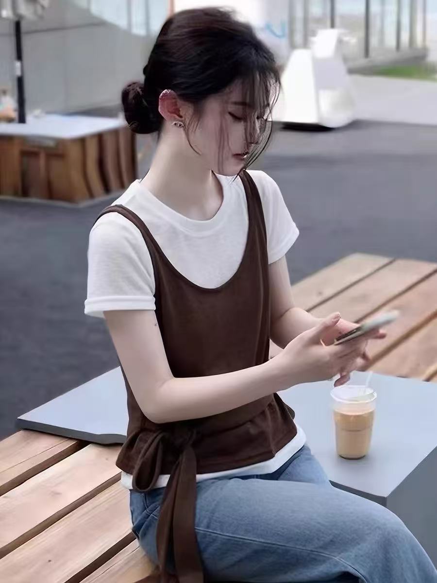 한 부서 페이크 레이어드 슬립 패치워크 반팔 티셔츠 여성 봄 여름 2026 슈퍼 화재 연령 감소 디자인 센스 외국 가스 맨위