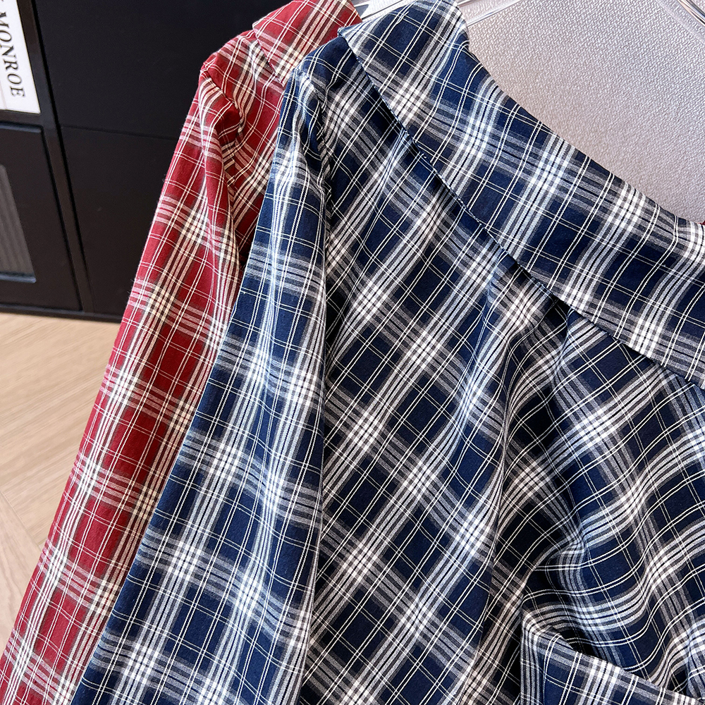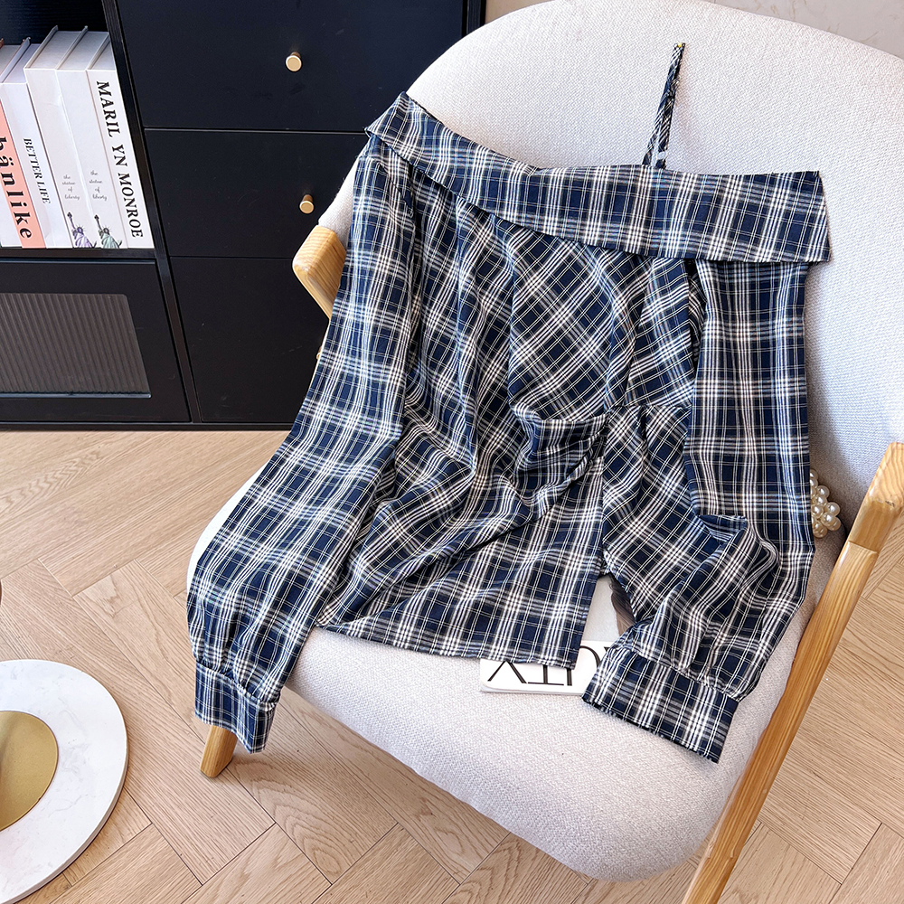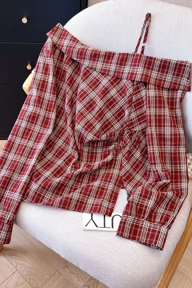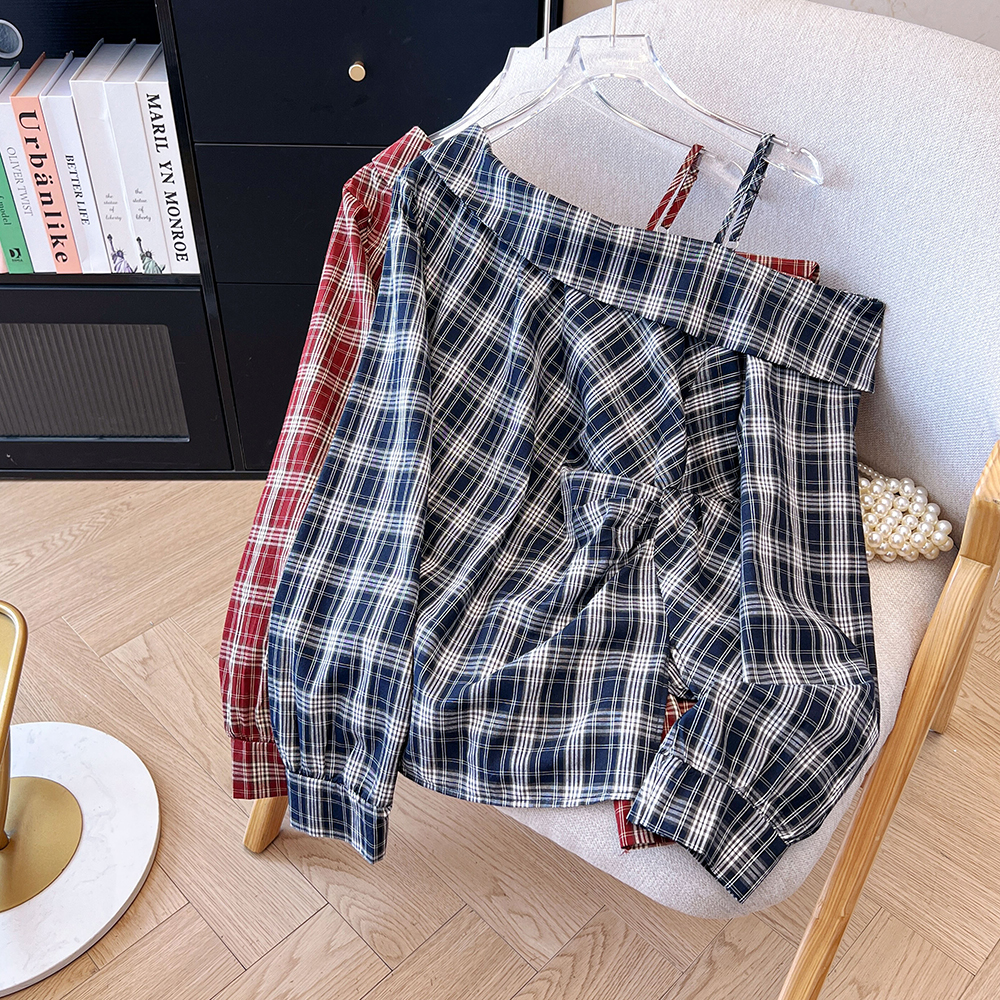 2026 봄 새로운 여성 패션 외국 가스 허리 수축 슬림해 보이는 다용도 비스듬한 칼라 오프숄더 격자 무늬 셔츠