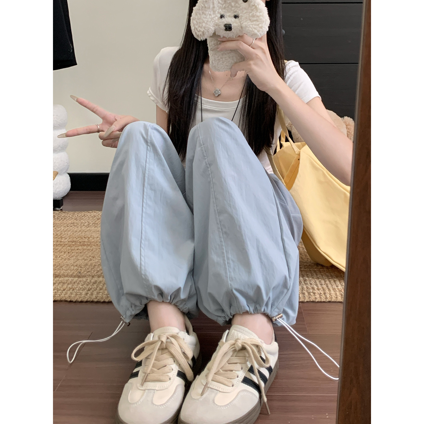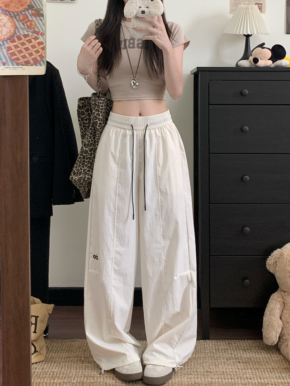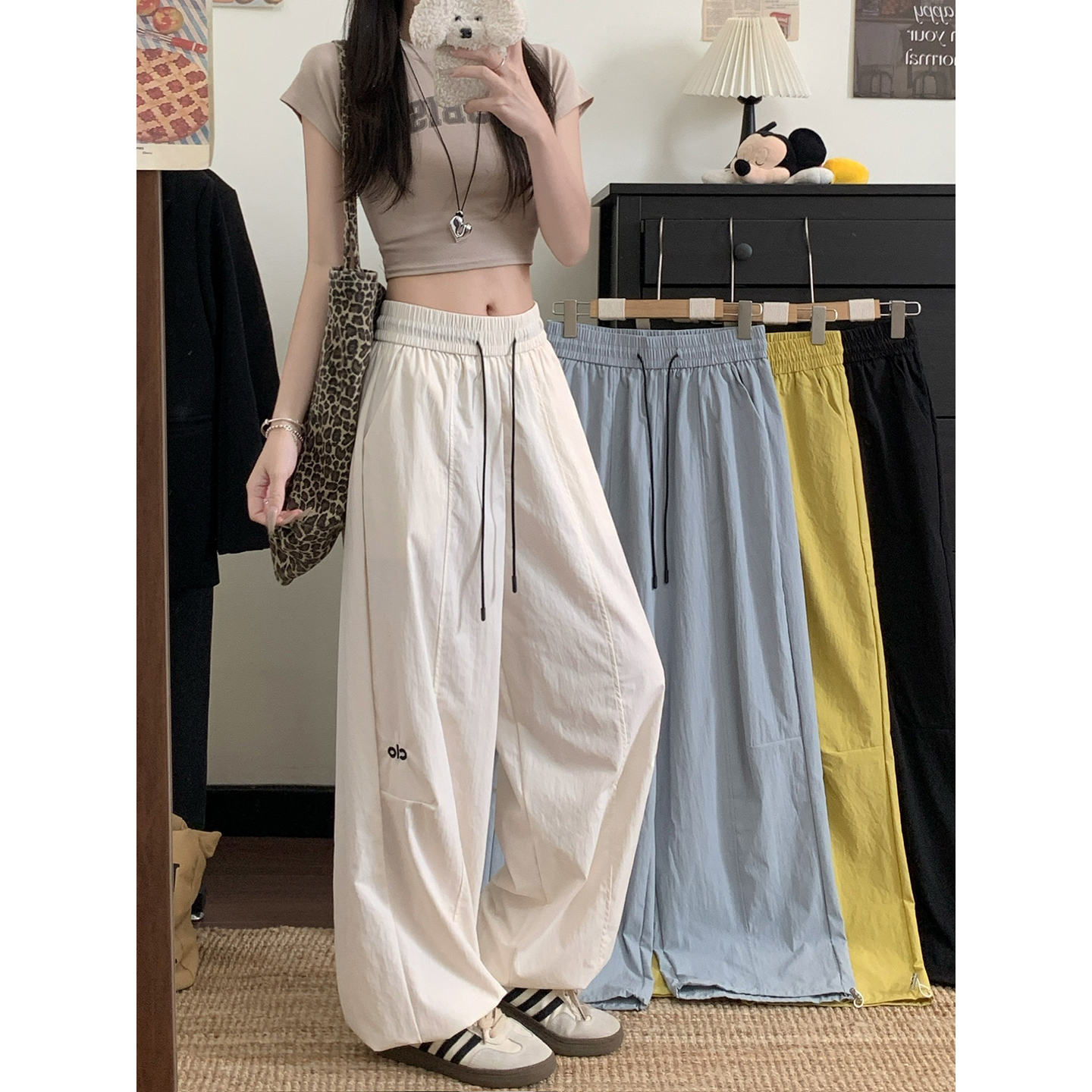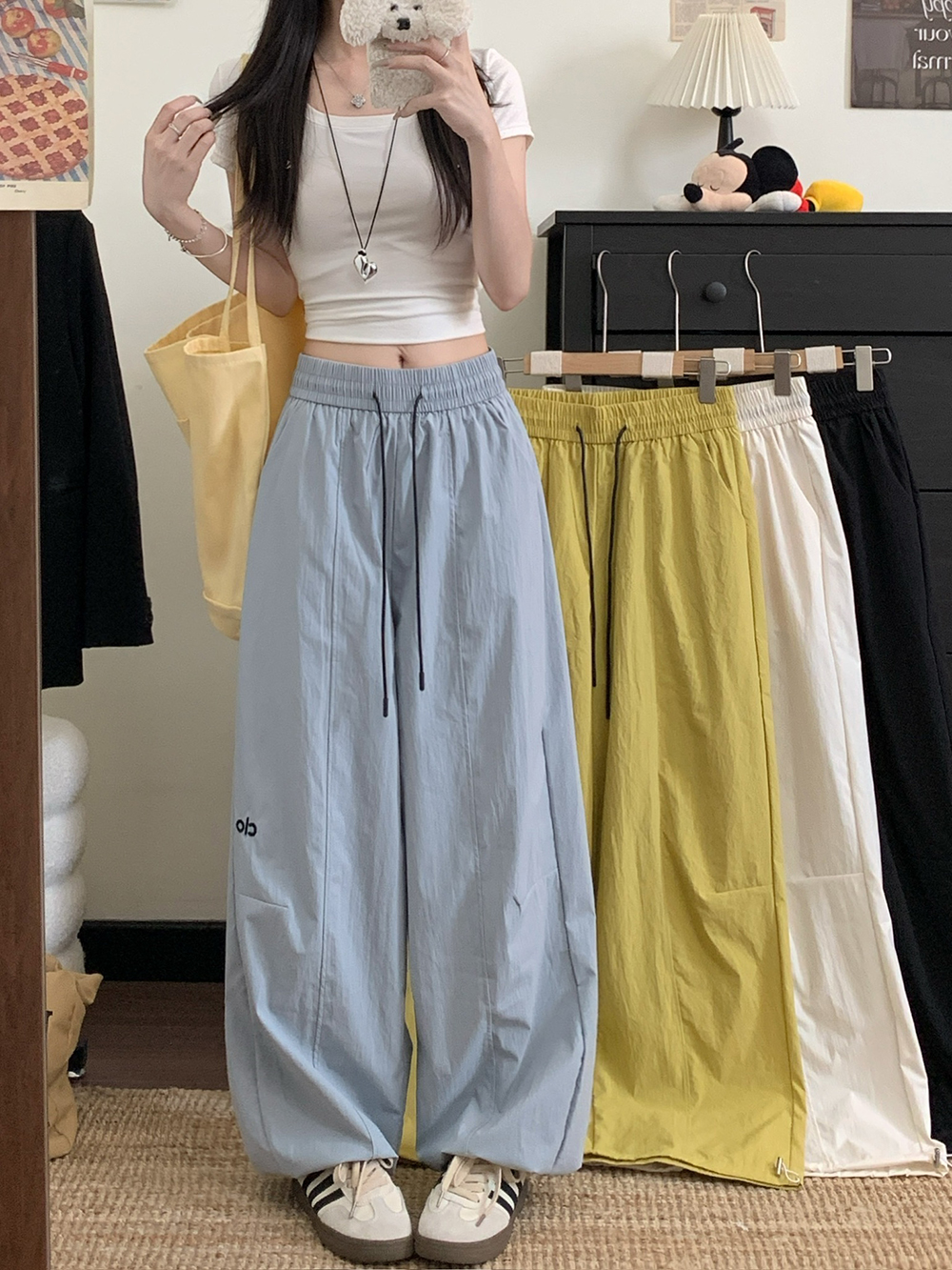 실사 2026 새로운 와이드 레그 팬츠 펌프 로프 레이스업 허리밴드 캐주얼 루즈핏 웨이 바지 여성