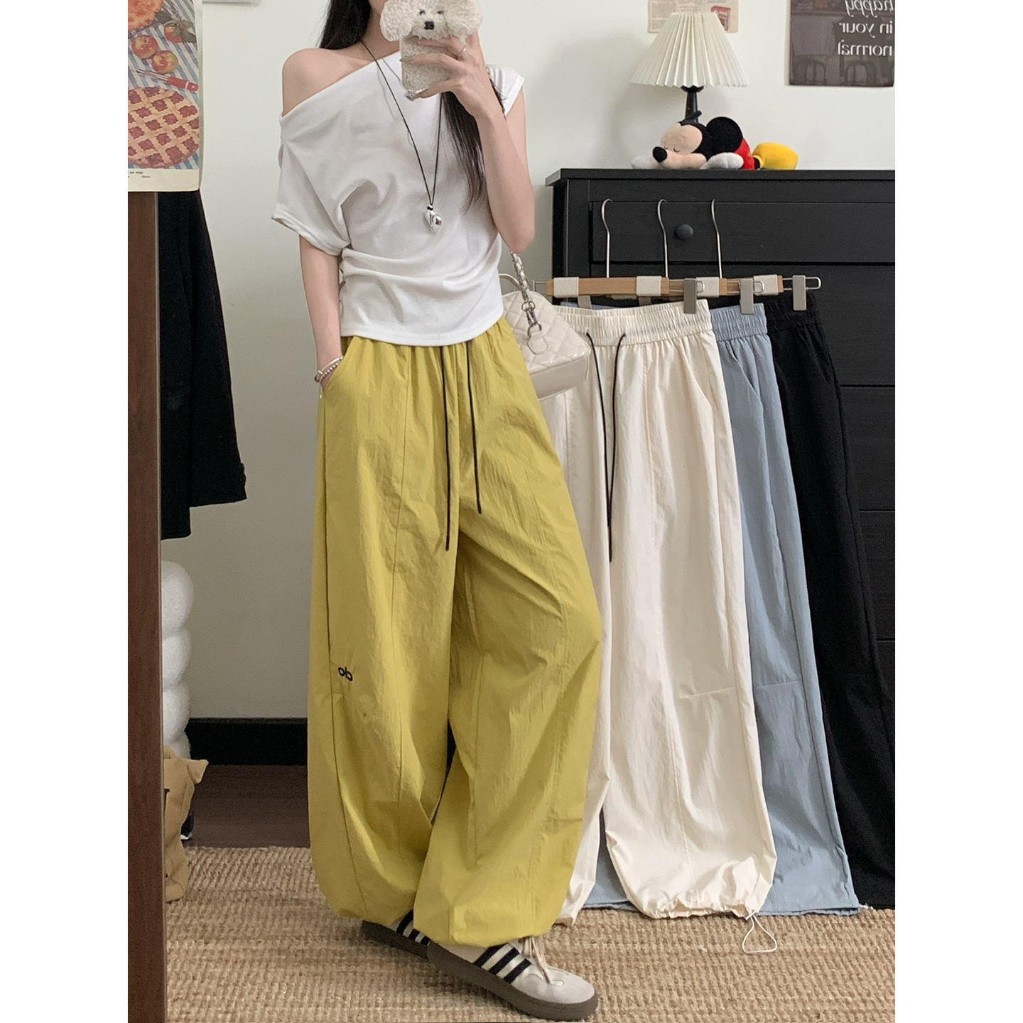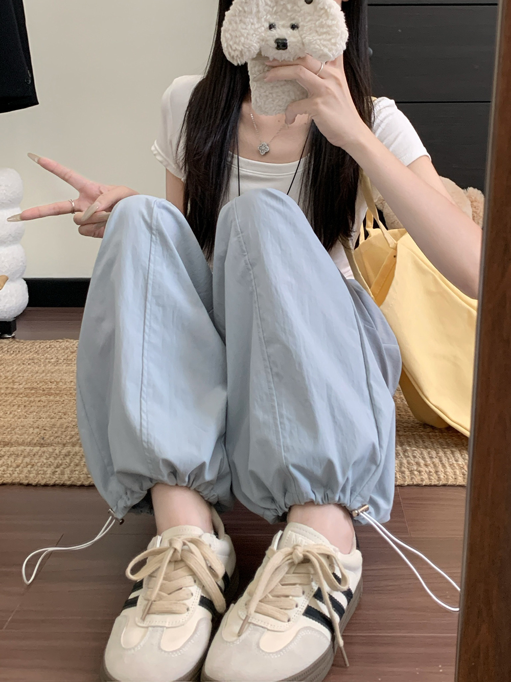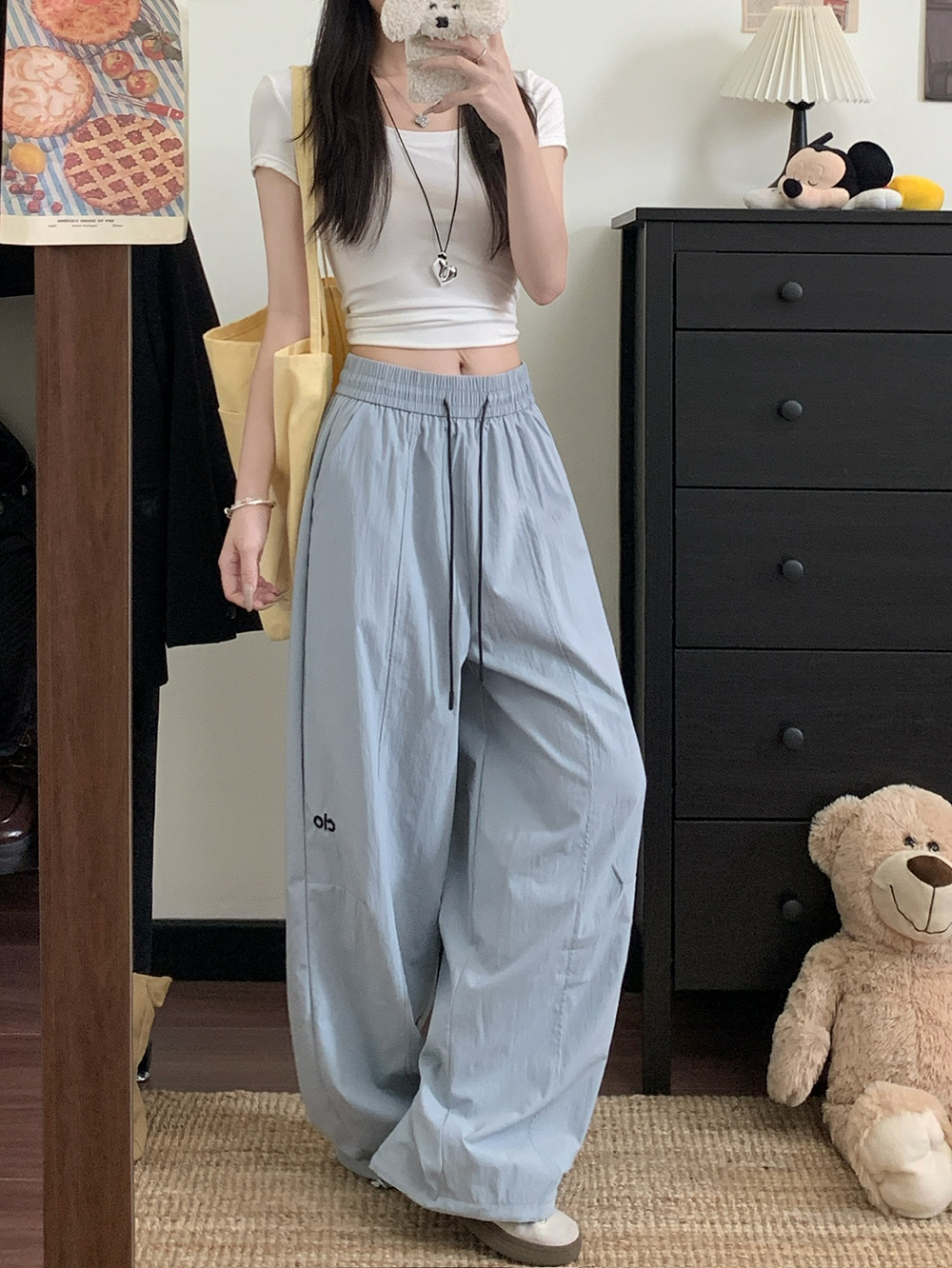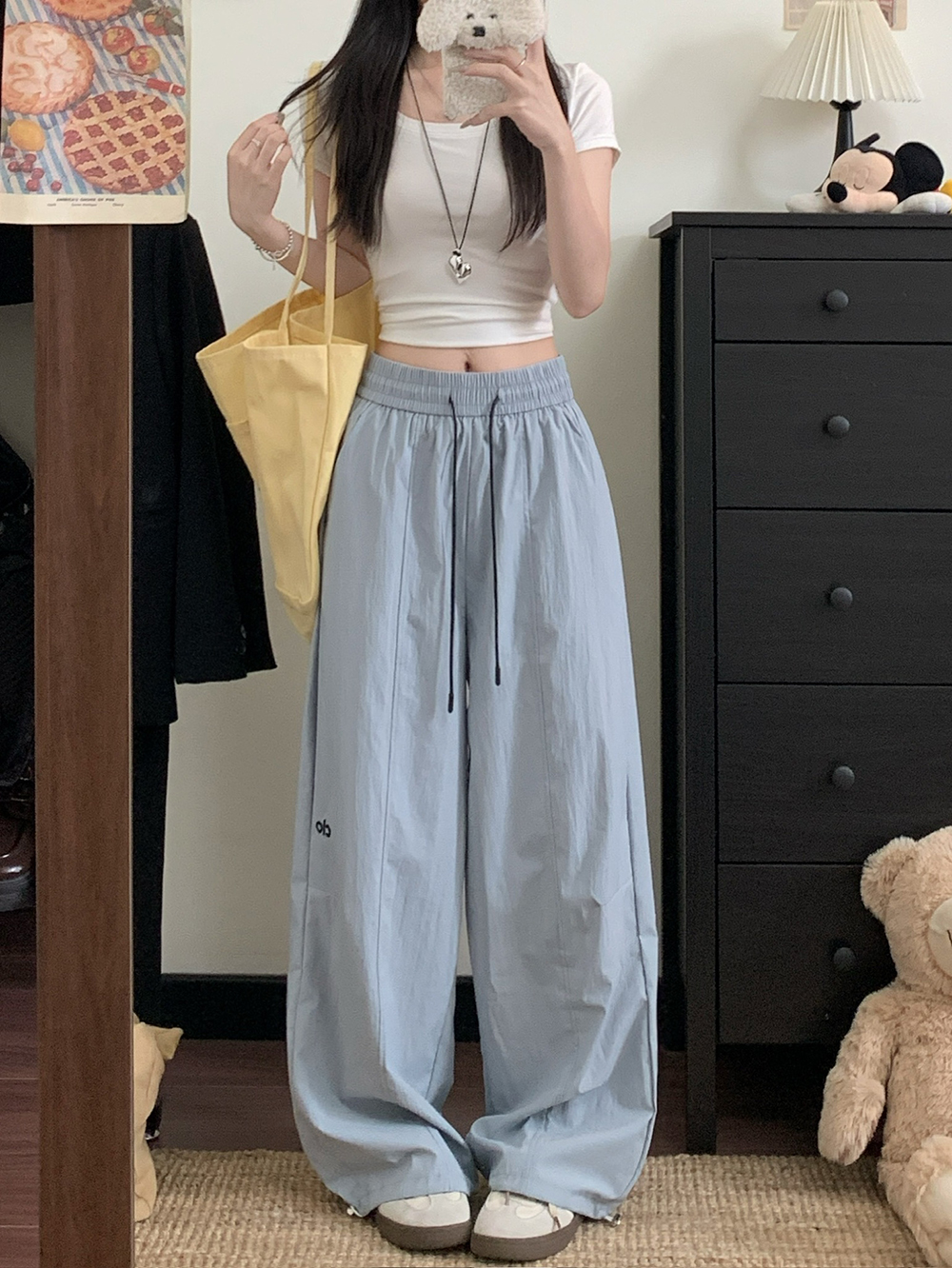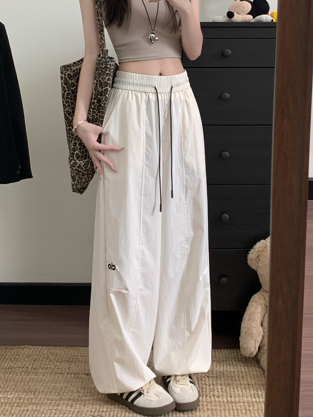 실사 2026 새로운 와이드 레그 팬츠 펌프 로프 레이스업 허리밴드 캐주얼 루즈핏 웨이 바지 여성