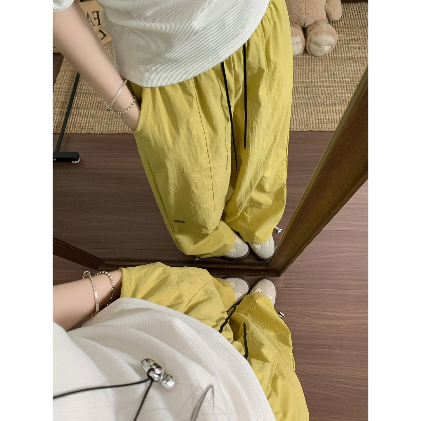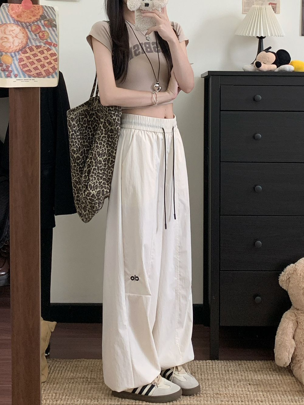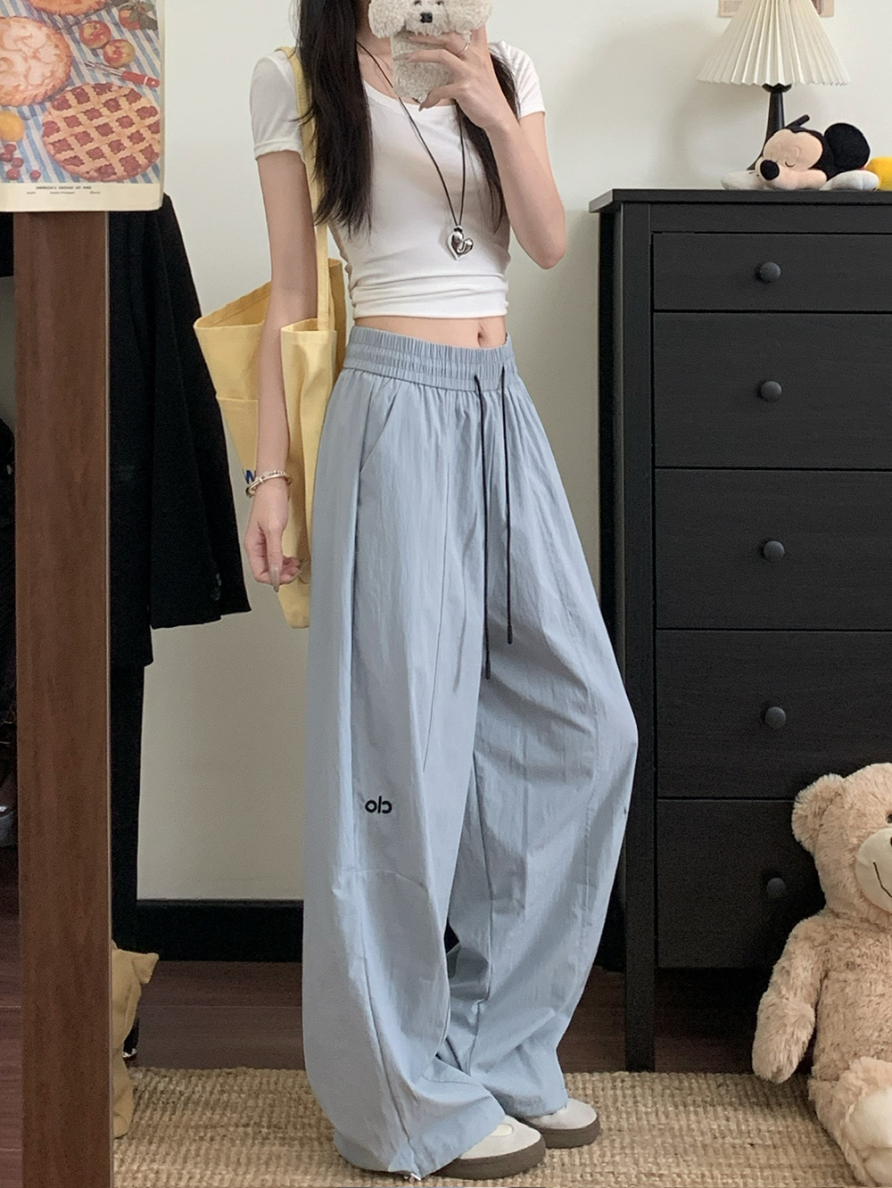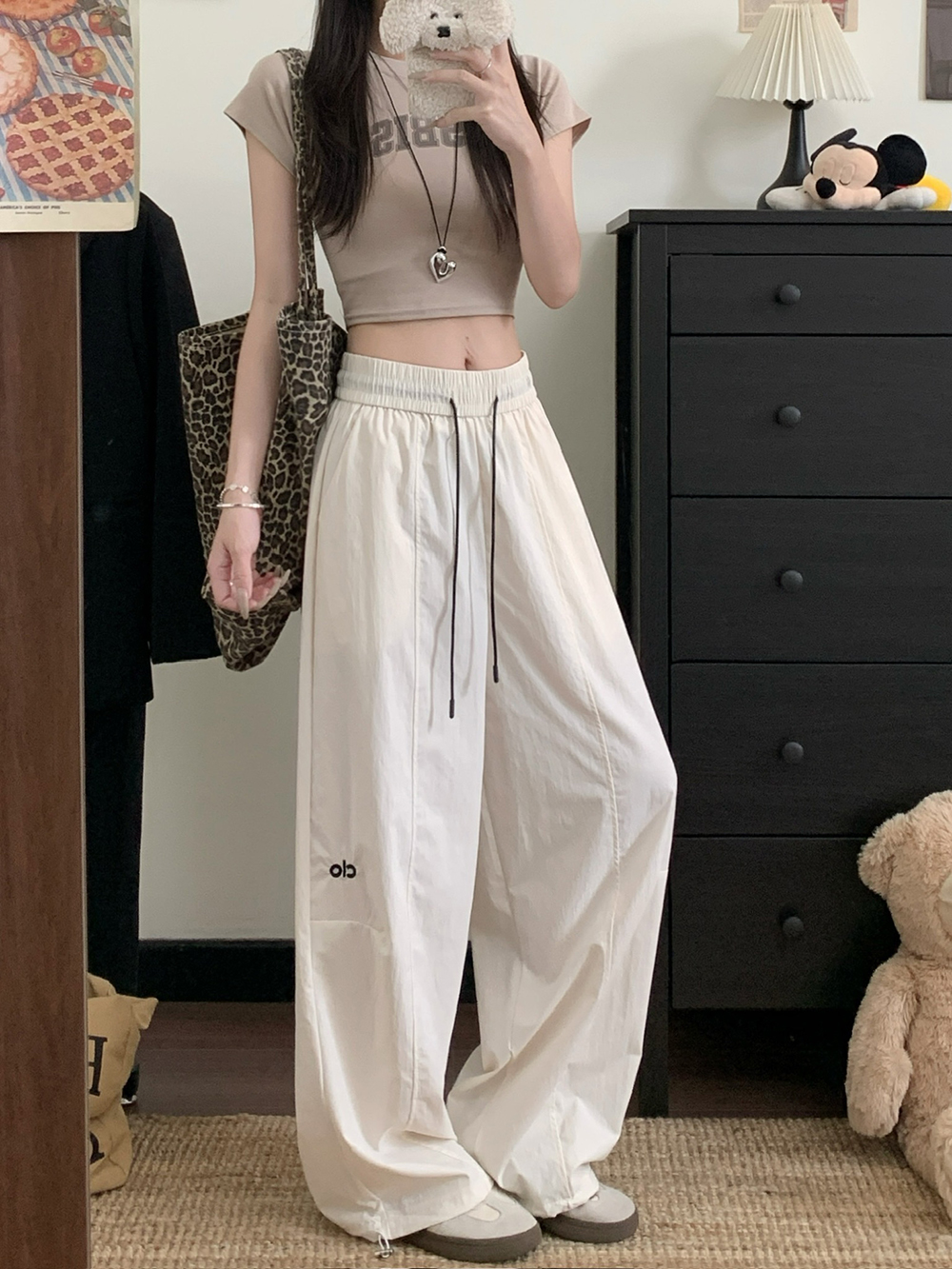 실사 2026 새로운 와이드 레그 팬츠 펌프 로프 레이스업 허리밴드 캐주얼 루즈핏 웨이 바지 여성