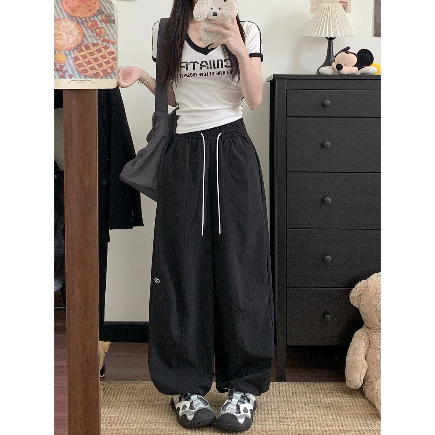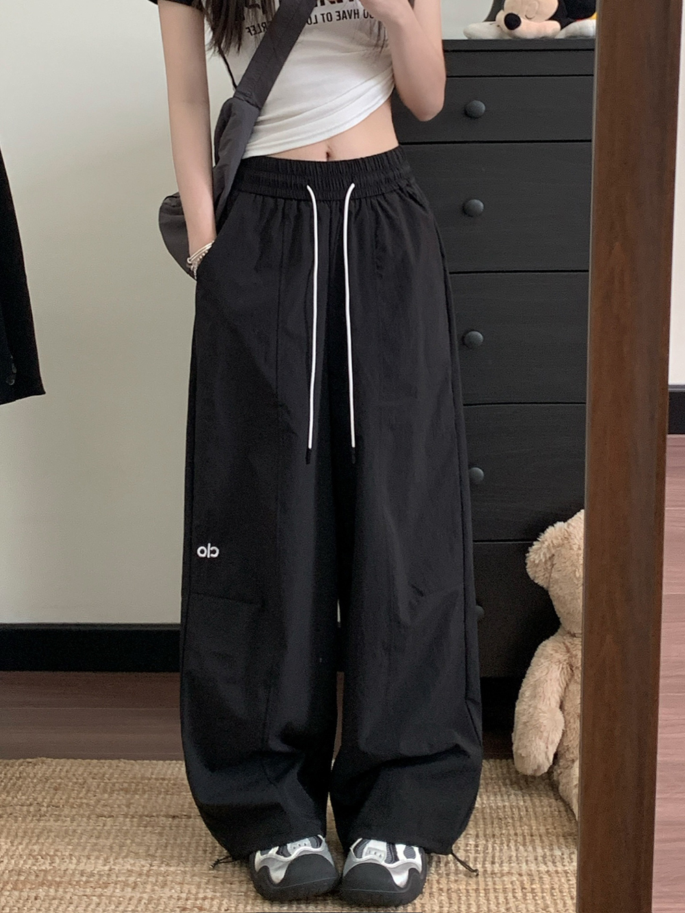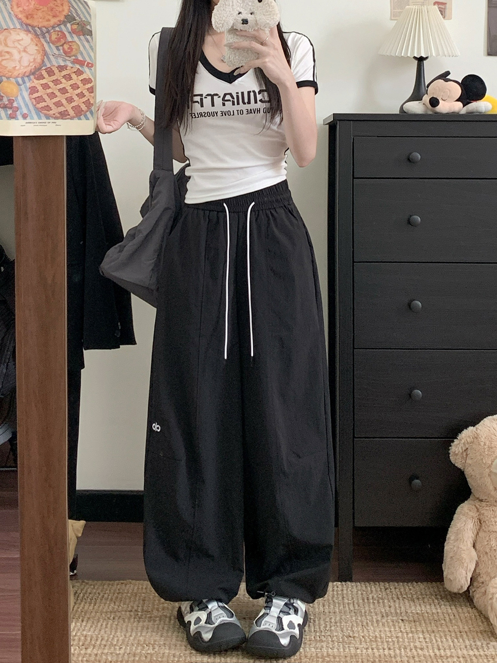 실사 2026 새로운 와이드 레깅스 바지 하이웨이스트 도루 센스 루즈핏 캐주얼 바닥 청소 개성 바지 경기 레이스 벨트