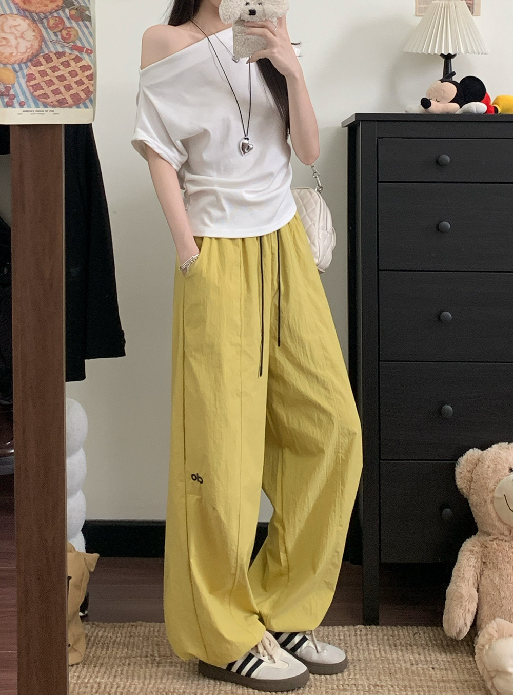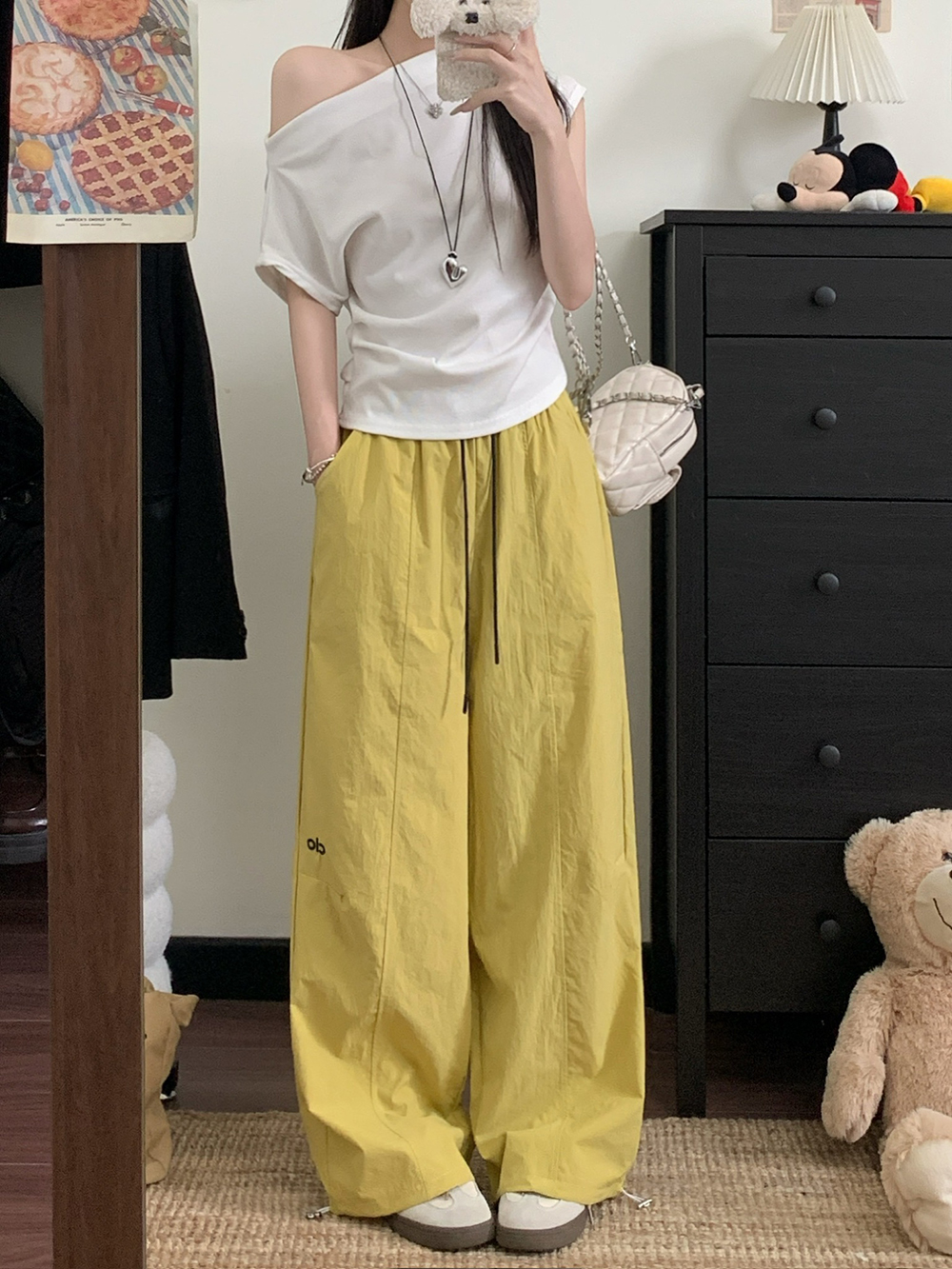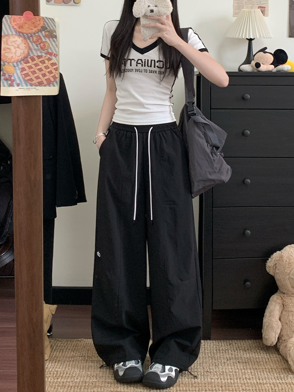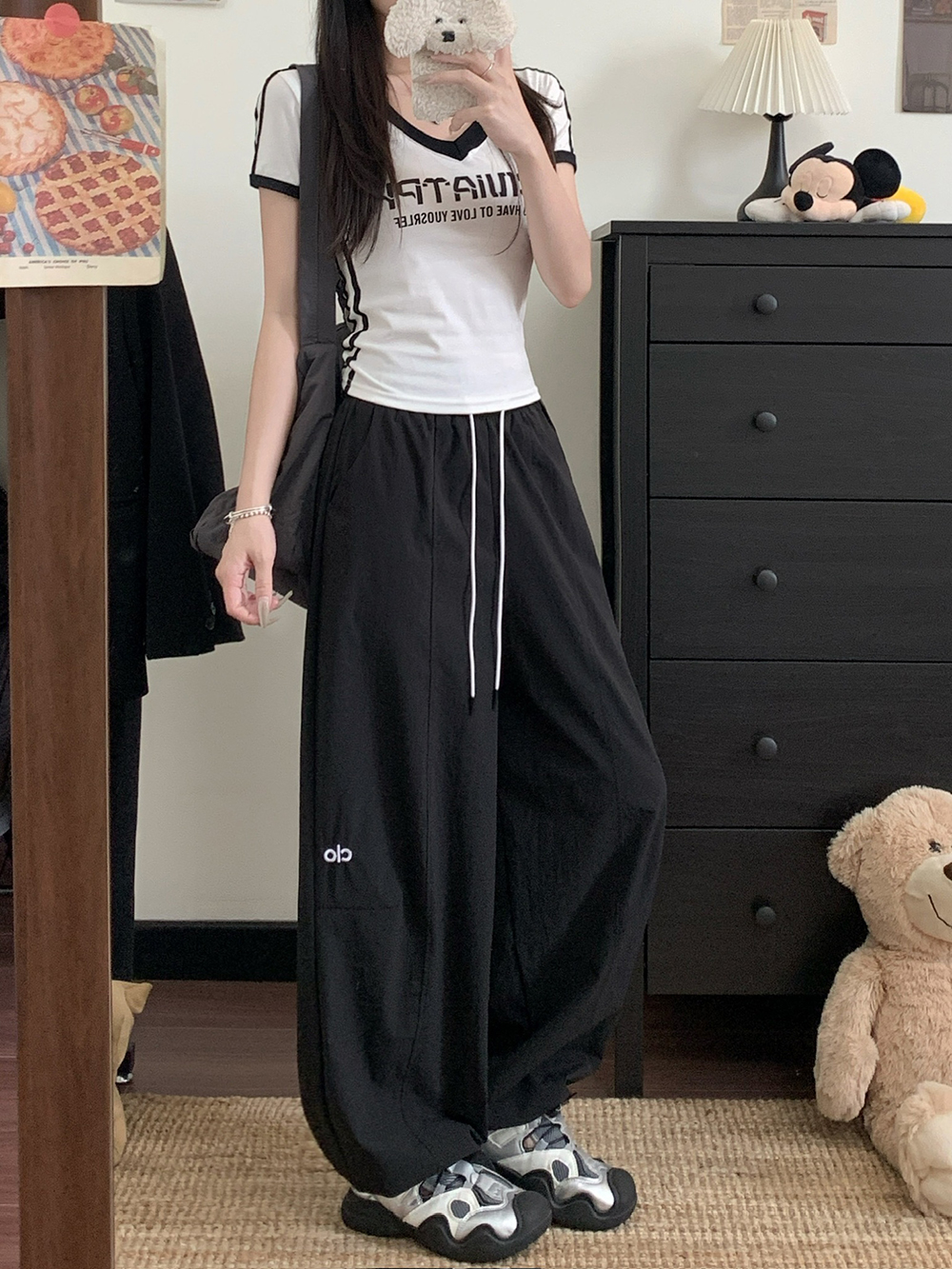 실사 2026 새로운 와이드 레깅스 바지 하이웨이스트 도루 센스 루즈핏 캐주얼 바닥 청소 개성 바지 경기 레이스 벨트