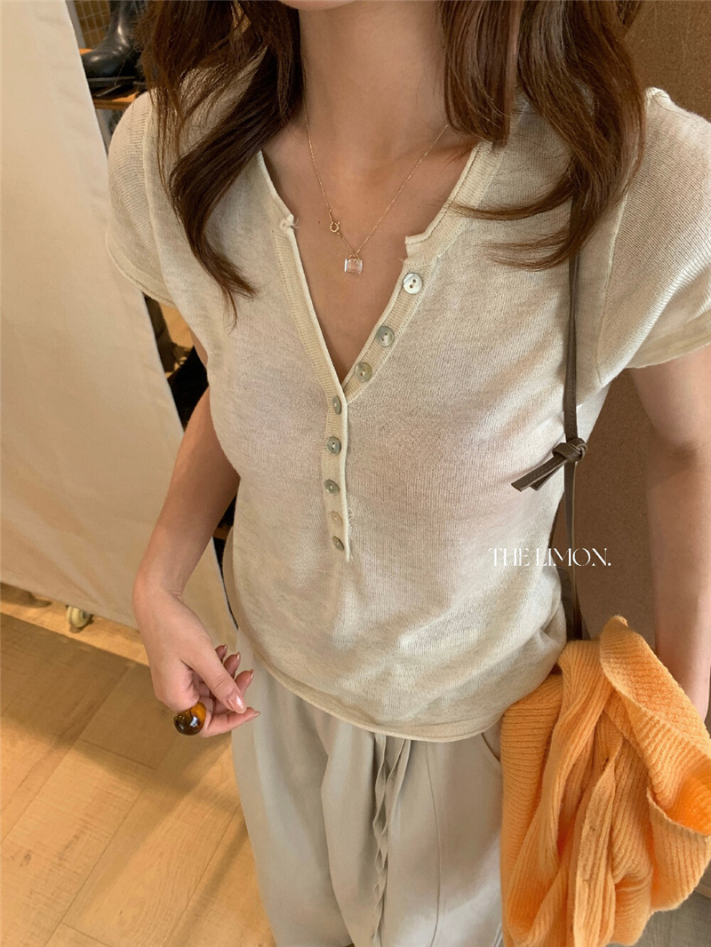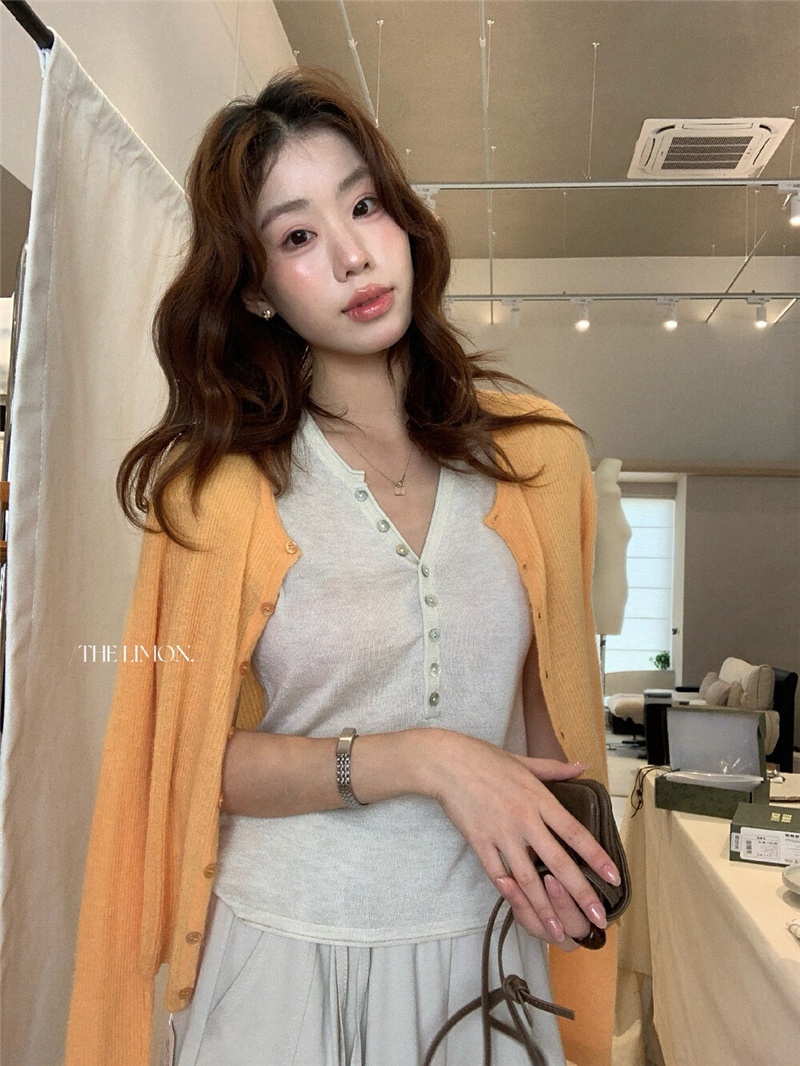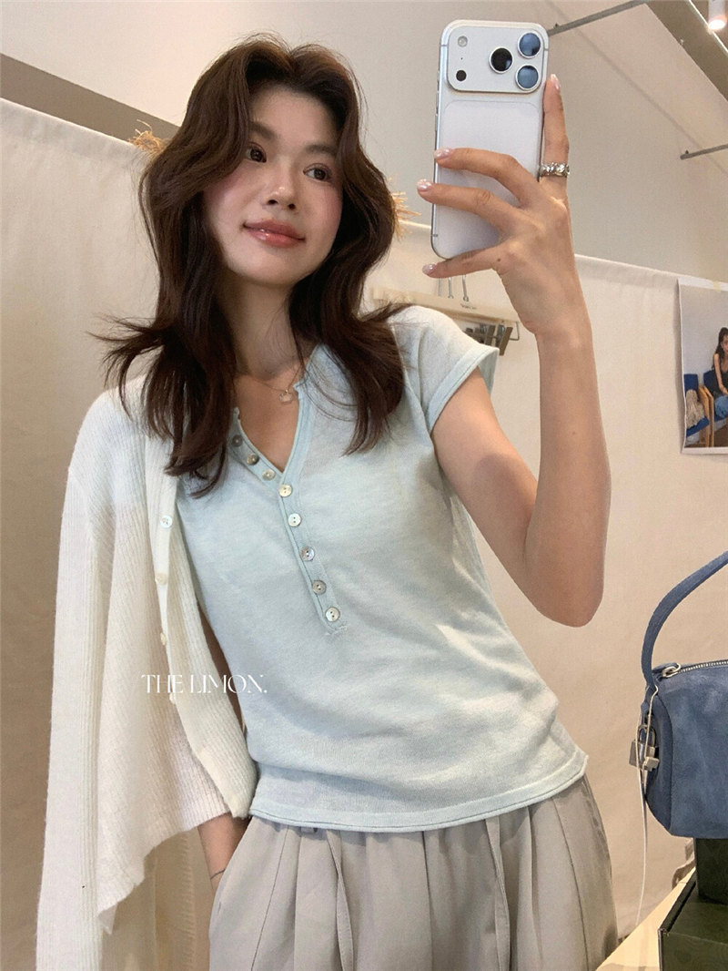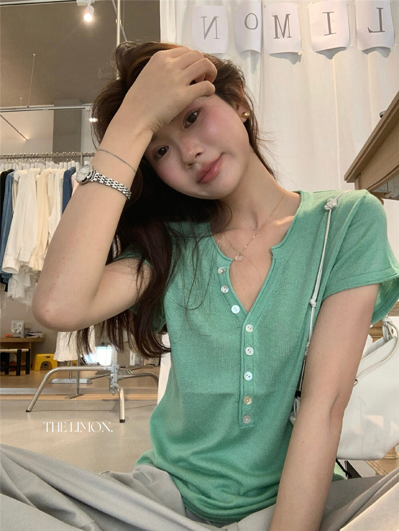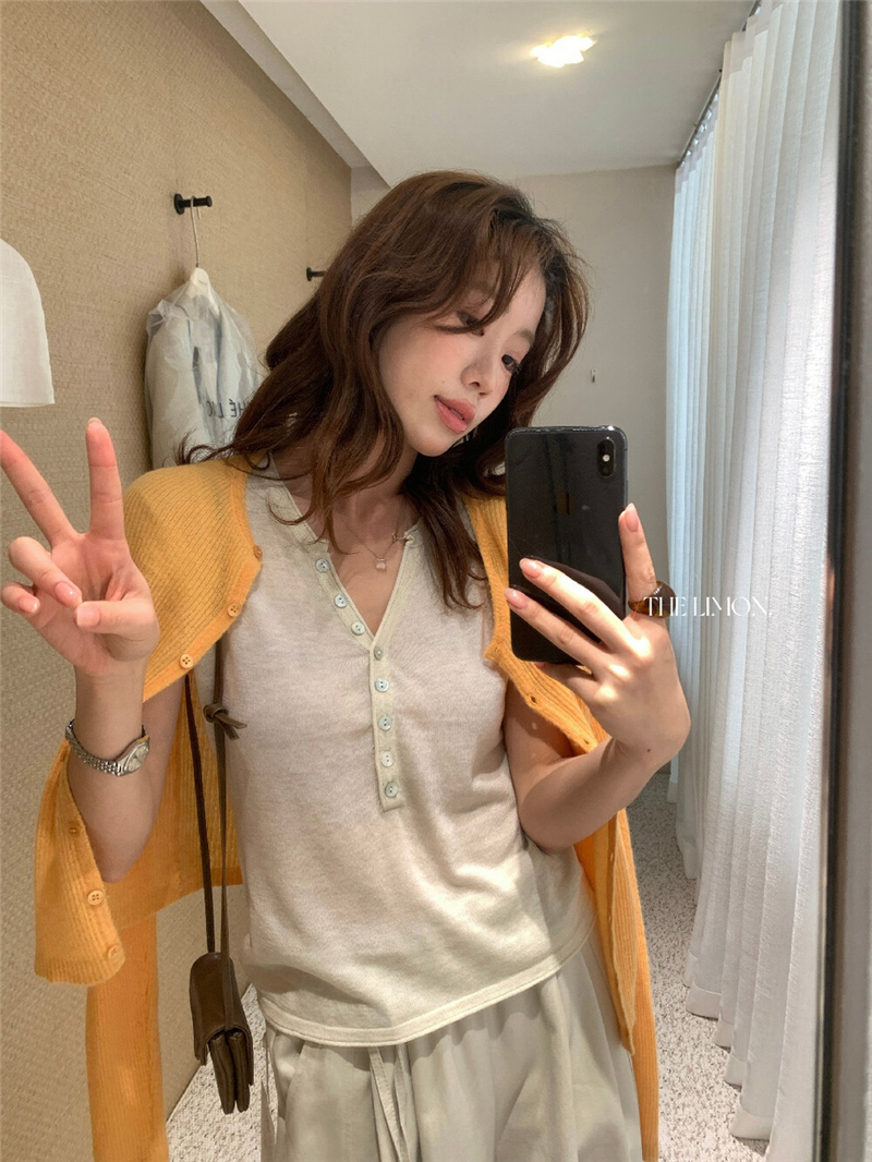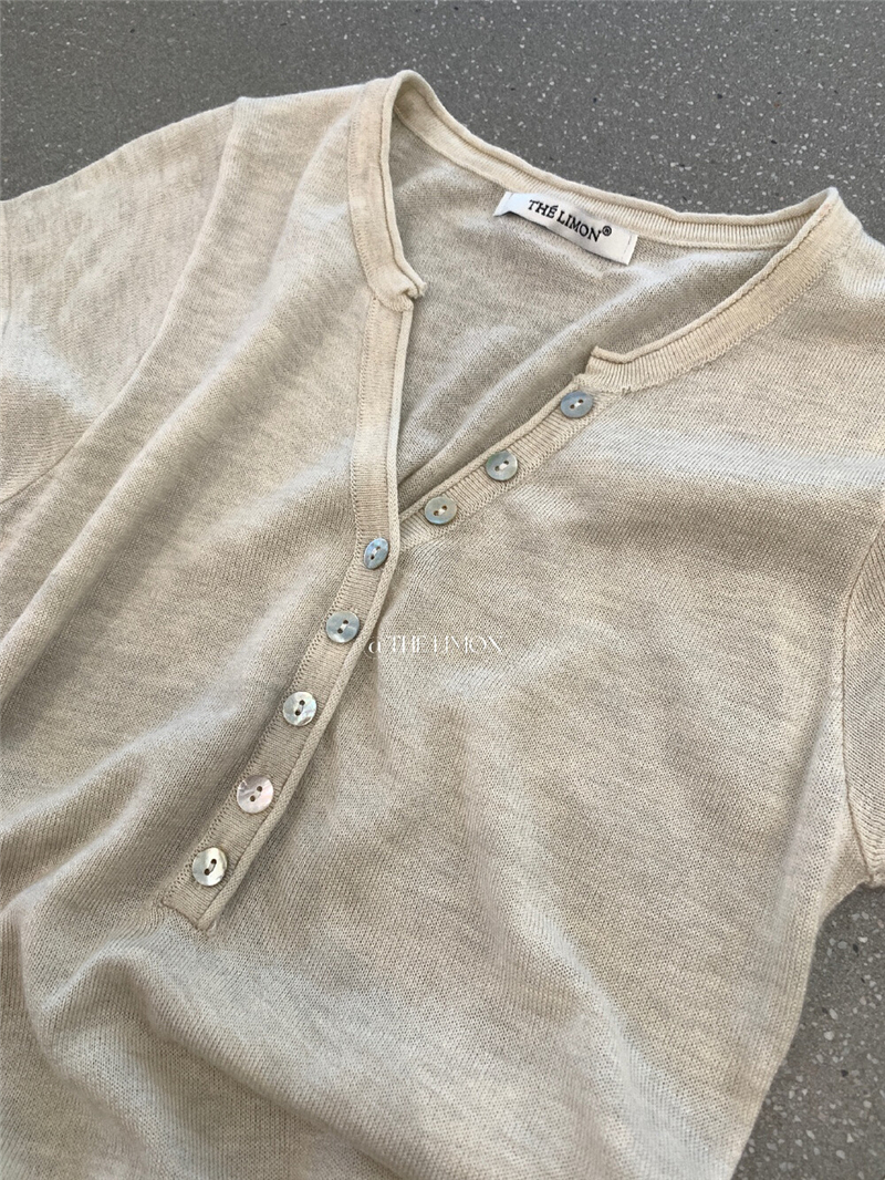 헨리 셔츠 레몬 녹차 반 개방 칼라 단추 긍정적 인 어깨 몸매 가꾸기 슬림해 보이는 니트 스웨터 다용도 디자인 센스 맨위